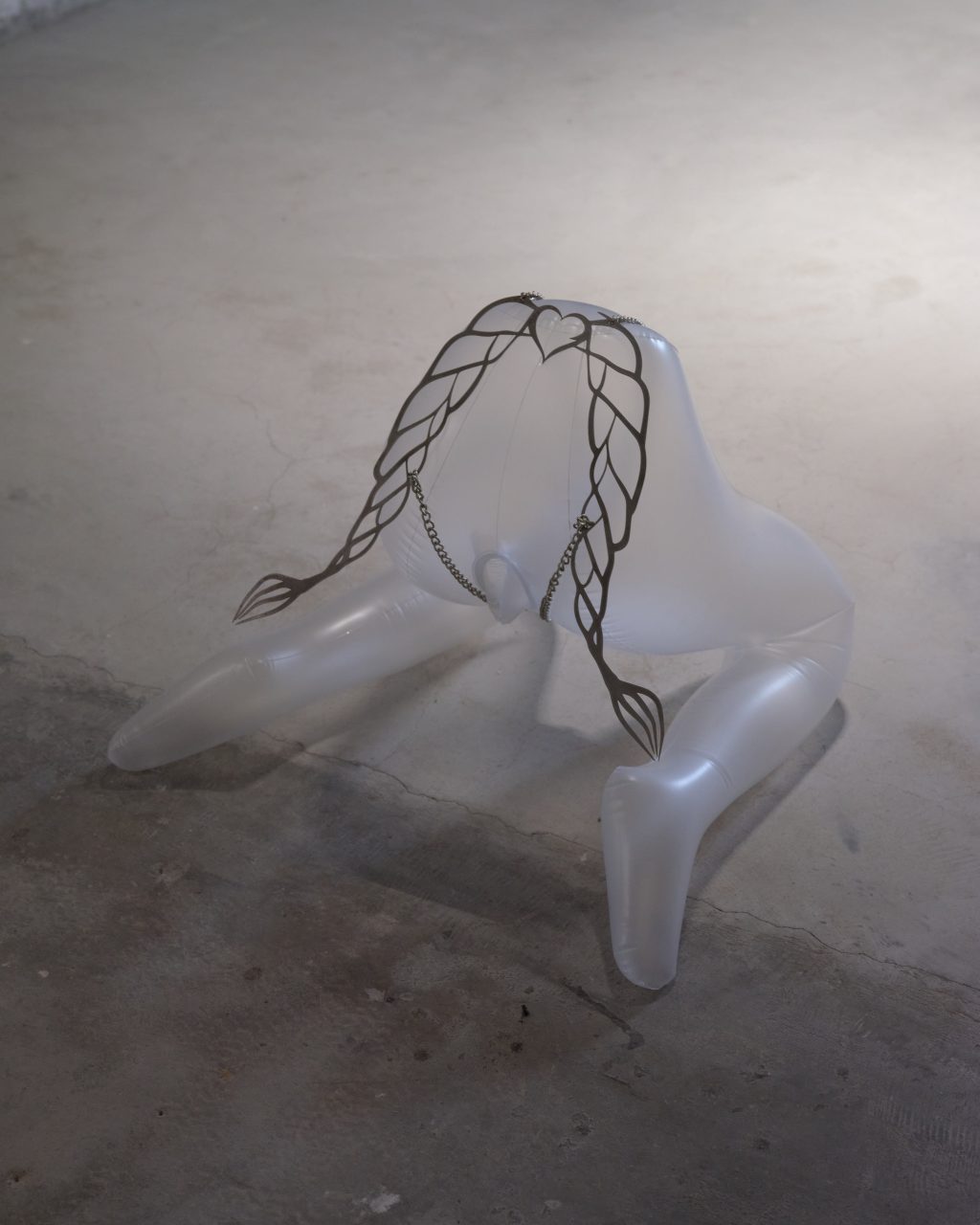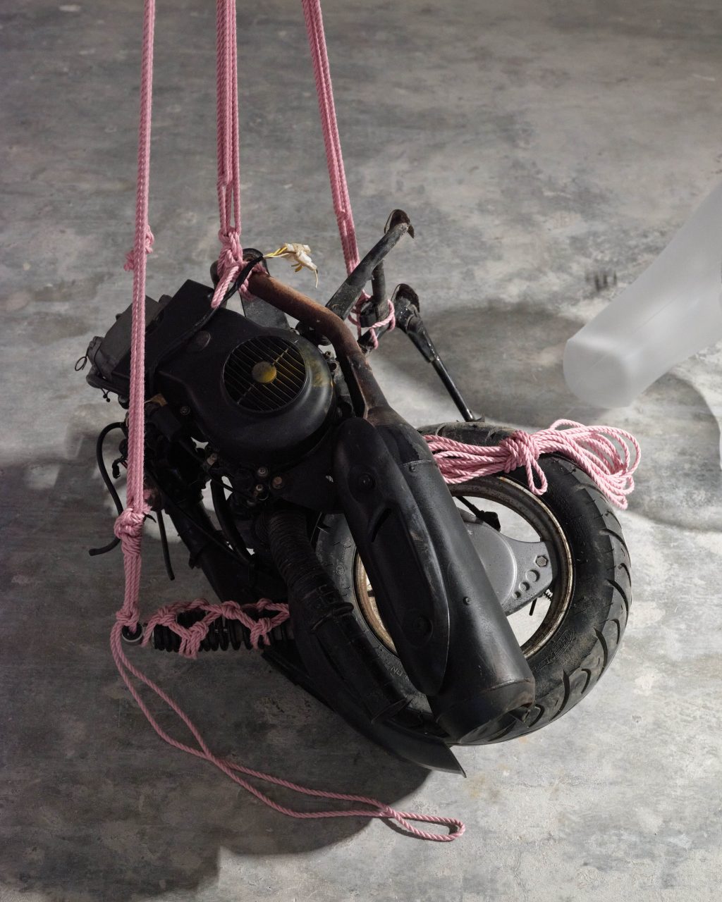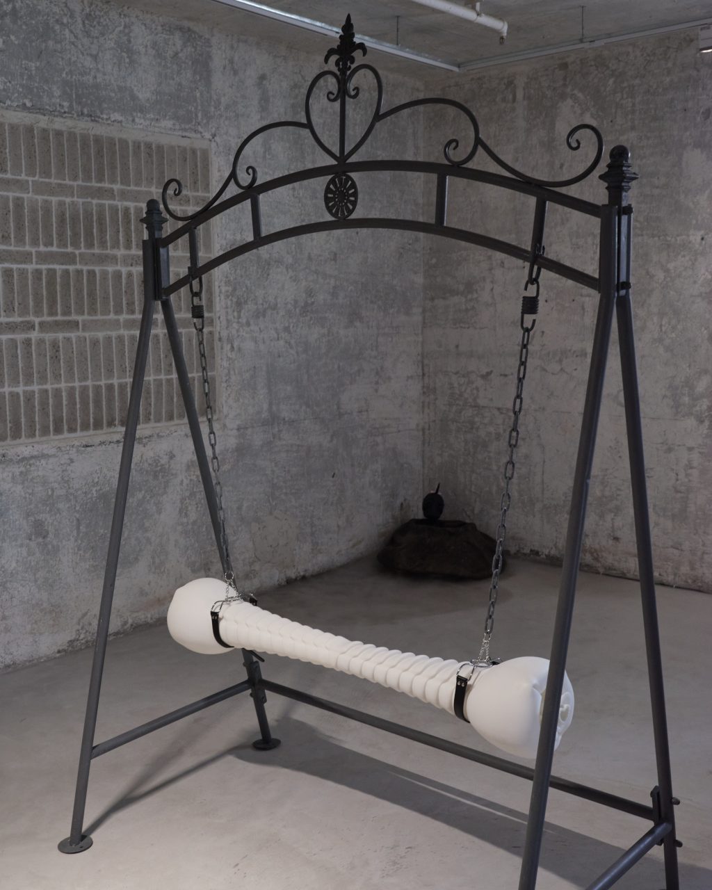 At “Village Porn”, all judgement is left at the door. Kinky fetishes and erotic fantasies are not taboo. “They are embraced, ritualised and turned into a form of “porn” (artworks) that connect us all on a spiritual level”, Joseph and Cas explain. Some sculptures have been treated with the same chemicals found in poppers, a drug commonly used in the queer community for sexual enhancement, to highlight the transformative nature of the drug. Elsewhere, in the “garden”, sits an ornately decorated love swing, while the centrepiece installation “Machinal Dysphoria”, features an industrial-like motorcycle torso constrained by Shibari rope, a Japanese bondage tool. Created with artist Aka Chow, this piece of art intends to confront norms about flesh and erotica, leaning into AI and cyborgian co-existence.