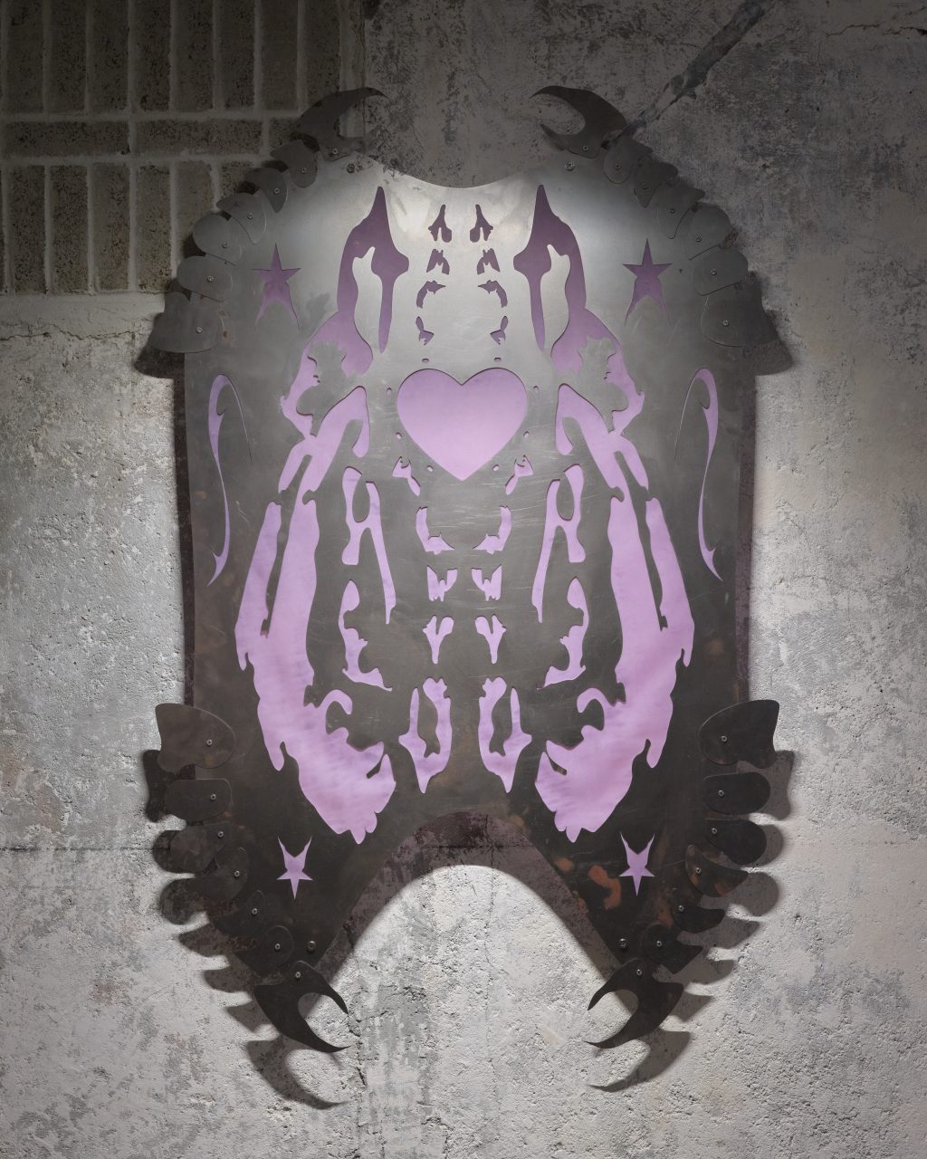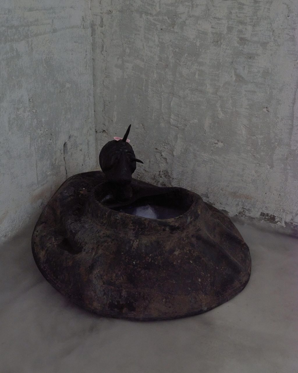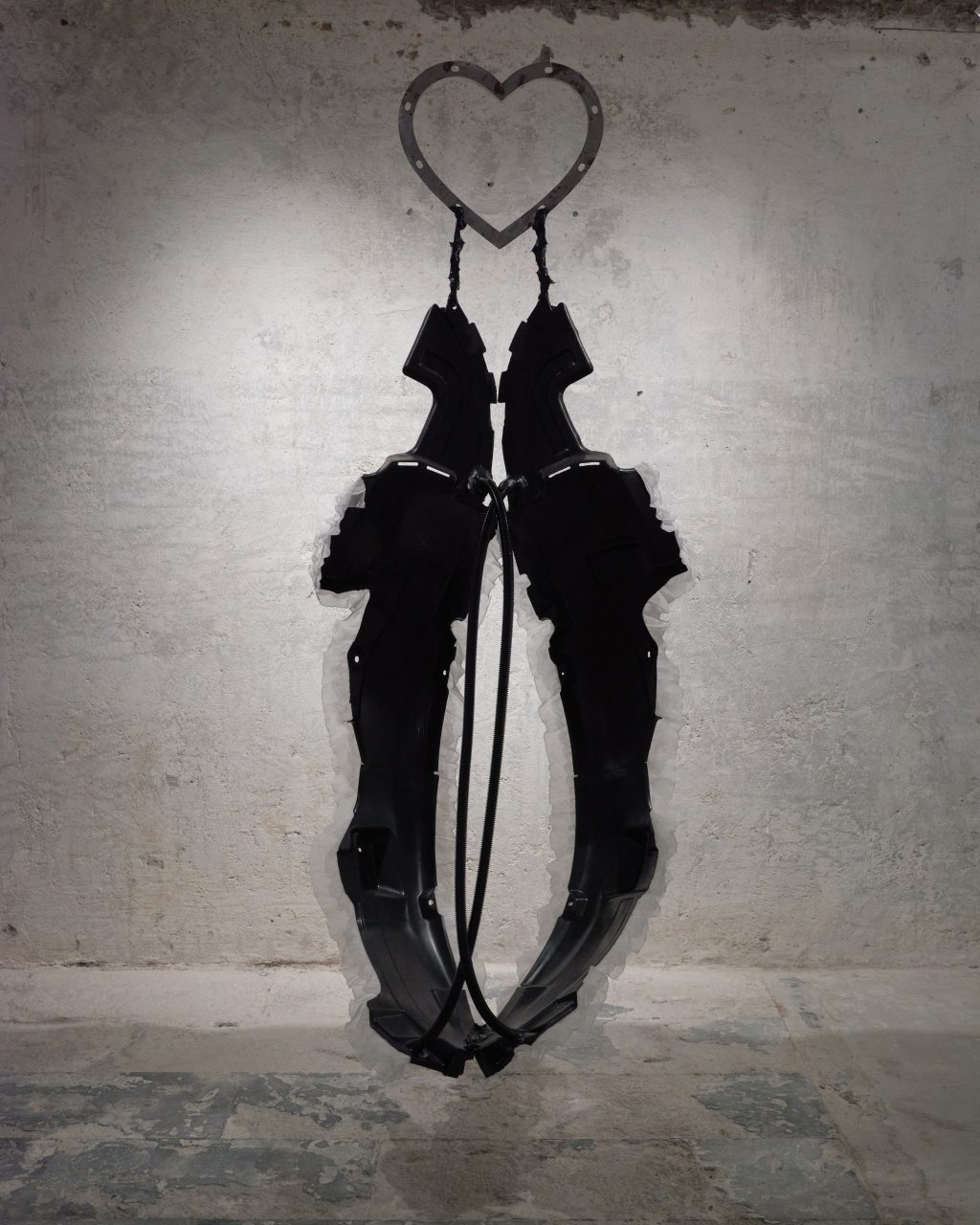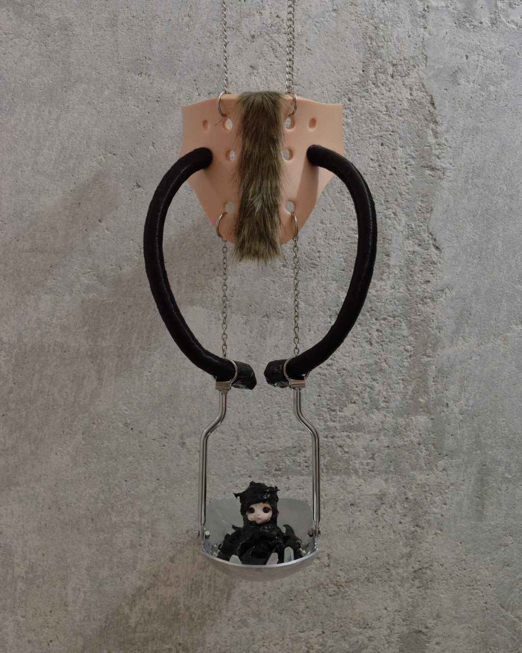 At “Village Porn”, all judgement is left at the door. Kinky fetishes and erotic fantasies are not taboo. “They are embraced, ritualised and turned into a form of “porn” (artworks) that connect us all on a spiritual level”, Joseph and Cas explain. Some sculptures have been treated with the same chemicals found in poppers, a drug commonly used in the queer community for sexual enhancement, to highlight the transformative nature of the drug. Elsewhere, in the “garden”, sits an ornately decorated love swing, while the centrepiece installation “Machinal Dysphoria”, features an industrial-like motorcycle torso constrained by Shibari rope, a Japanese bondage tool. Created with artist Aka Chow, this piece of art intends to confront norms about flesh and erotica, leaning into AI and cyborgian co-existence.