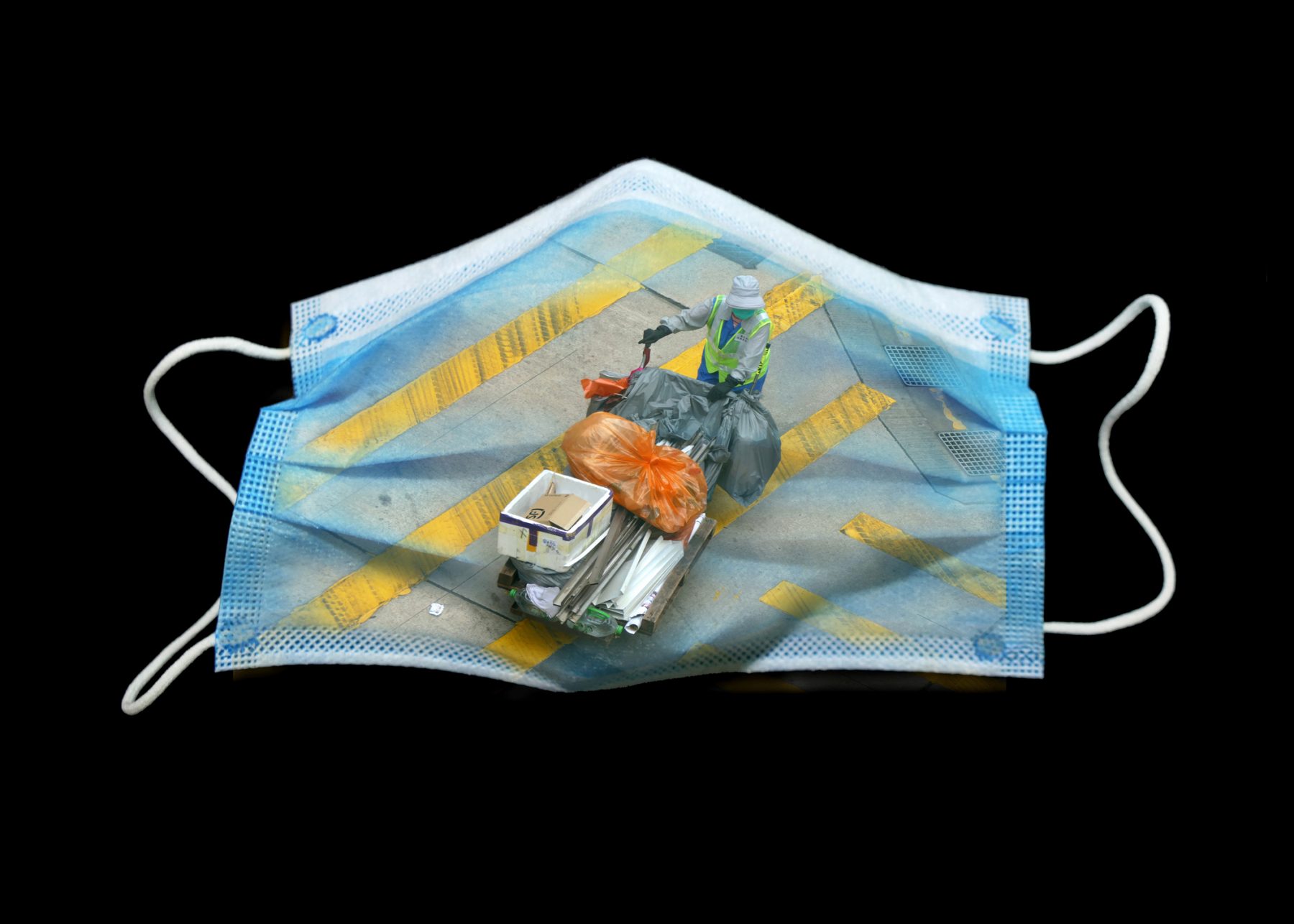 “The Mask series is inspired by paintings from Picasso’s Blue Period. From around 1901 to 1904, the Spanish maestro made numerous melancholic illustrations of insignificance, predominantly with various shades of blue. However, I would like to show my respect and support to these unsung heroes who work incessantly to facilitate our lives despite the widespread of the virus in public areas. For instance, I layered a photo of a cleaner on top of the surgical mask, prompting viewers to imagine how unpleasant it is for them to work under the scorching sun with a mask on. I think that we rarely notice the effort these people are putting in each day and that they are risking their lives to make Hong Kong a better place. Moreover, a friend once said to me, “No matter how disastrous the current situation is, it will end eventually.” Other than documenting the changes taking place in this city, I am hoping that my work reminds viewers that we are all in this together and will instil hope, encouraging them to stay strong.”