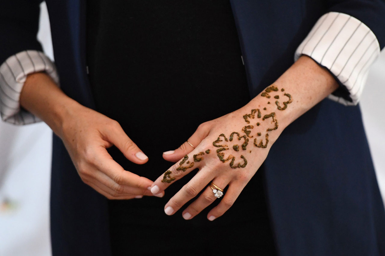 Prince Harry and Meghan Markle’s three-day trip to Morocco is their final royal tour before becoming parents, and the Duchess of Sussex celebrated in traditional Moroccan fashion. Dressed down in an Alice + Olivia navy blazer, black T-shirt and skinny jeans (a contrast to the custom-made Valentino dress worn the night before), Meghan marked seven months of pregnancy with a Henna tattoo of flowers that extended from her left index finder to her wrist.