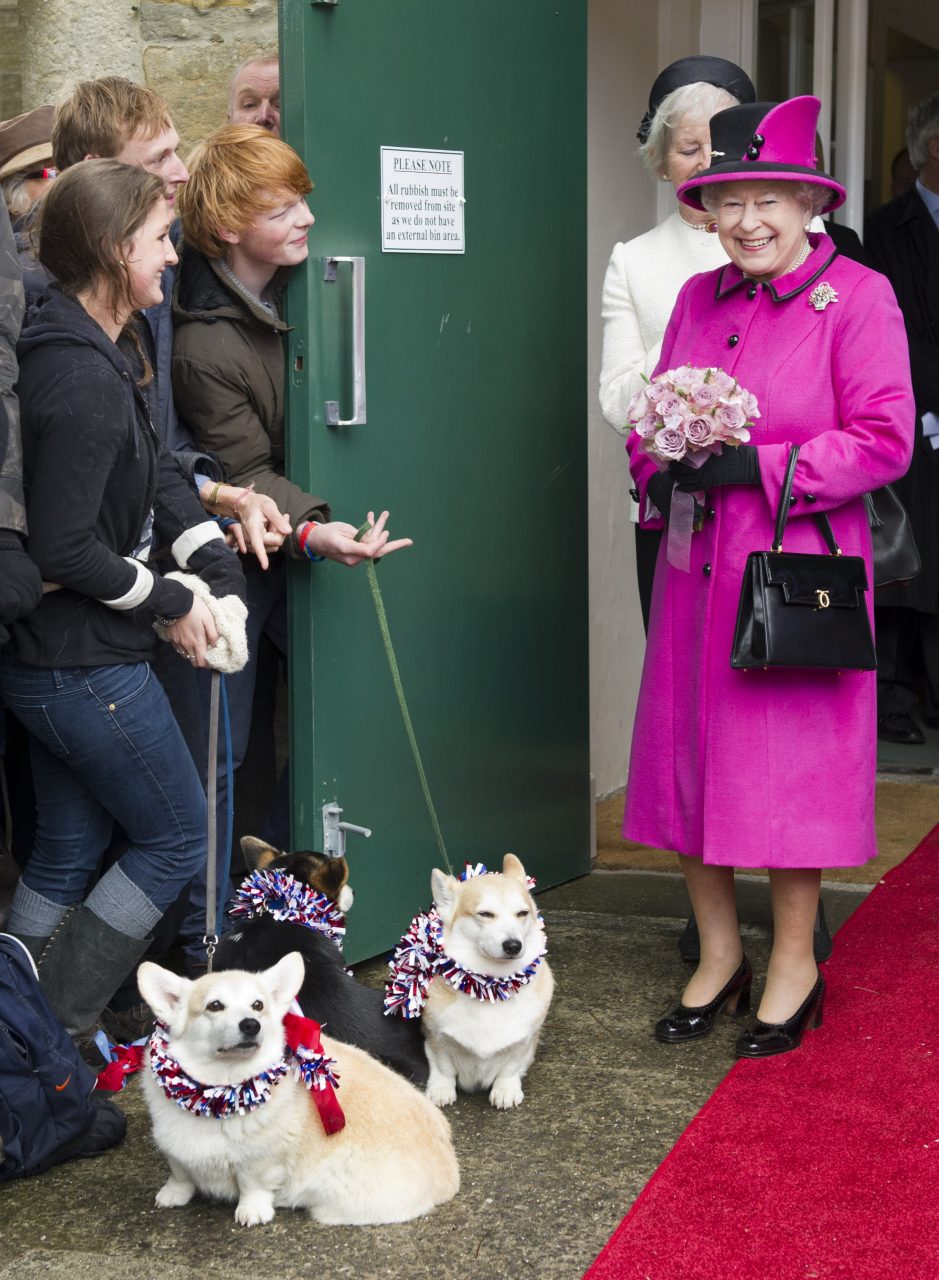 Meeting crowds in Dorset in 2012, she combined a striking magenta coat with black lapels and buttons. Even the corgis are dressed up.