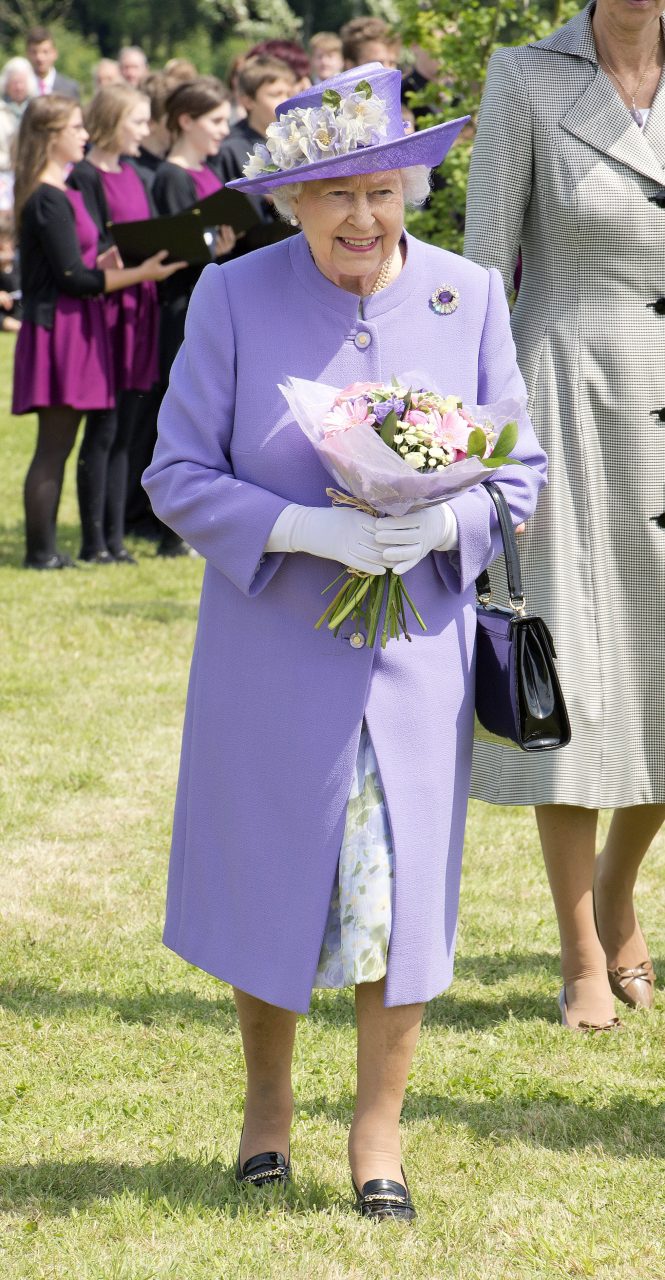 At one of her stops on her 2012 Diamond Jubilee tour, the Queen went for her trusted lavender floral prints, accompanied by a matching coat and hat.