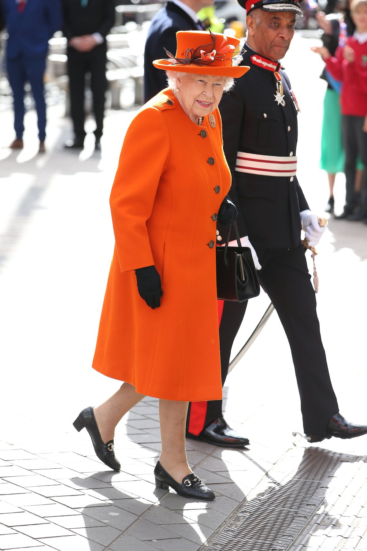 In 2019, she paired a black evening bag, kitten-heel loafers and leather gloves with a vibrant electric-orange coat for a visit to London’s Science Museum.