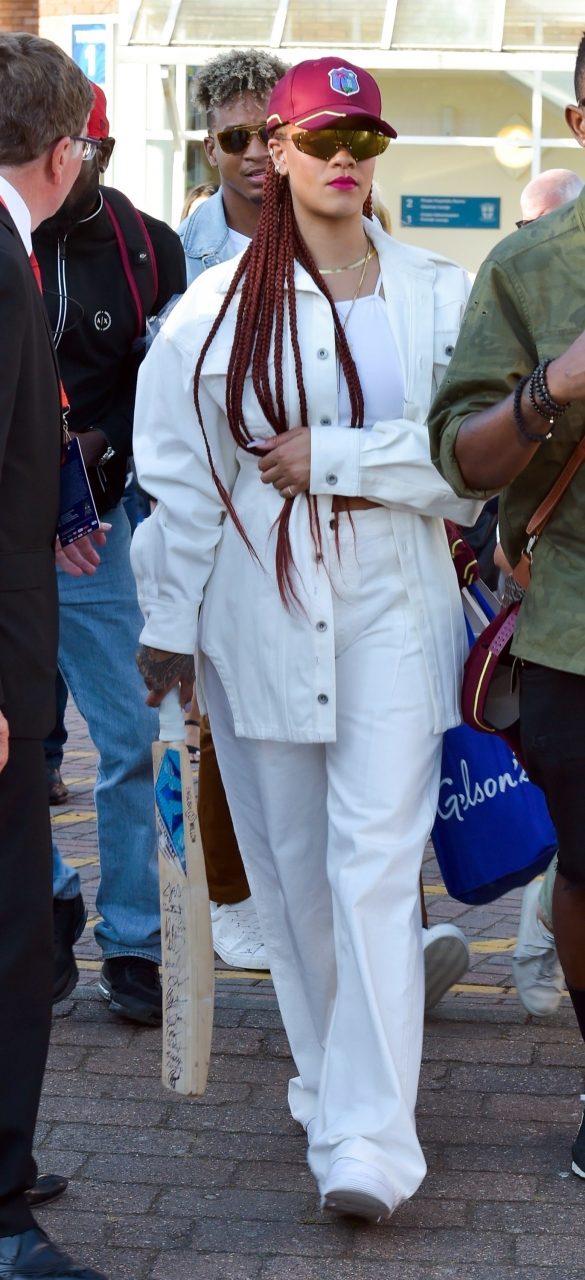 Rihanna takes sports seriously. She makes room in her busy schedule for courtside appearances at Lakers games and soccer matches between Paris Saint-Germain and Olympique de Marseille. Given her appreciation for athletics, it was unsurprising to see her at today’s ICC Cricket World Cup cheering on the West Indies team and bringing a high fashion flair to her private box. Her entrance at Emirates Riverside in an official West Indies team cap made it clear exactly who she was rooting for, though it was her Fenty ensemble that had people talking.