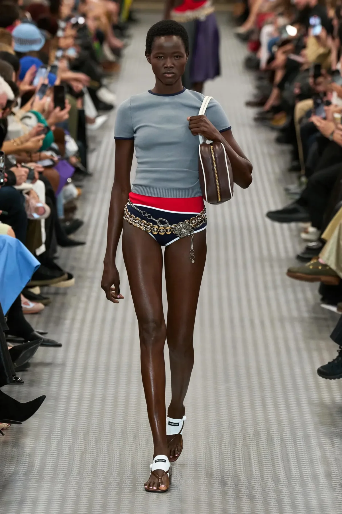 Swimwear isn’t a common appearance on the runways, but for spring/summer 2025 Miuccia Prada proposed new ways of wearing bikinis beyond the beach. Mrs Prada provided the ultimate holiday dressing inspiration via graphic piped bikinis worn beneath semi-sheer floral dresses and sporty briefs paired with cap-sleeved knitted tops, chain belts and thong-toe sandals.