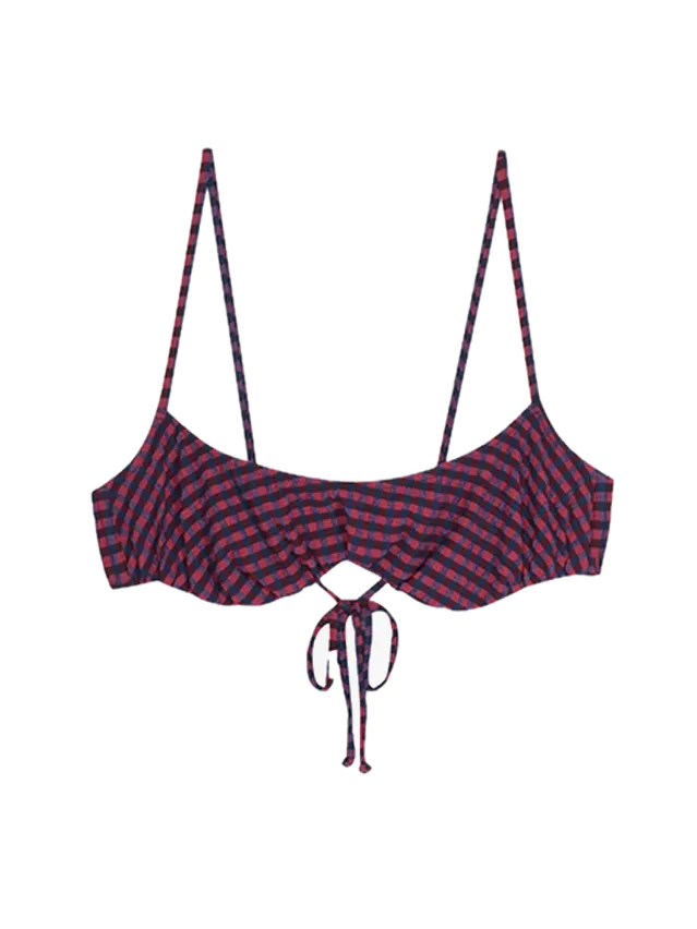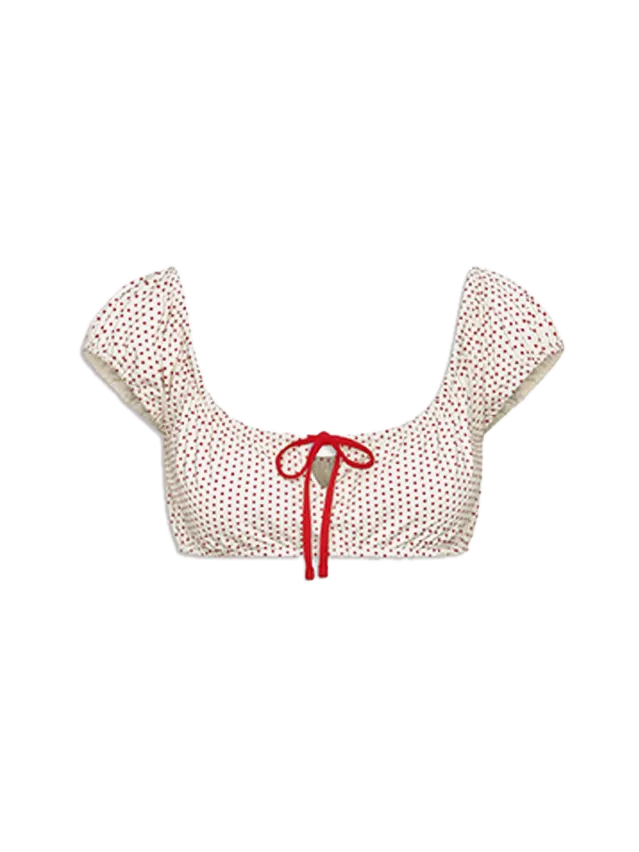 On a more saccharine (rather than siren) note, Bella Hadid’s collaboration with Frankies Bikinis, a prime supplier of Cali swim goods, featured a capped-sleeved, polka-dot bikini top that tapped into the current obsession with whimsical (see also: nightie dresses and granny shoes). The capsule wasn’t an exclusively cutesy vibe, however, as there was a touch of cowgirl attitude thrown in for good measure, via halter-neck bikinis she modelled on horseback and an underwire top she wore in a stable.