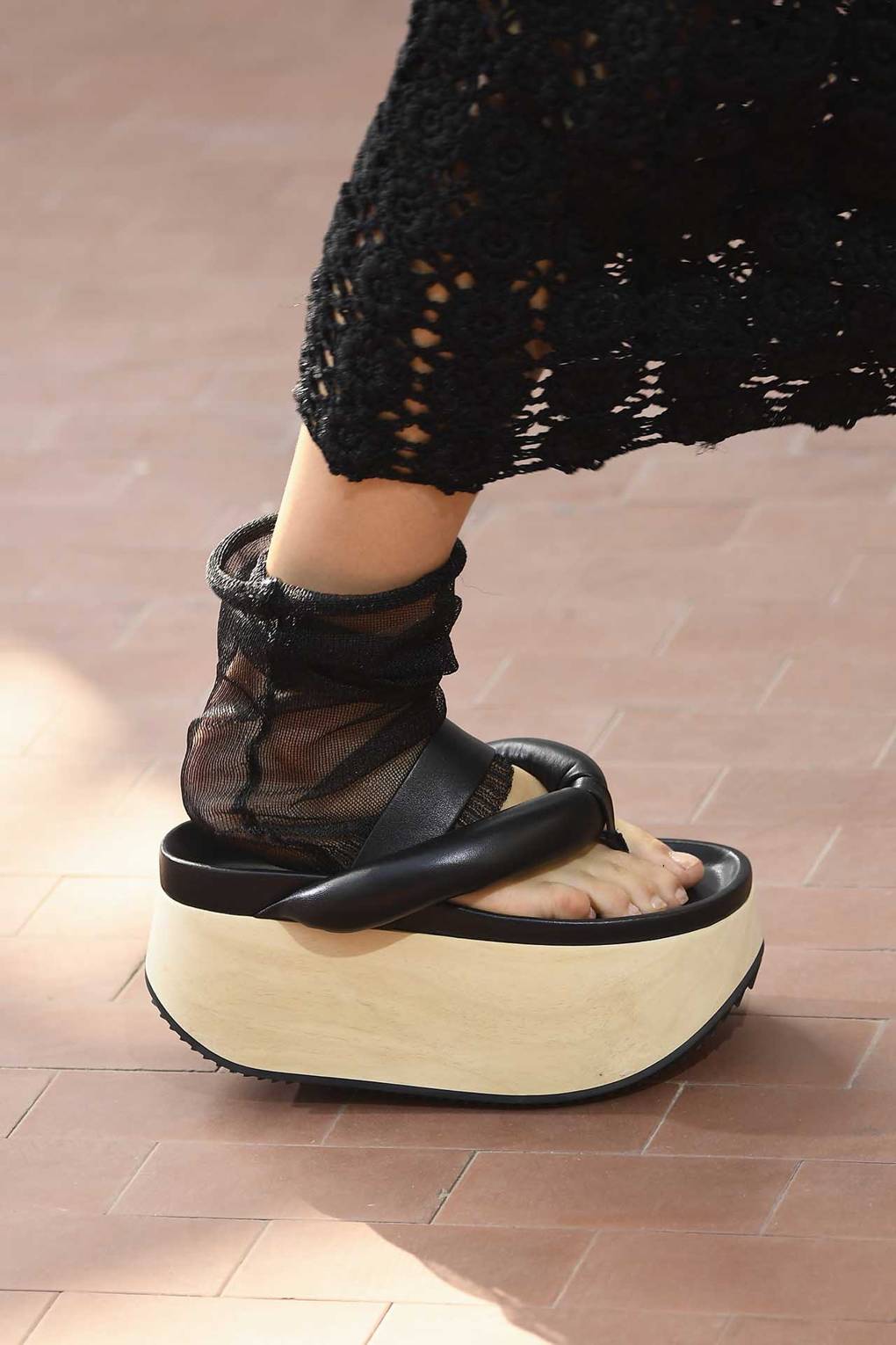 The return of Miu Miu’s signature platforms to the runway had die-hard fans beaming. They’re set to dominate the party scene alongside offerings by Saint Laurent, Dolce & Gabbana, and Maison Margiela. But it wasn’t just the heels getting an extra lift this season, ‘Geta’ sandals were seen at Paco Rabanne, Jil Sander and Salvatore Ferragamo. The traditional Japanese shoe with its block elevated sole is worn as protection against the elements, which is telling preparation for another summer rocked by climate change.
