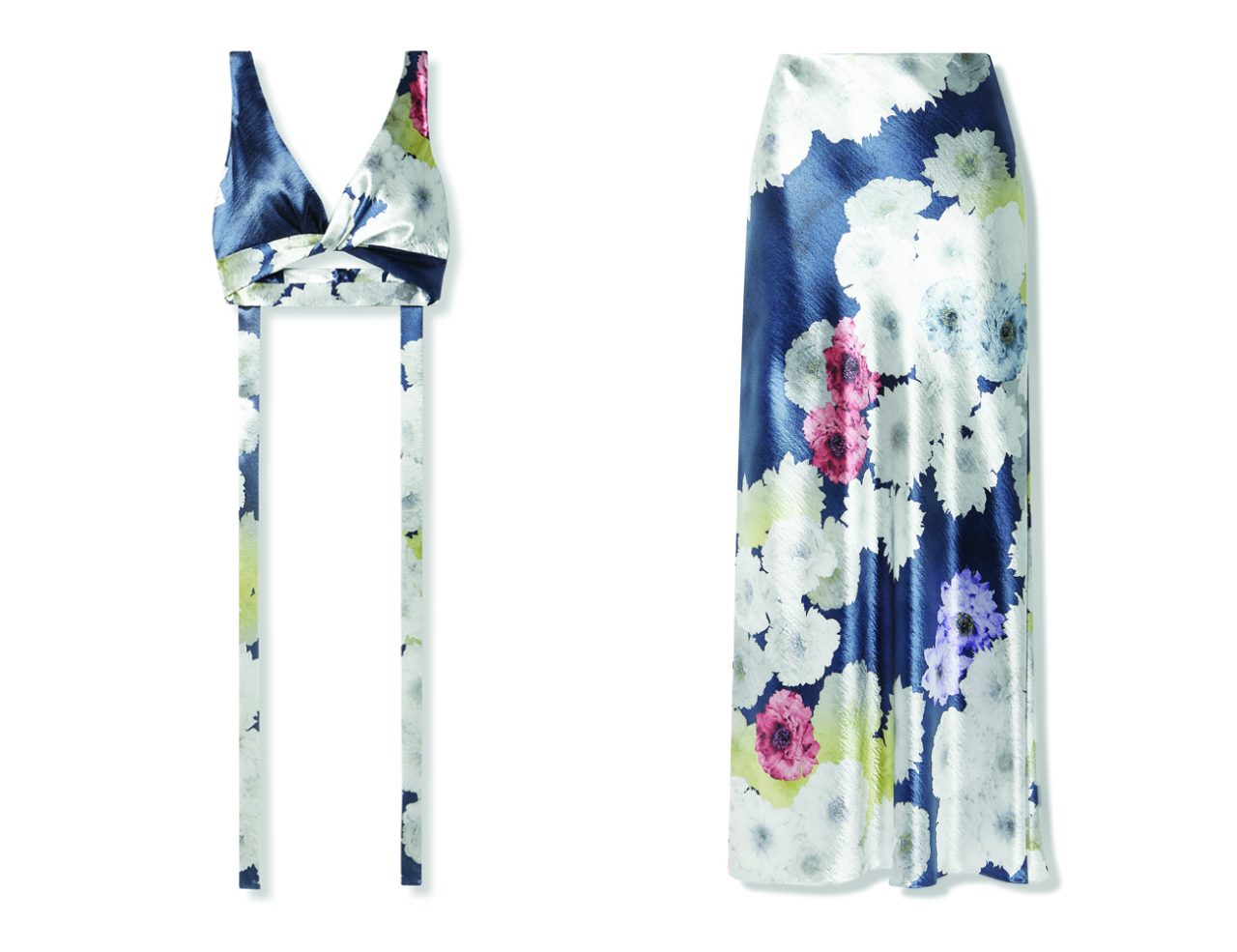 Jason Wu Twist-front cutout floral-print hammered-satin bralette; HK$3,780 at net-a-porter.com, Jason Wu Floral-print hammered-satin maxi skirt; HK$6,378.75 at net-a-porter.com