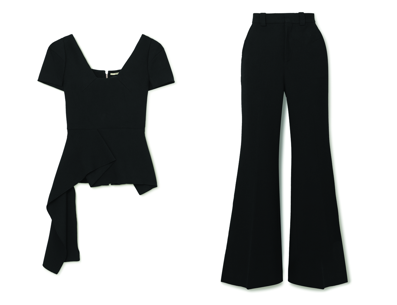 Roland Mouret Irene asymmetric draped stretch-crepe top; HK$3,495 at net-a-porter.com, Roland Mouret Dilman stretch-crepe flared pants; HK$3,640 at net-a-porter.com