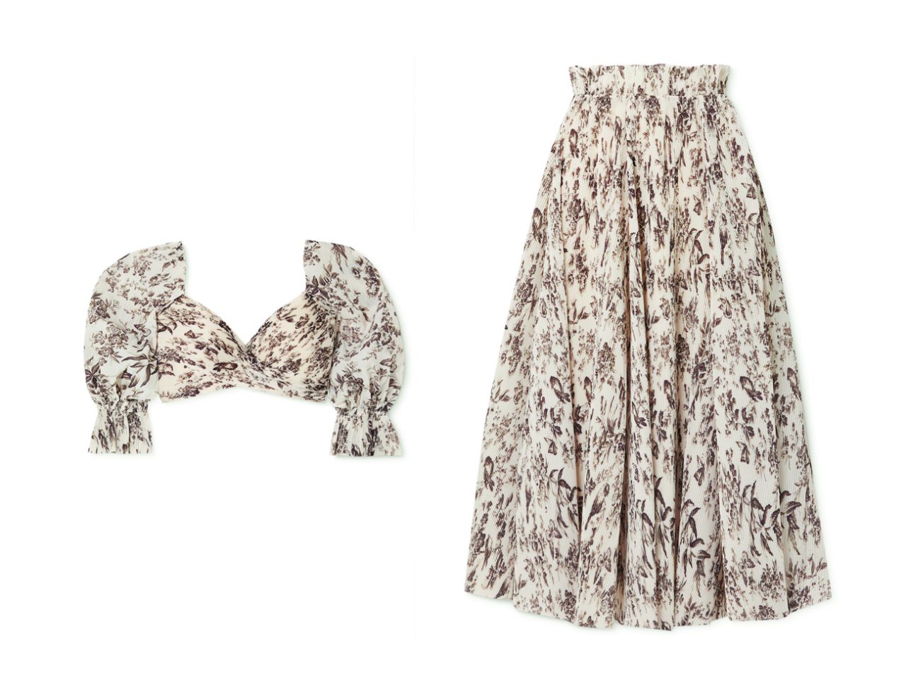 Zimmerman Wild botanica cropped floral-print plissé-crepe top; HK$3,730 at net-a-porter.com, Zimmerman Wild botanica floral-print plissé-crepe midi skirt; HK$4,560 at net-a-porter.com