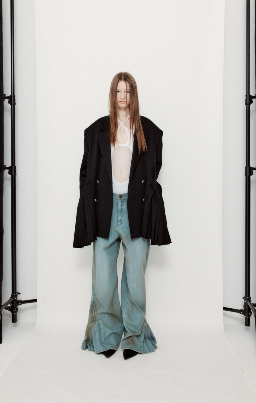 Jo is a man who knows and loves his pleats. He distinguishes himself as a designer by employing a dramatic pleating technique to reimagine wardrobe classics like blazers, coats and jeans into fashion-forward silhouettes that marry artisanal mastery with contemporary streetwear influences and cultural trends.