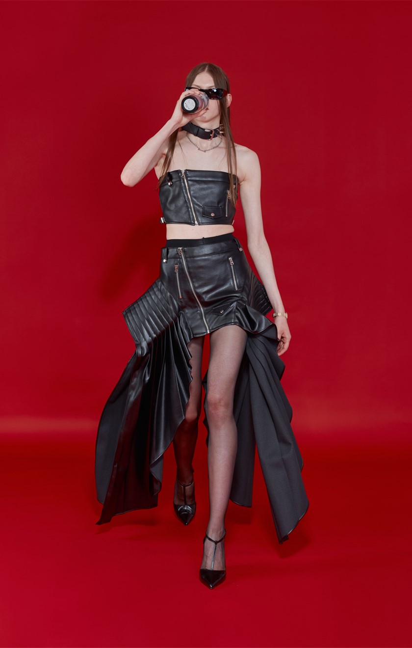 If BONBOM’s pleats look familiar, it is probably because you’ve seen them on global pop sensations Blackpink. Ever since Jo collaborated with the girl group in 2021, his designs have been spotted everywhere, from Blackpink’s music videos to their dance practice recordings. Most recently, during the group’s Born Pink World Tour in Atlanta, Rosé took the stage rocking the Daphne mini skirt from the brand’s Winter 2022 collection.