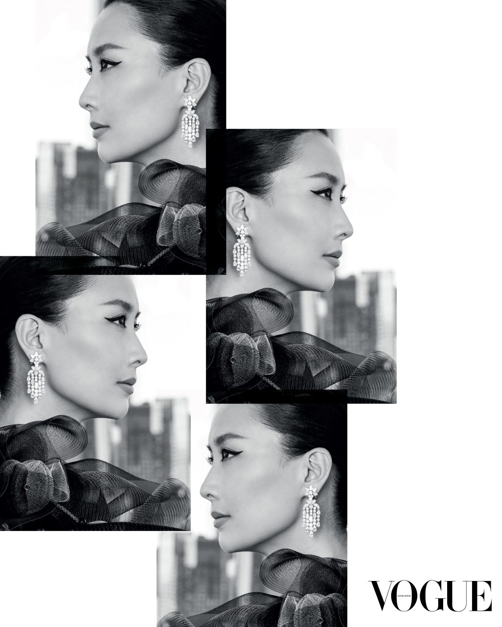 Top and waistcoat, Giorgio Armani. Diamond chandelier earrings and secret wonder reversible diamond bracelet, Harry Winston.
