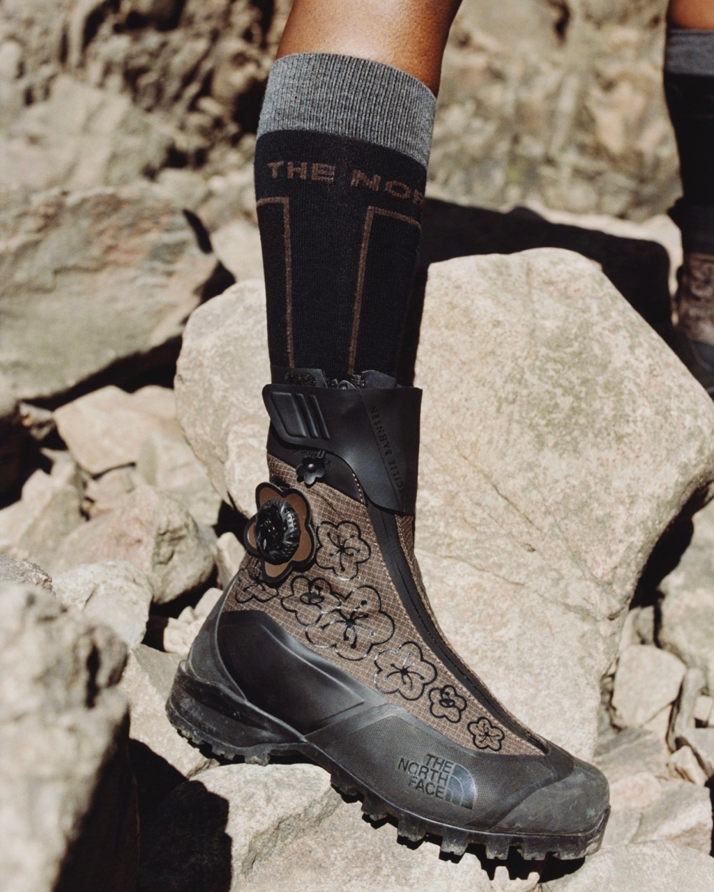 The North Face has teamed up with Cecilie Bahnsen for a second collaboration! Initially unveiled at the Danish designer’s Fall/Winter 2025 show at Paris Fashion Week, the 7-piece collection arrives in a palette of chocolate brown and black. Designs are characterised by a dreamy blend of Bahnsen’s hyper feminine design language and The North Face’s mountaineering heritage. Both incredibly functional and stylish, pieces are designed for alpine exploration and to adapt to the seasons. The DOTKNIT base layer and Denali Fleece Jacket are reimagined with frills and floral details, while a down skirt reenvisions a signature Cecilie Bahnsen silhouette with puffer proportions. There is also the Himalayan Parka with a drawstring waist, a backpack adorned with Cecilie Bahnsen flowers, and covetable reinterpretations of The North Face’s Verto Boots and Traction Mules.