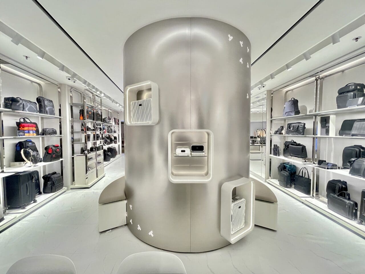 TUMI’s refreshed Pacific Place store, covering 1,132 sq ft, features a sleek design with luxurious materials. Notably, it is the first TUMI location to showcase an elegantly wrapped titanium circular column for displaying the brand’s latest accessories. Engaging visuals from an LED screen and a magnetic wall enhance the shopping experience, complemented by inviting leather seating for VIPs. In contrast, the 622 sq ft ifc store boasts TUMI’s Prototypical+ curved facade and dynamic LED screens, creating a warm environment highlighting the brand’s diverse premium offerings.