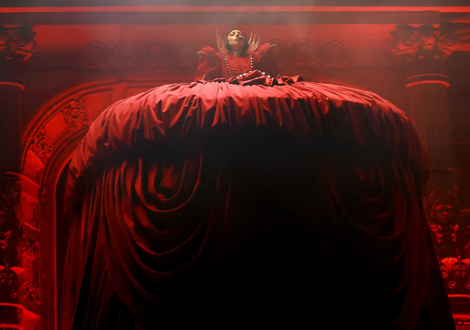 The five-act super-show kicked off with Gaga appearing on a stage that was fashioned into a brutalist opera house. She opened with her cult fave 2011 song “Bloody Mary” in a dramatic, larger-than-life red cape designed by Sam Lewis and constructed by Seth Pratt. (Lewis is responsible for many of the dark, edgy designs she has sported throughout her Mayhem era.)