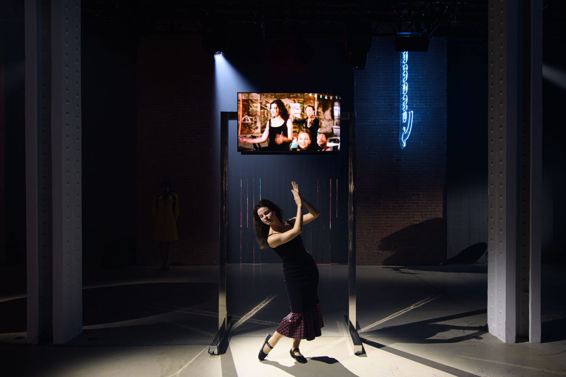 The industrial interior of the Terminal Warehouse was transformed into a dark, tunnel-like landscape punctuated by theatrical vignettes. Within these spotlit tableaux, performers dressed in Miu Miu embodied archetypal roles – The Artist, The Remedy, The Singer – each referencing the house’s fashion and cinematic archive. Guests were encouraged to explore freely while performers zoomed by on skateboards, singers shimmered in silver paillettes, and voices echoed through the cavernous space shouting “Disrupt reality!” while waving The Truthless Times newspaper, which was passed out to guests at the SS25 Miu Miu runway show. The performance culminated in a group dance as VIP guests looked on sipping champagne and holding Miu Miu-branded tote bags.