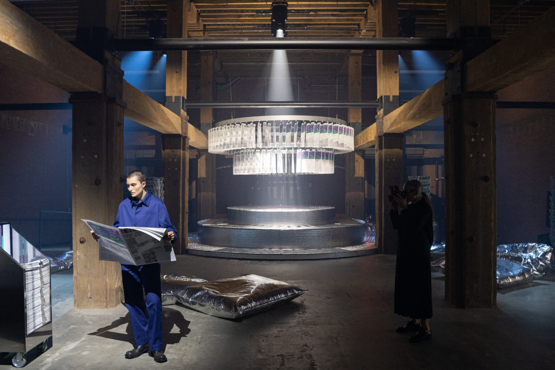 Conceived by Polish-born interdisciplinary artist Goshka Macuga and convened by Elvira Dyangani Ose (director of MACBA, Museu d’Art Contemporani de Barcelona), Tales & Tellers is a site-specific installation performance under the creative direction of Miuccia Prada. The project draws inspiration from and features film commissions of the acclaimed Miu Miu Women’s Tales film series highlighting female creatives, as well as scenographic interventions from the brand’s runway shows spanning Spring/Summer 2022 to Spring/Summer 2025.
