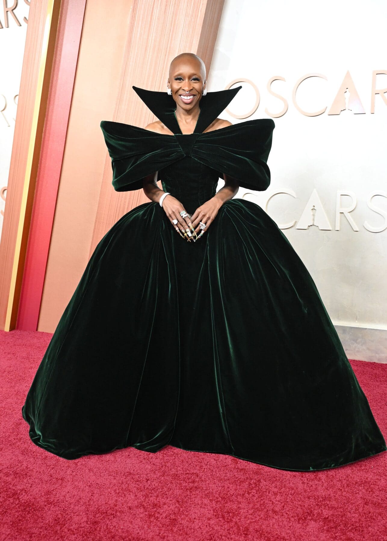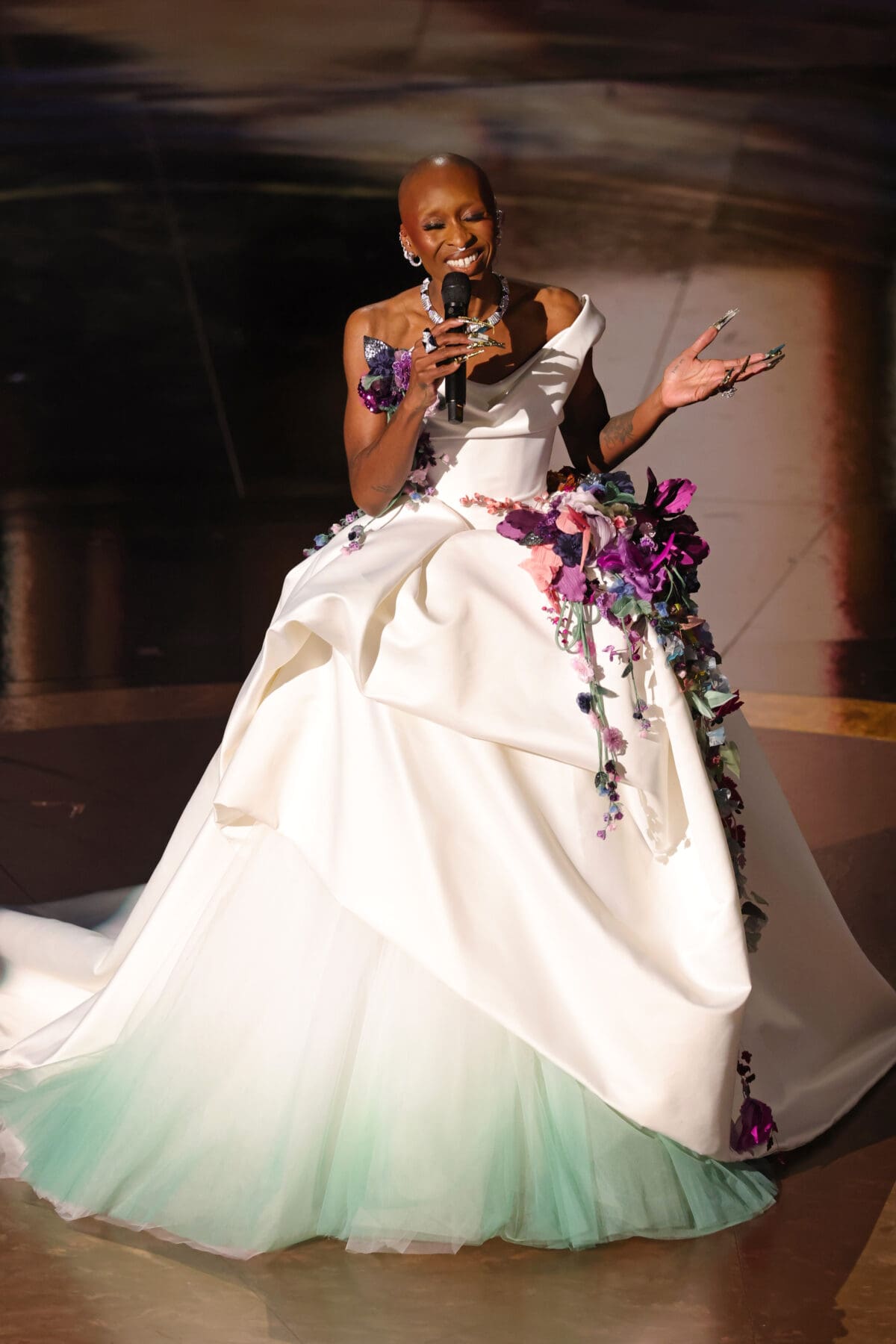 Wicked stars Ariana Grande and Cynthia Erivo pulled no stops for their red carpet and performance numbers. Grande stepped out in a custom Schiaparelli gown with a satin bodice and sculptural peplum, channeling Glinda with its soft pink hues. Meanwhile, Erivo made an emerald green statement in custom Louis Vuitton, complemented by embellished nails that are signature to any Cynthia Erivo look. Later in the night, the pair joined onstage to deliver some Ozian music magic with equally ethereal dresses to match—Grande in custom Schiaparelli Haute Couture and Erivo in Vivienne Westwood florals.