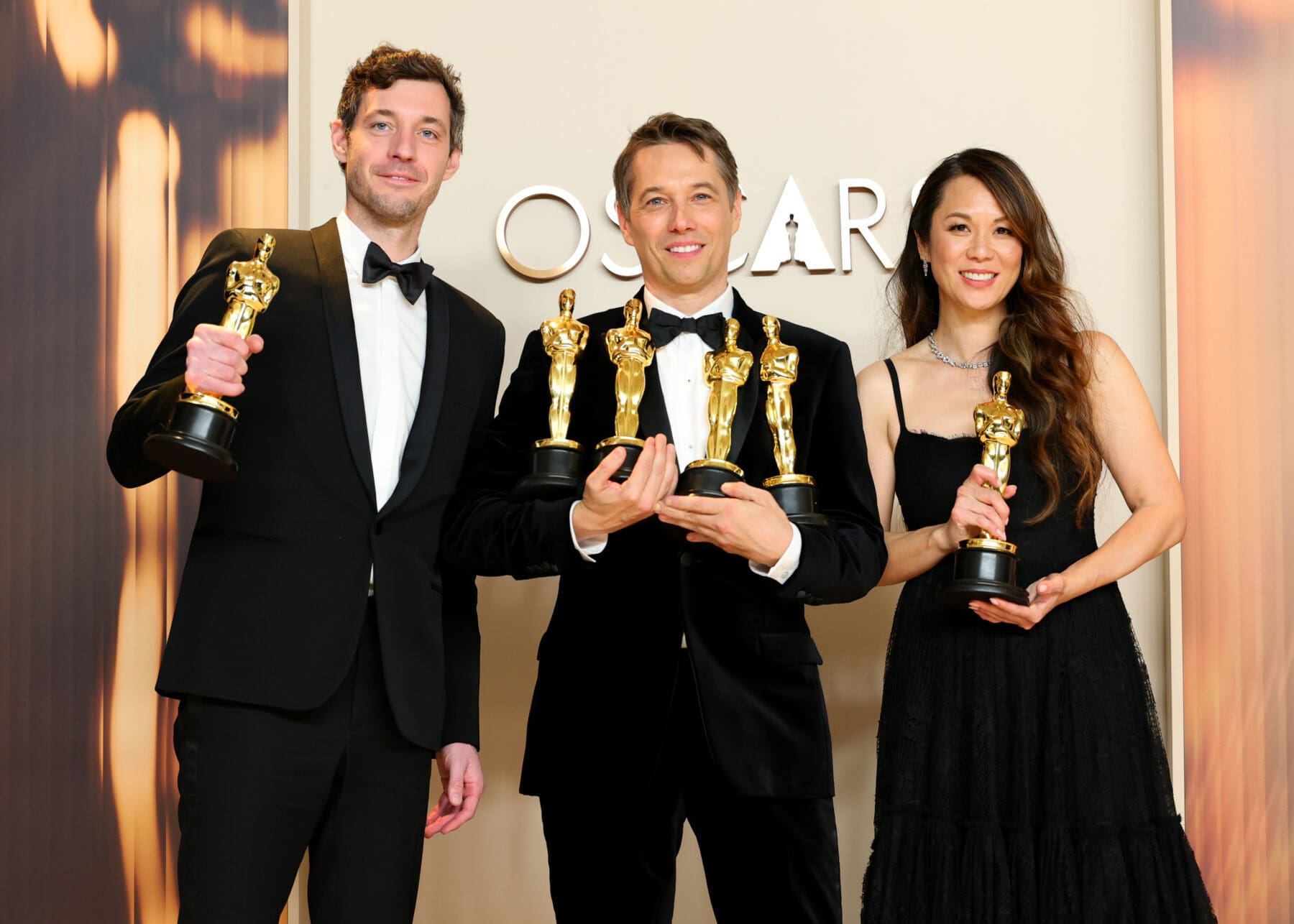 March 2, 2025 (L-R) Alex Coco, Sean Baker and Samantha Quan, winners of the Best Picture award for “Anora”, pose in the press room during the 97th Annual Oscars.
