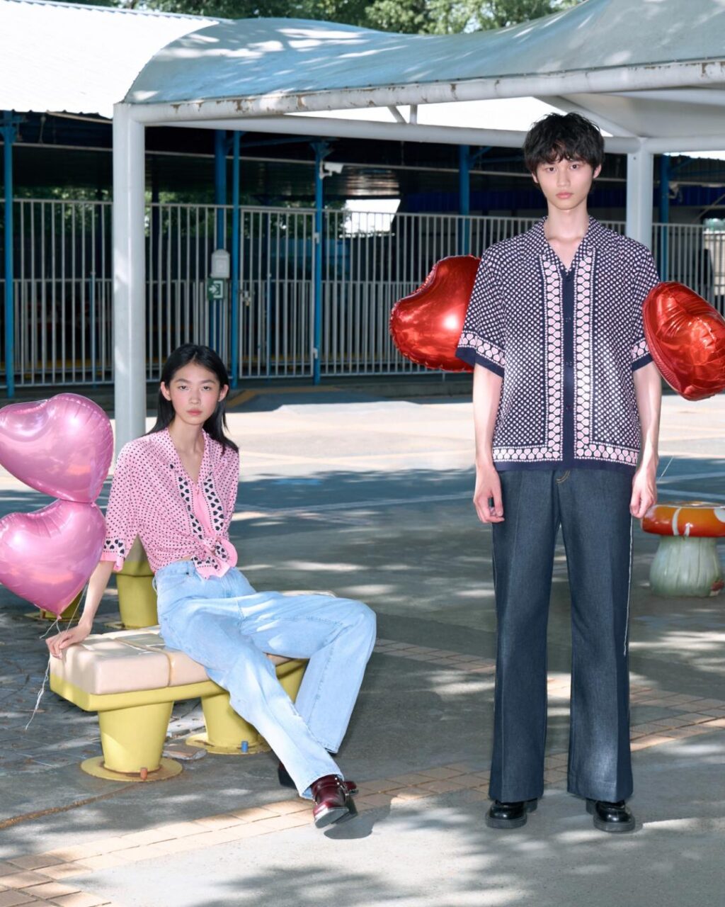 Sandro’s Qixi 2025 campaign whisks us back to the magic of young love, set against the nostalgic charm of an amusement park. With heart-shaped balloons and still moments amid vibrant backdrops, the collection tells a story of romance that feels both timeless and modern. The menswear features gender-inclusive Cuban-collar shirts in rouge pink and baby blue, a fresh take on shared wardrobe aesthetics. For womenswear, delicate lace, scalloped hems, and rhinestone-adorned dresses evoke elegance, while retro suede jackets and voluminous skirts add a playful, vintage touch.