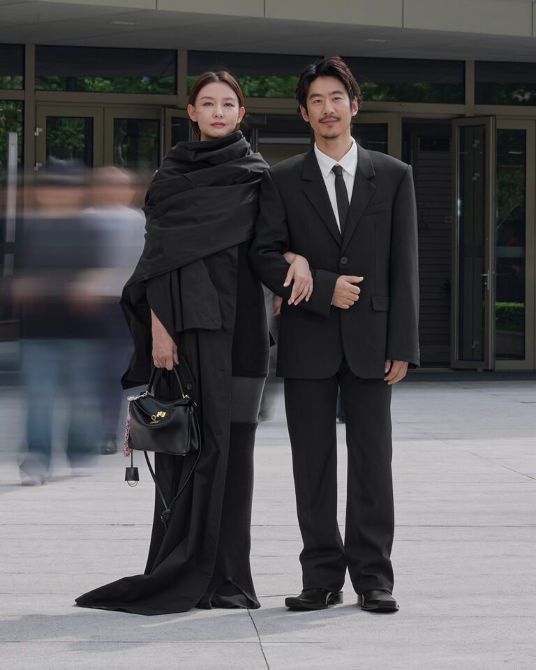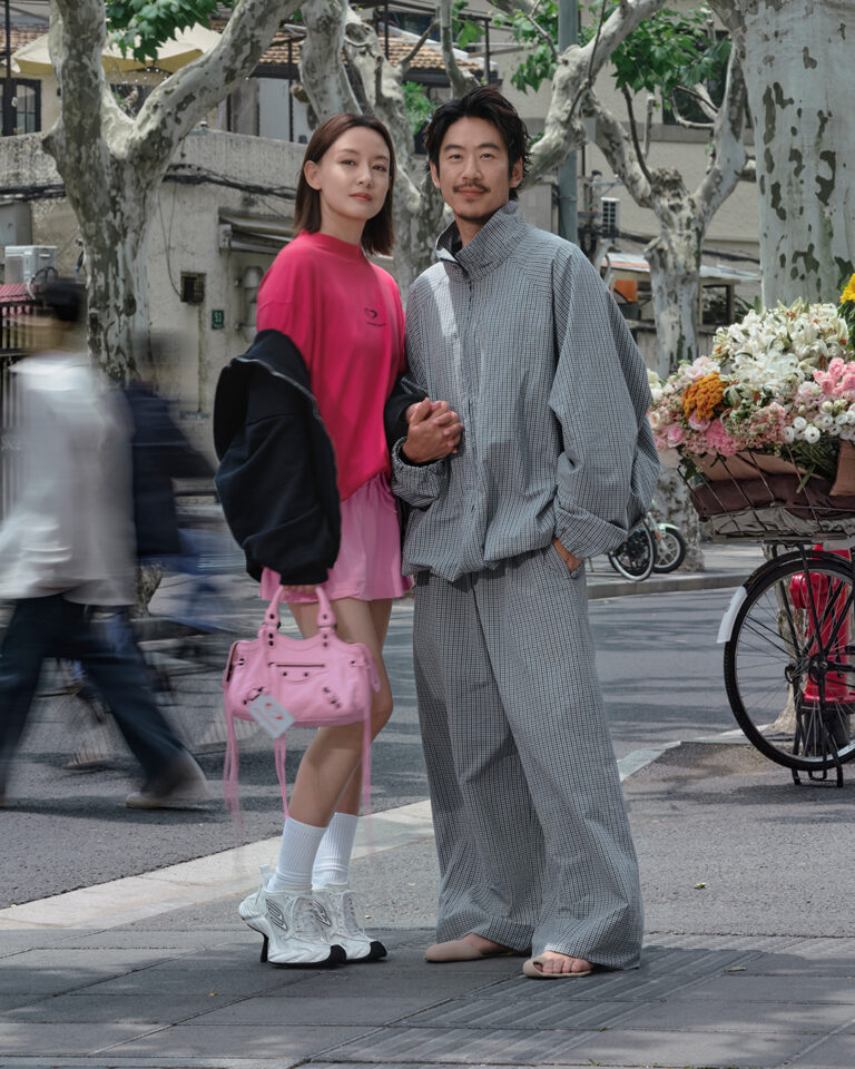 Balenciaga’s Qixi 2025 campaign tells a story of love frozen in time, starring actor couple Zhou Qiqi and Jiang Qilin. Shot by artist Feng Li, the pair stand still amidst the vibrant energy of Shanghai, framed by landmarks like the Opera House and the Bund. In the midst of bustling crowds, they share a quiet moment of connection, their stillness a striking contrast to the city’s motion. Dressed in pieces from the Qixi 2025 collection—double-heart motif T-shirts and a mini Rodeo bag adorned with a festive charm—they embody a love that feels relatable and intimate, yet eternal.