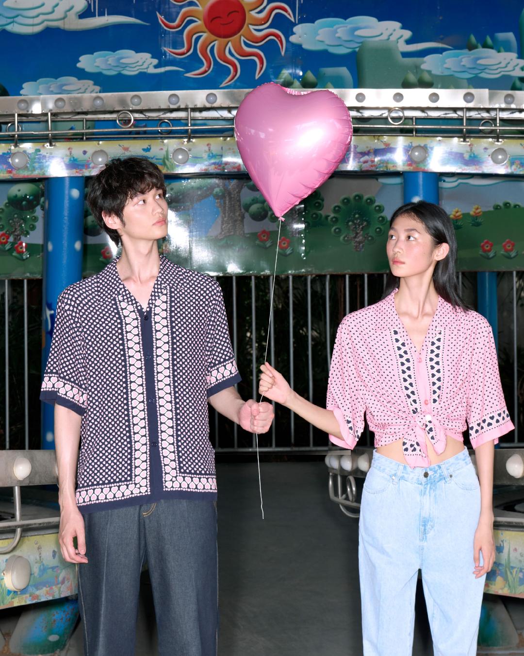 Sandro’s Qixi 2025 campaign whisks us back to the magic of young love, set against the nostalgic charm of an amusement park. With heart-shaped balloons and still moments amid vibrant backdrops, the collection tells a story of romance that feels both timeless and modern. The menswear features gender-inclusive Cuban-collar shirts in rouge pink and baby blue, a fresh take on shared wardrobe aesthetics. For womenswear, delicate lace, scalloped hems, and rhinestone-adorned dresses evoke elegance, while retro suede jackets and voluminous skirts add a playful, vintage touch.