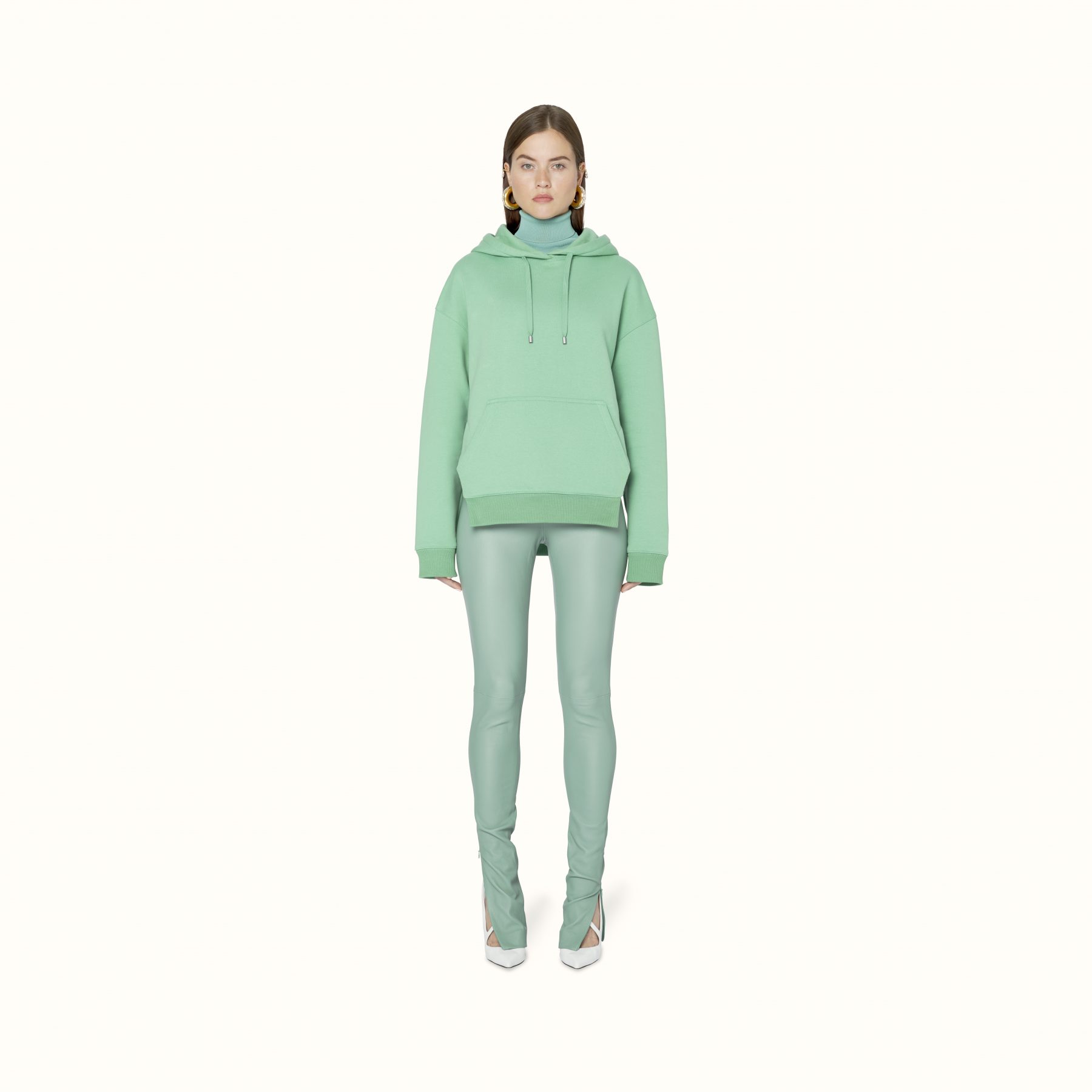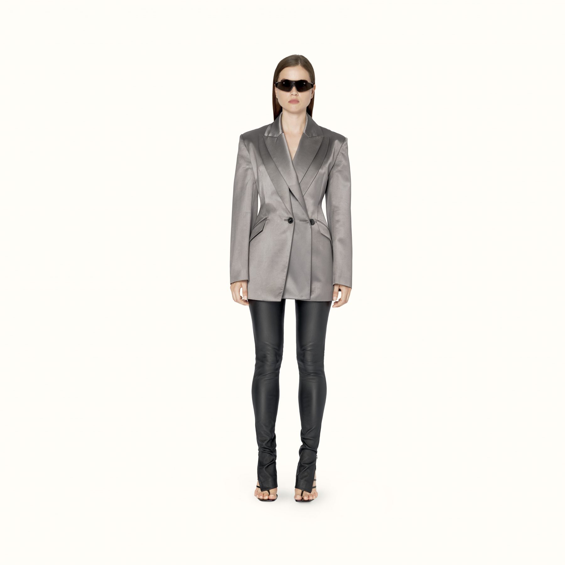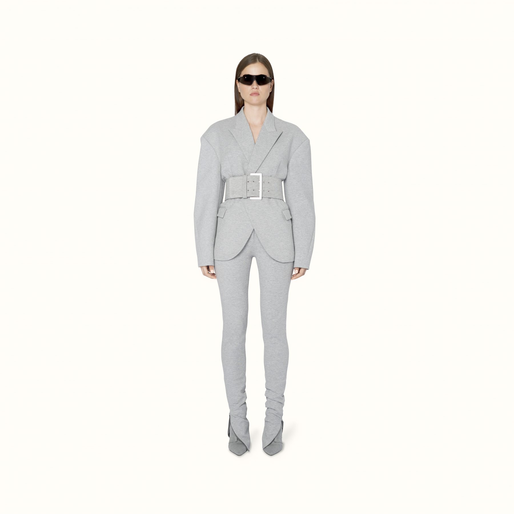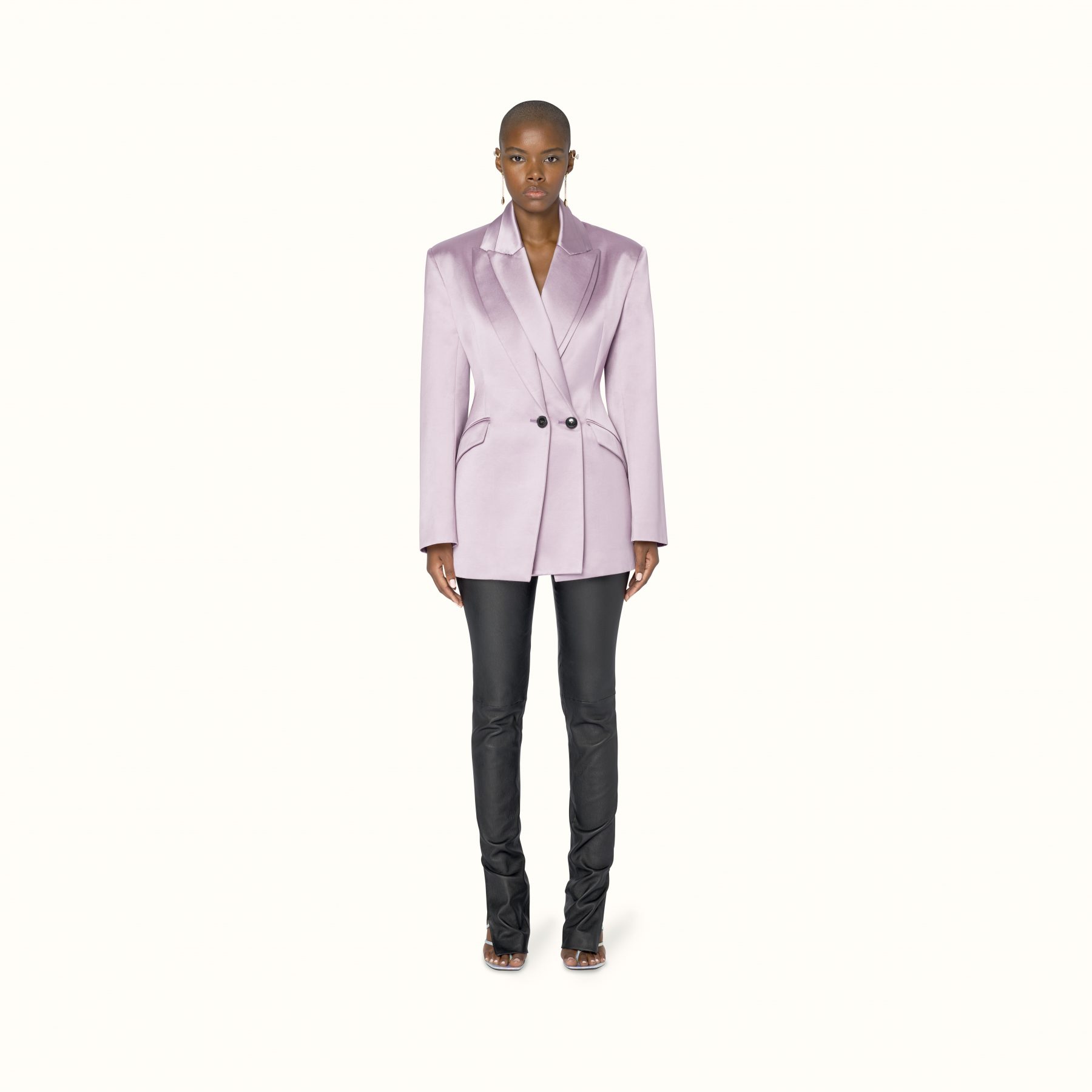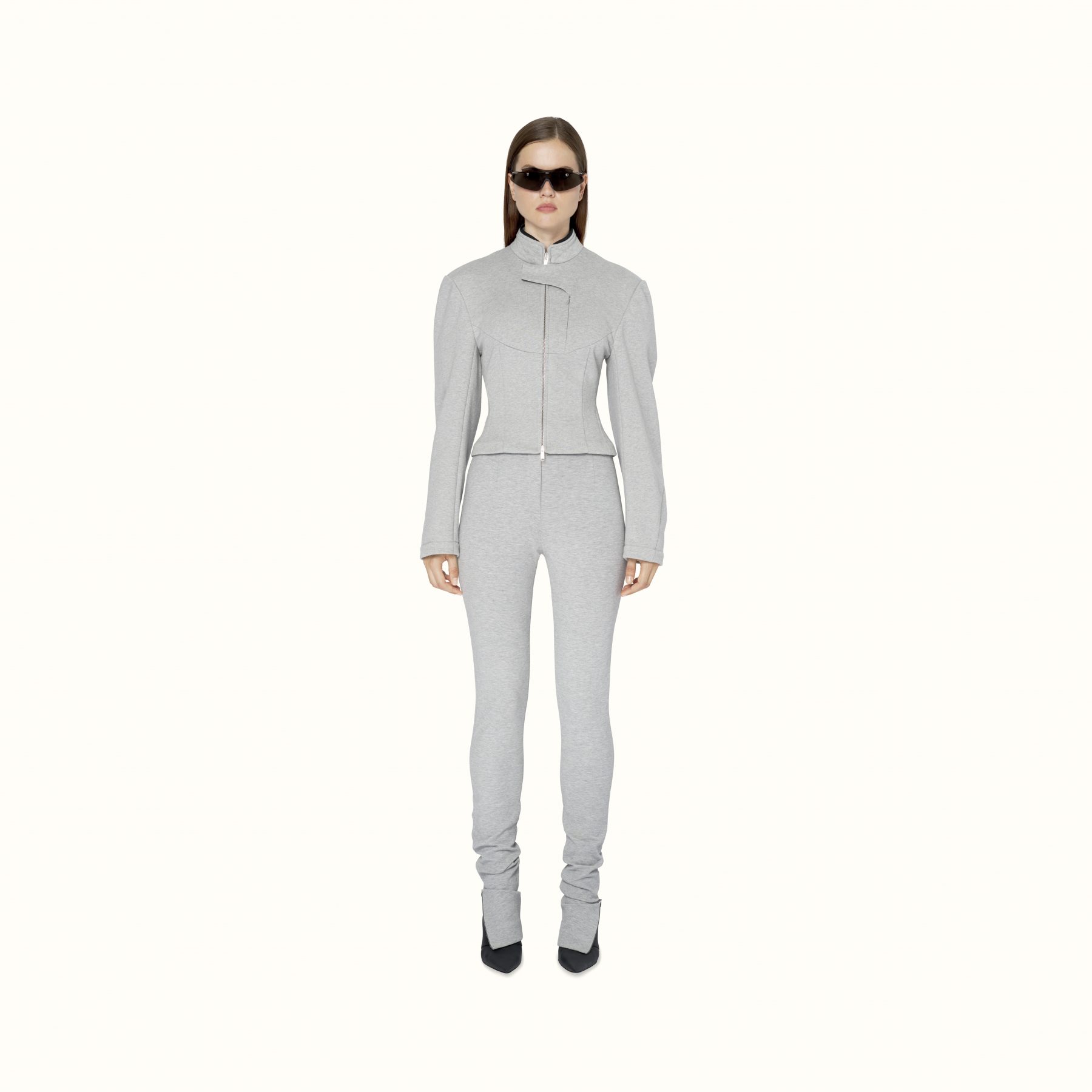 Available exclusively online, Release 8-19 introduces a range of pre-fall staples designed to challenge and transform traditional suiting. Double-breasted satin blazers appear in a light mulberry sheen to feature the Maison’s signature waist-cinching form, while the use of cotton-jersey is elevated into biker-style sweatshirts and ankle zip pants that elongate the silhouette. For shoes, Rihanna introduces Fenty’s first-ever boot — the Corset boot featuring an angular T-heel — along with twist-strap pumps in white leather and wasabi satin. Accessories-wise, pearls feature in a series of arm cuffs and free-hanging hoops, joined by the label’s foldable sunglasses in a new jet-black colouration.