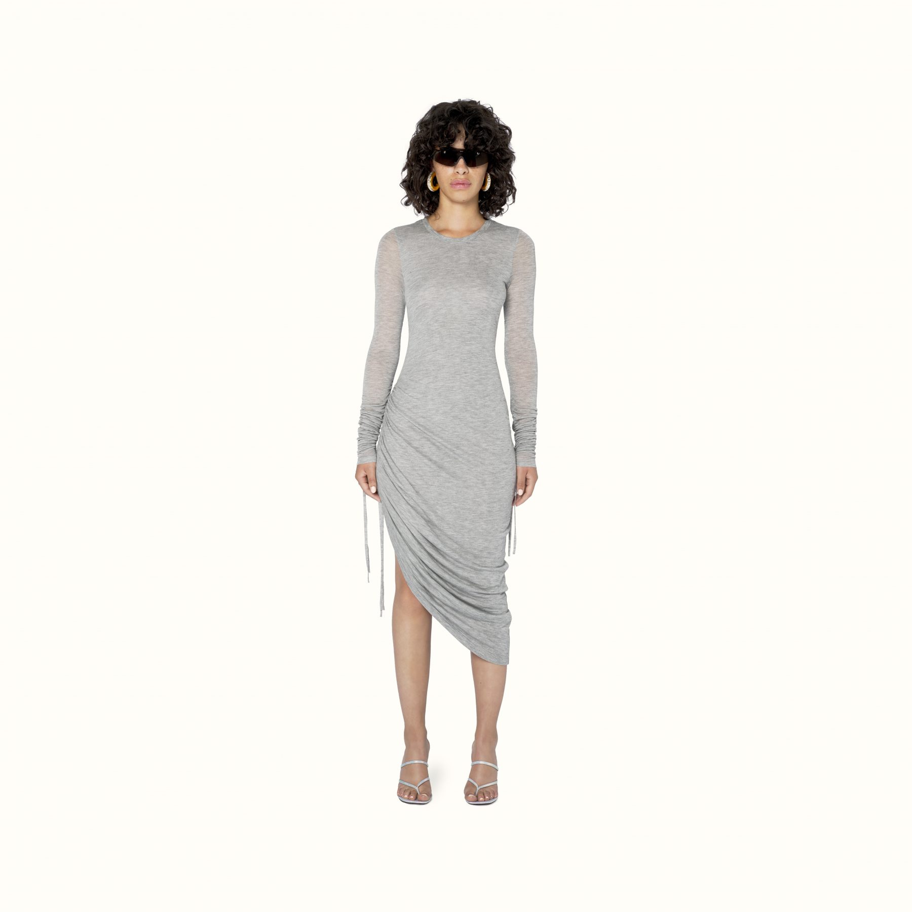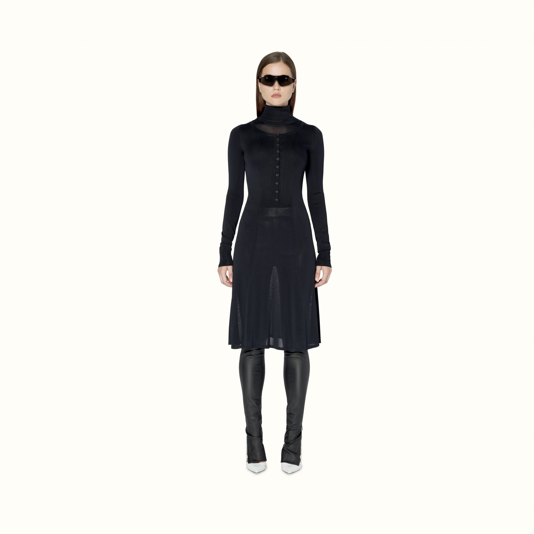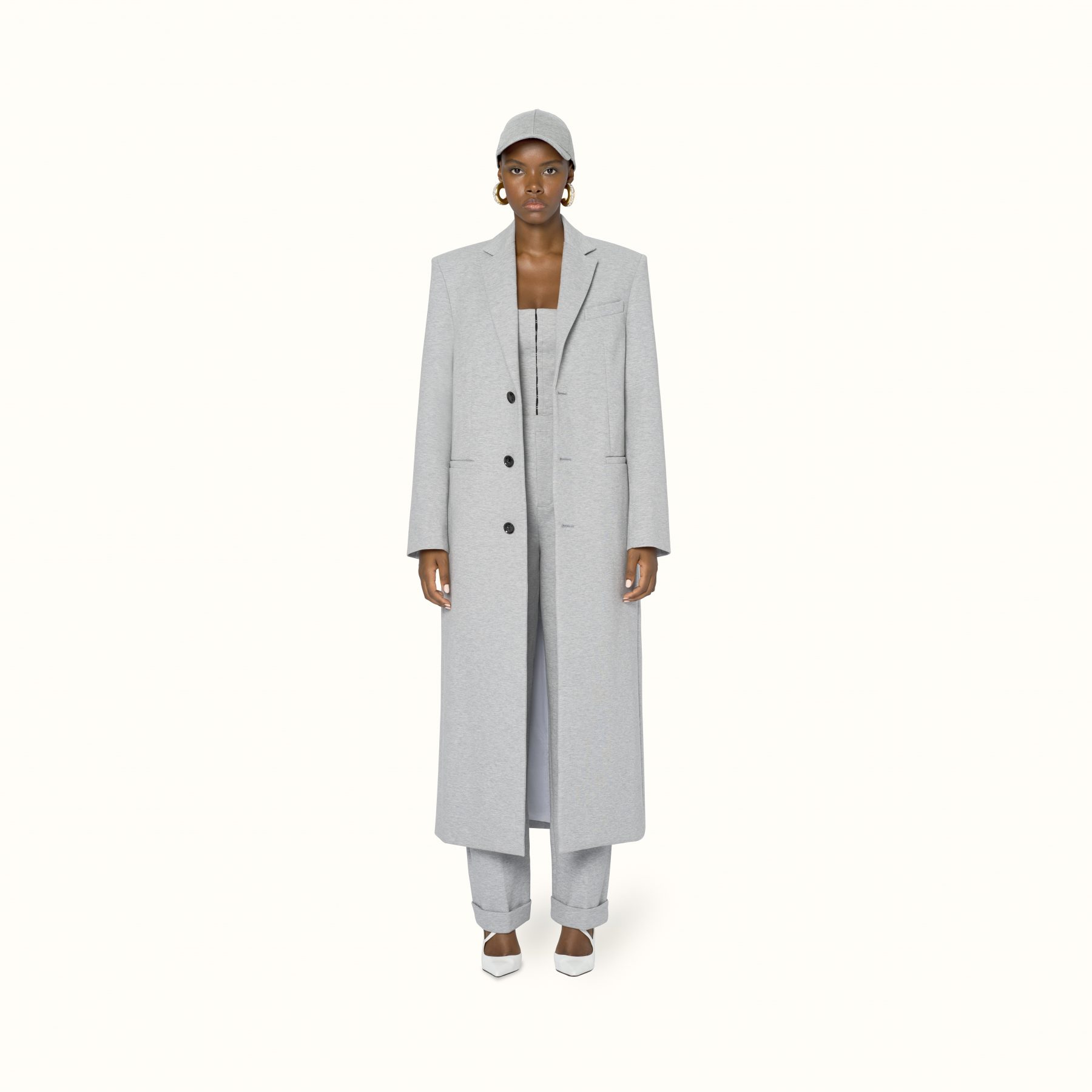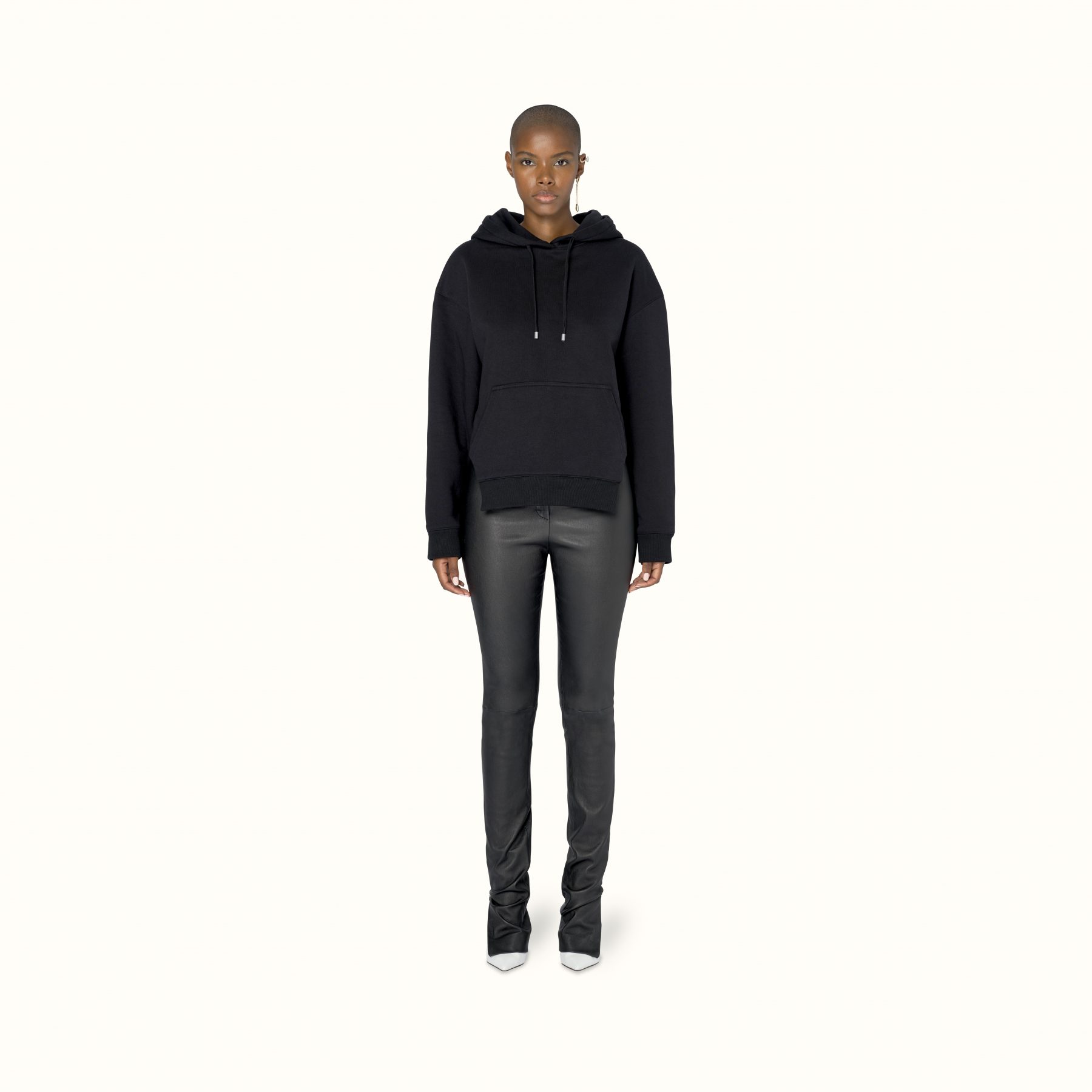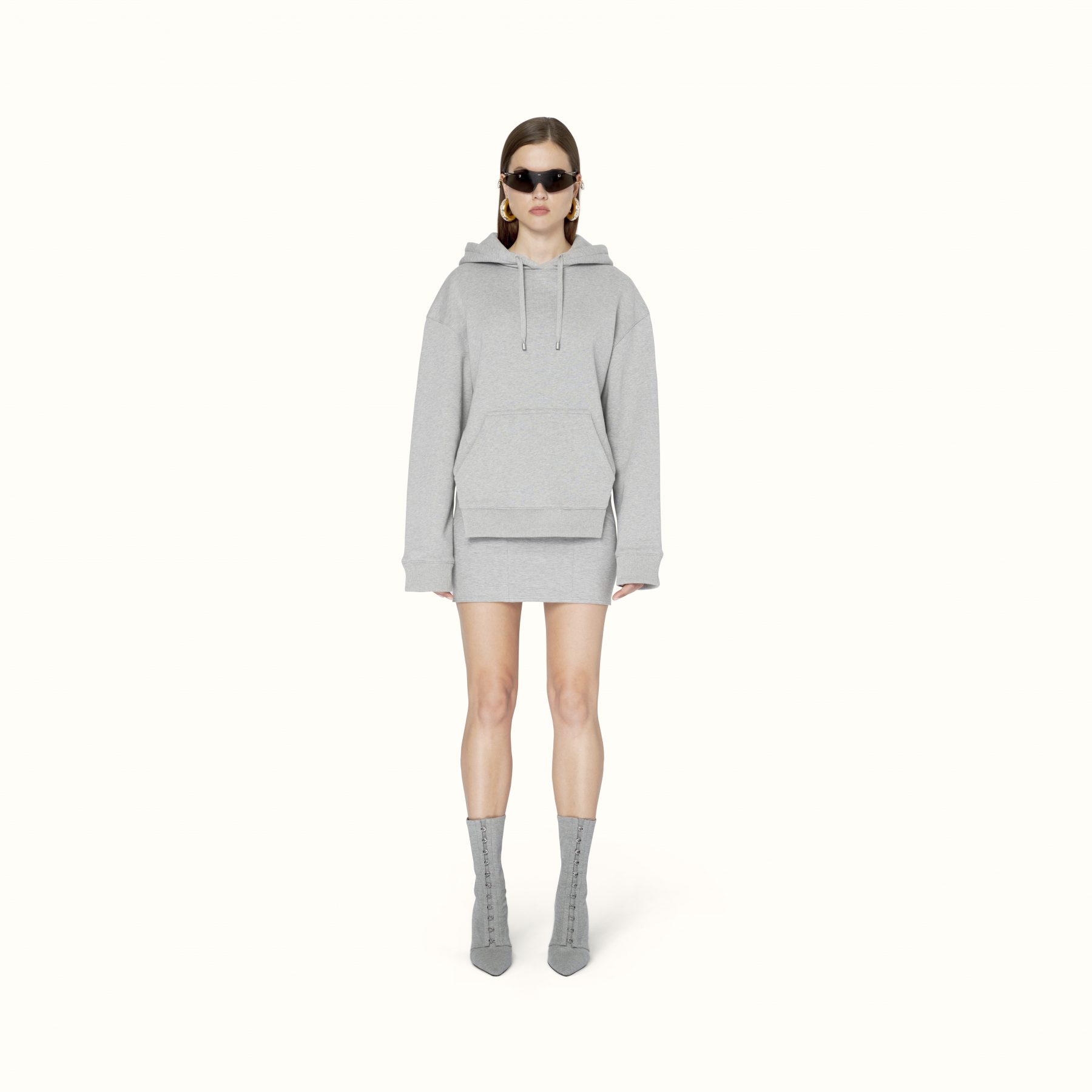 Available exclusively online, Release 8-19 introduces a range of pre-fall staples designed to challenge and transform traditional suiting. Double-breasted satin blazers appear in a light mulberry sheen to feature the Maison’s signature waist-cinching form, while the use of cotton-jersey is elevated into biker-style sweatshirts and ankle zip pants that elongate the silhouette. For shoes, Rihanna introduces Fenty’s first-ever boot — the Corset boot featuring an angular T-heel — along with twist-strap pumps in white leather and wasabi satin. Accessories-wise, pearls feature in a series of arm cuffs and free-hanging hoops, joined by the label’s foldable sunglasses in a new jet-black colouration.