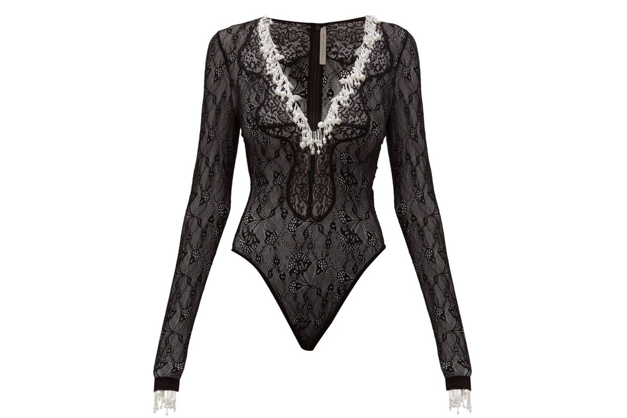 Christopher Kane Pearl-Trimmed plunge-neck lace bodysuit; HK$6,041 at matchesfashion.com https://www.matchesfashion.com/intl/products/Christopher-Kane-Pearl-trimmed-plunge-neck-lace-bodysuit--1279562