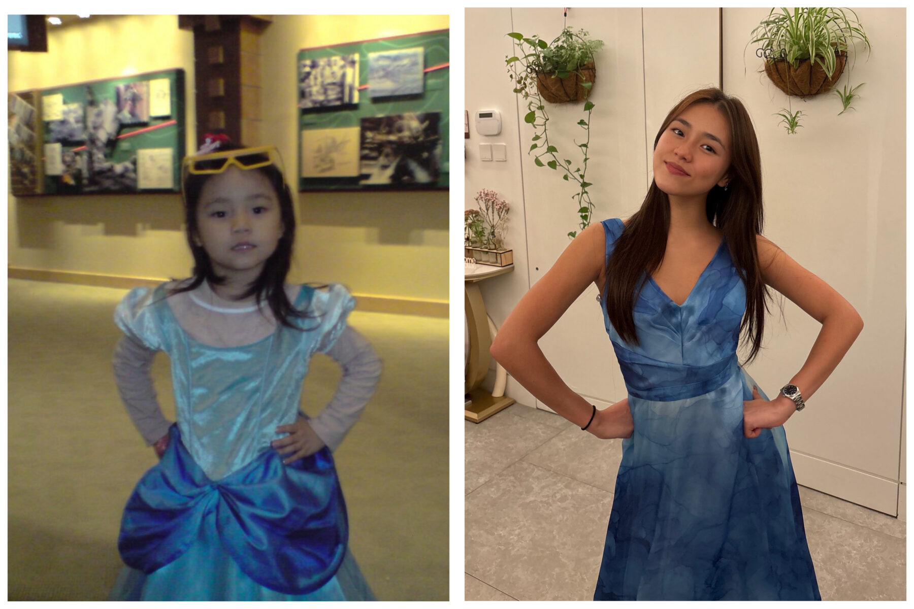 Channelling Cinderella in a blue ball-gown, more than a decade apart.