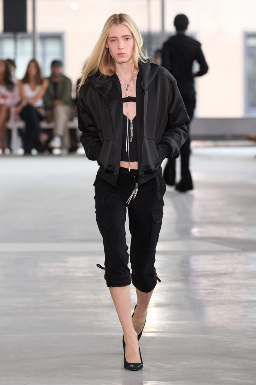 Well, it was 10:29 in the morning when the show began, and everyone in the room definitely felt like anything could happen when the first model walked out. She wore a slim cotton sweatsuit with cropped cargo pants over a tank with an extra long and extra sparkly zipper pull that could have stood in for a necklace, except she was also wearing a necklace, fashioned like a hoodie drawstring, bedazzled in silver and wrapped around her neck like a lariat. It was as jarring as any of the more conceptual looks that have graced the Area runway in the past three years, yet it also made perfect sense. After all, the brand first made its mark in New York ten years ago with cool girl party clothes.