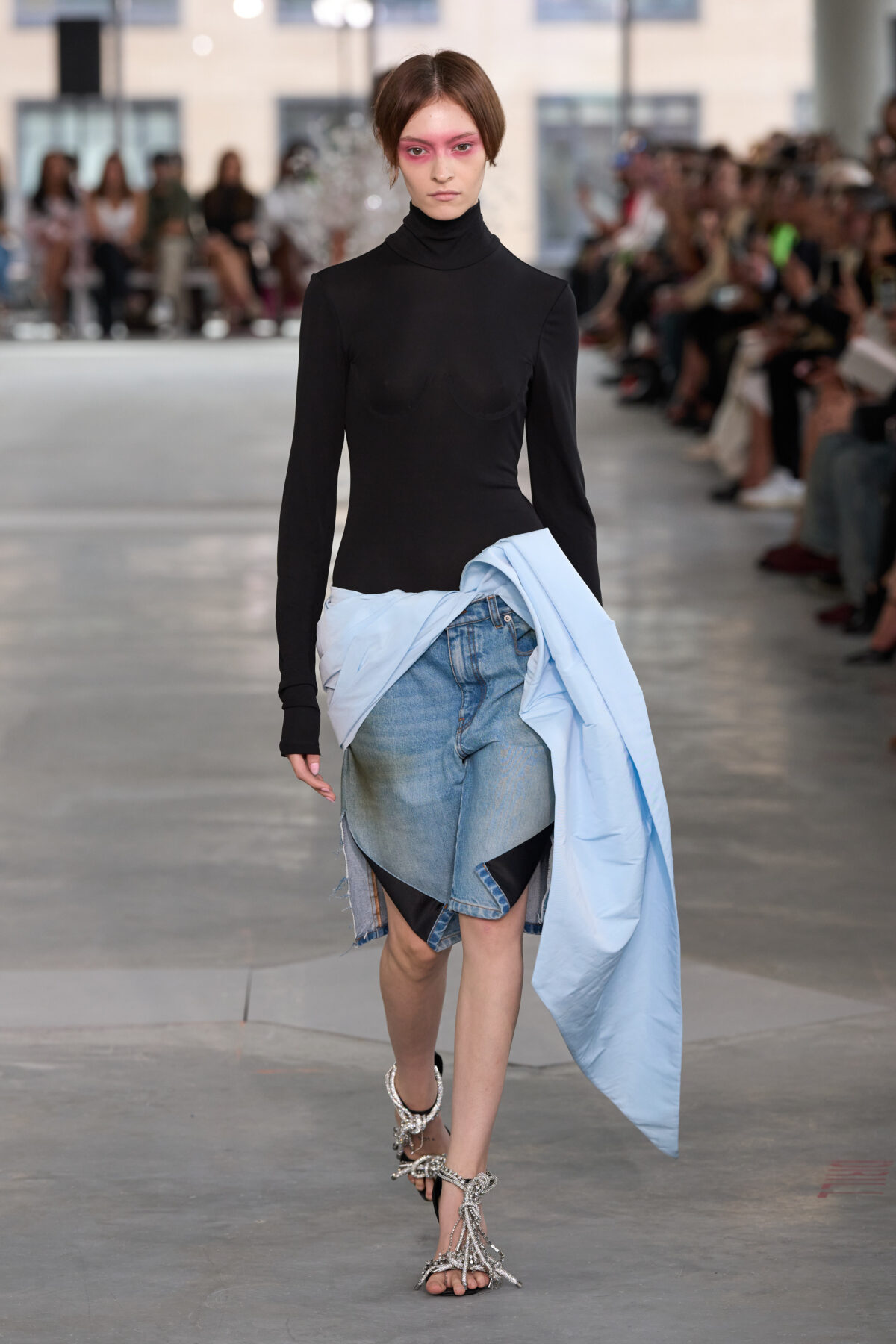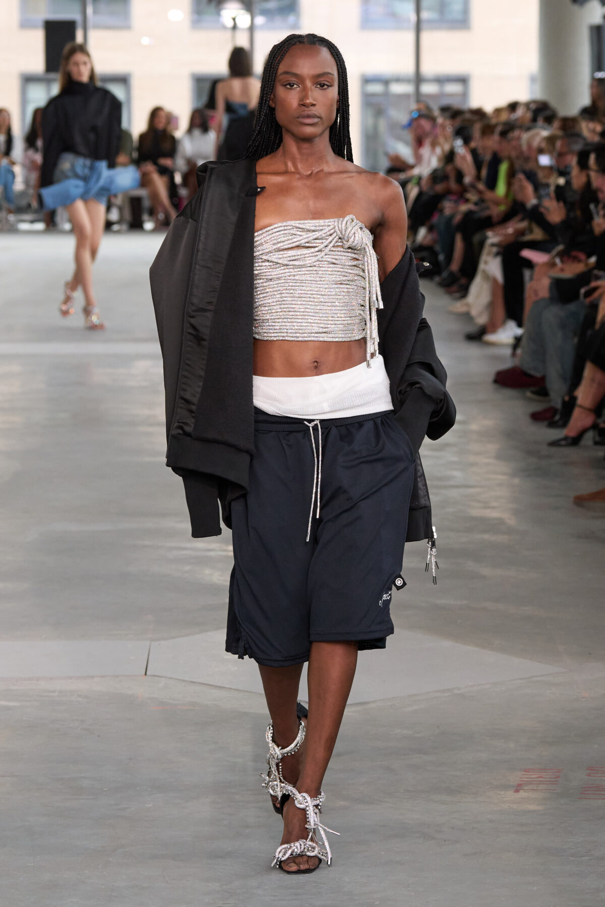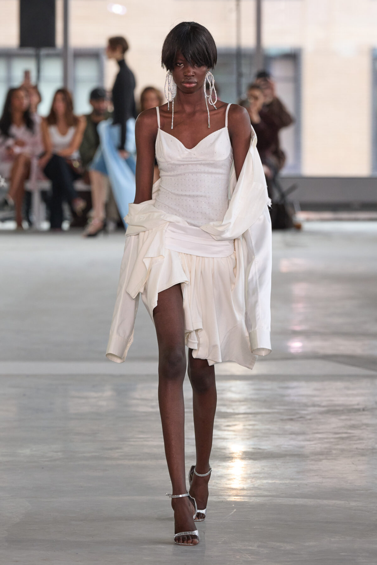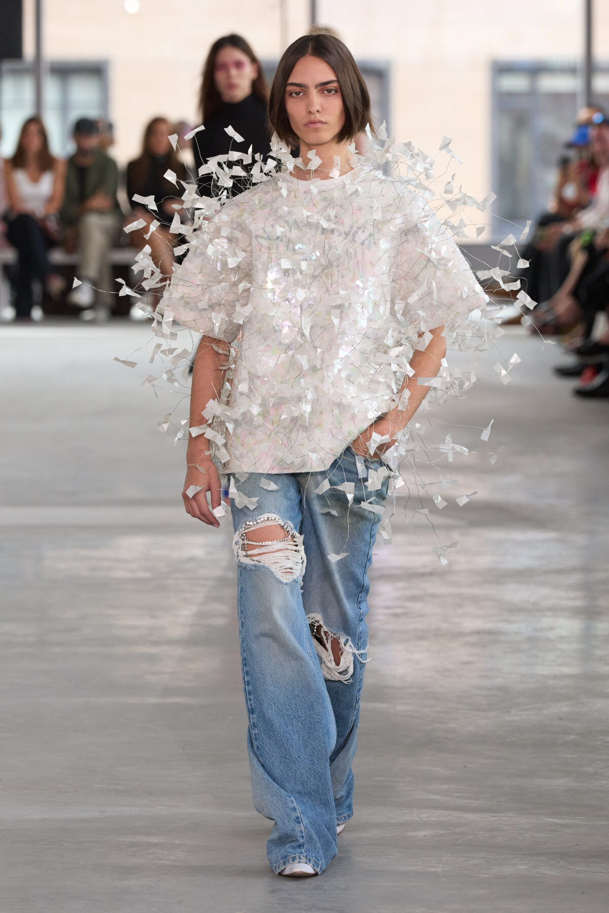 Soon enough the sparkle appeared; in tiny skirts and cropped bandeau tops made from those very same bedazzled drawstrings, seemingly gathered, wrapped and tied around the body, and then later in a more chaotic style of tangled strings of crystals (a bustier mini-dress worn over a sweet cotton-eyelet trimmed bra immediately read as Life of a Showgirl-ready). Denim has always been a big part of Area’s offering, and here we had long and lean jeans with trompe l’oeil layered jorts on top, wide leg jeans with slashes on the knees and legs that exposed a black satin or bedazzled lining, and the piece-de-resistance, a miniskirt with a bow on the front made by tying the two pant legs together. It was so well-constructed that for a second it looked like they had somehow managed to make it from a regular pair of jeans. “I really, really wanted to, but it’s slightly different,” Aburn explained. “We got pretty close.” He expects the skirt to go into production.
