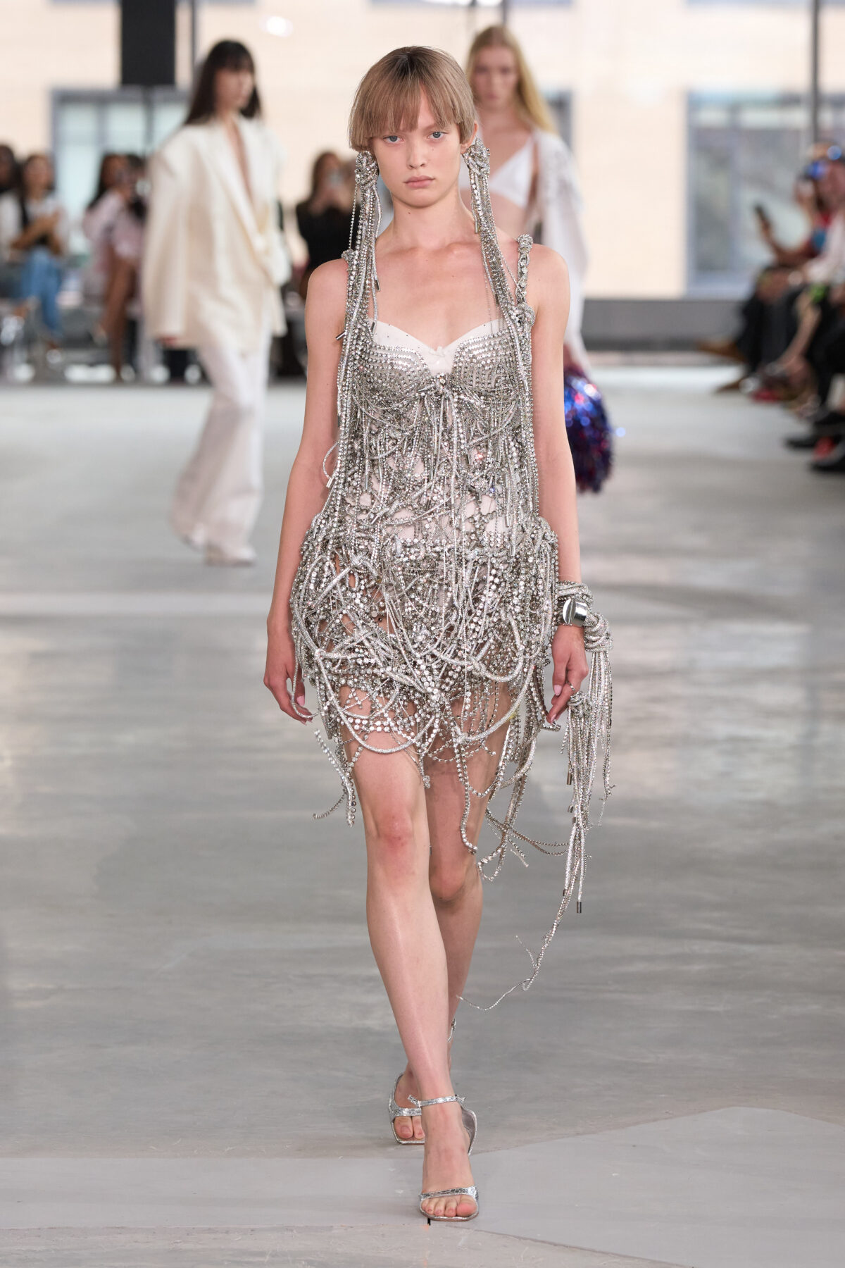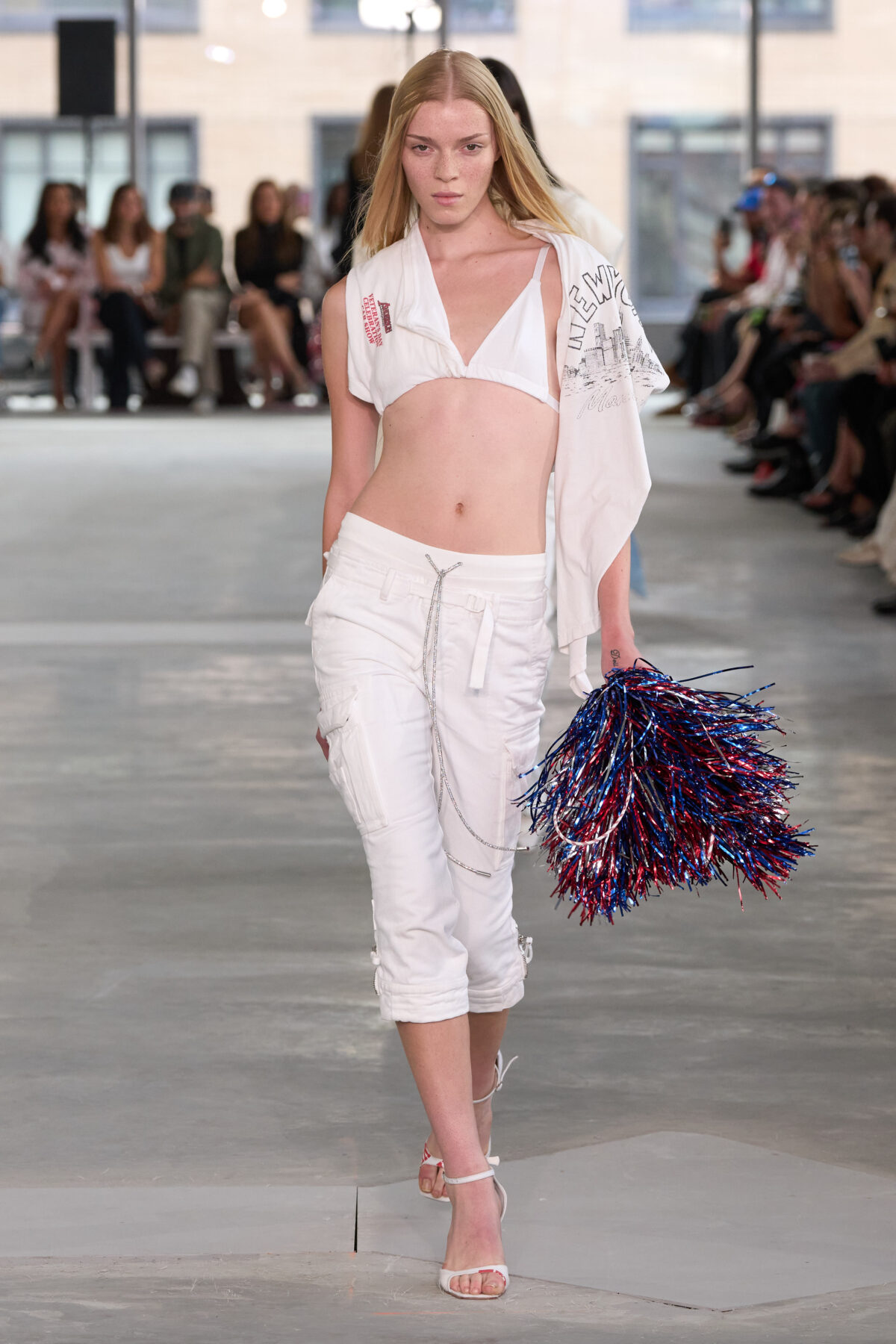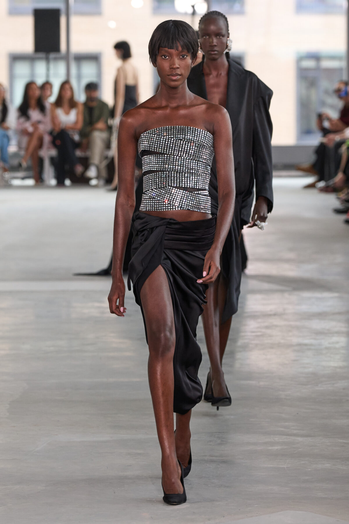 Soon enough the sparkle appeared; in tiny skirts and cropped bandeau tops made from those very same bedazzled drawstrings, seemingly gathered, wrapped and tied around the body, and then later in a more chaotic style of tangled strings of crystals (a bustier mini-dress worn over a sweet cotton-eyelet trimmed bra immediately read as Life of a Showgirl-ready). Denim has always been a big part of Area’s offering, and here we had long and lean jeans with trompe l’oeil layered jorts on top, wide leg jeans with slashes on the knees and legs that exposed a black satin or bedazzled lining, and the piece-de-resistance, a miniskirt with a bow on the front made by tying the two pant legs together. It was so well-constructed that for a second it looked like they had somehow managed to make it from a regular pair of jeans. “I really, really wanted to, but it’s slightly different,” Aburn explained. “We got pretty close.” He expects the skirt to go into production.