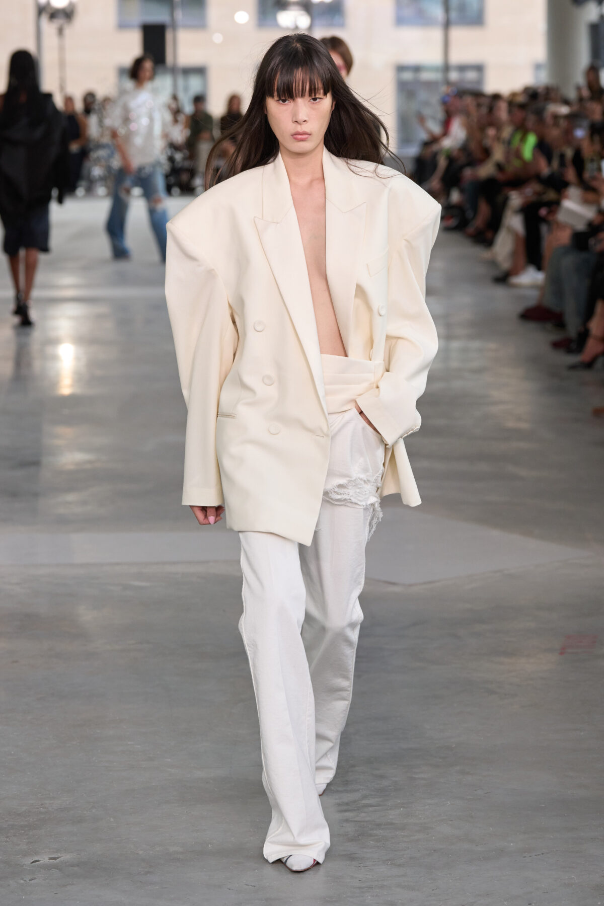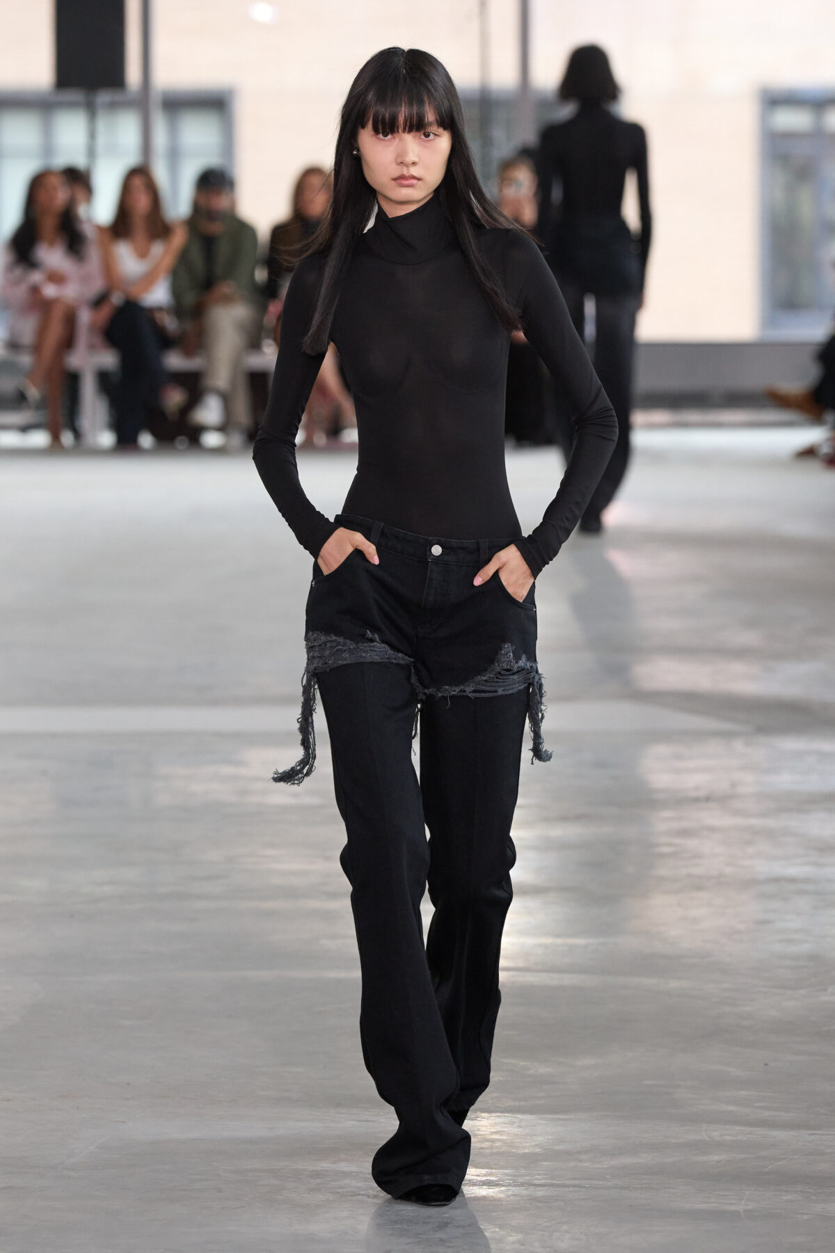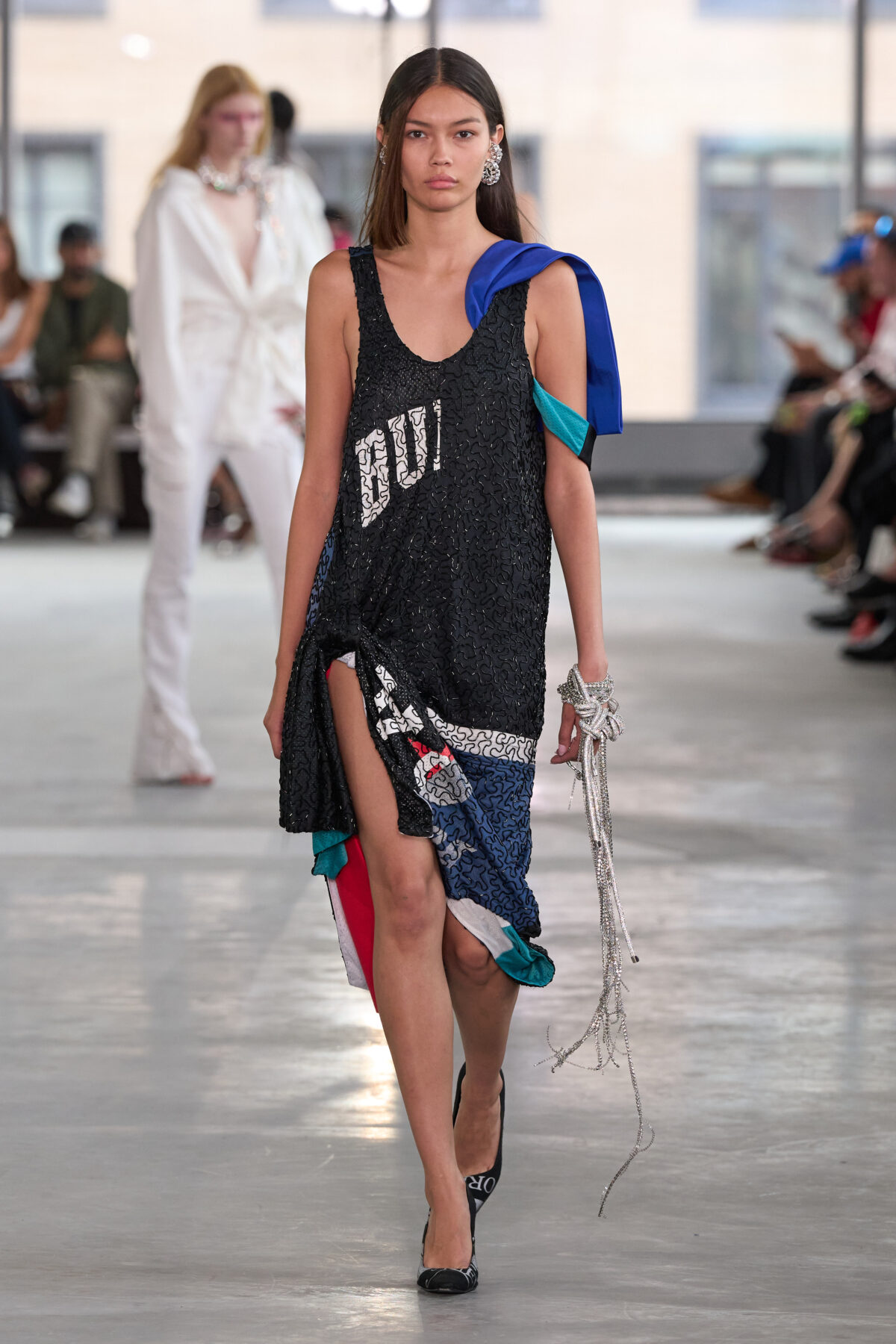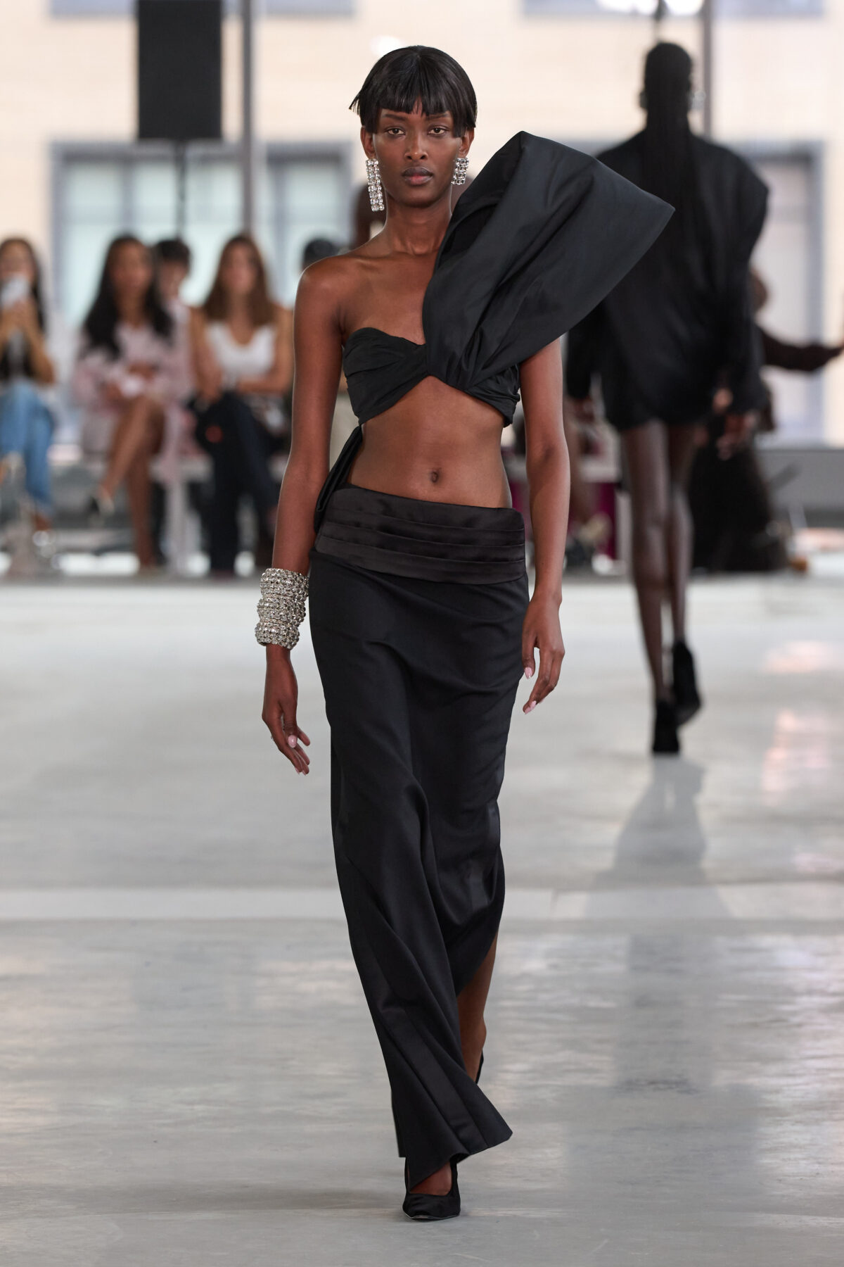 Soon enough the sparkle appeared; in tiny skirts and cropped bandeau tops made from those very same bedazzled drawstrings, seemingly gathered, wrapped and tied around the body, and then later in a more chaotic style of tangled strings of crystals (a bustier mini-dress worn over a sweet cotton-eyelet trimmed bra immediately read as Life of a Showgirl-ready). Denim has always been a big part of Area’s offering, and here we had long and lean jeans with trompe l’oeil layered jorts on top, wide leg jeans with slashes on the knees and legs that exposed a black satin or bedazzled lining, and the piece-de-resistance, a miniskirt with a bow on the front made by tying the two pant legs together. It was so well-constructed that for a second it looked like they had somehow managed to make it from a regular pair of jeans. “I really, really wanted to, but it’s slightly different,” Aburn explained. “We got pretty close.” He expects the skirt to go into production.