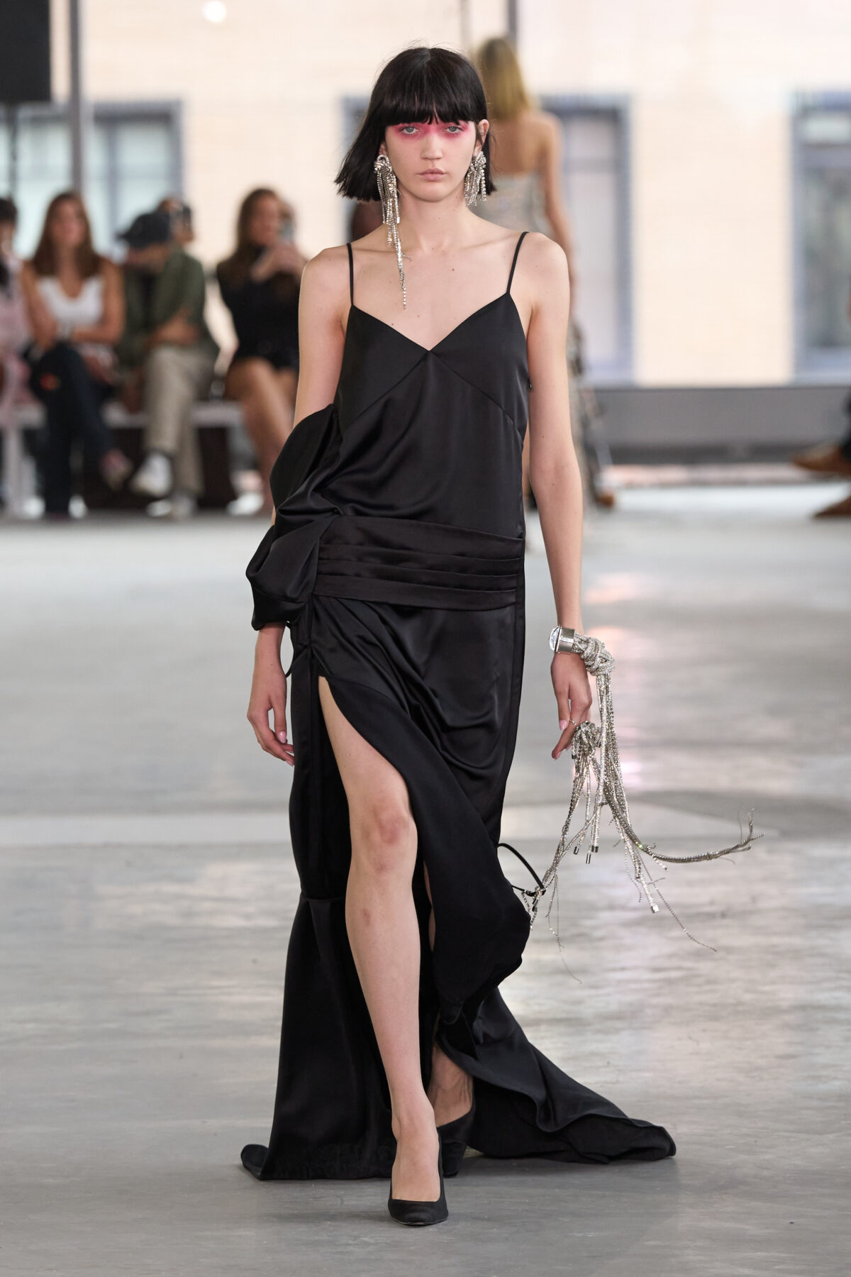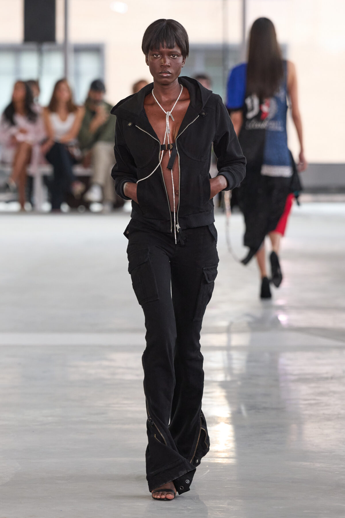 Well, it was 10:29 in the morning when the show began, and everyone in the room definitely felt like anything could happen when the first model walked out. She wore a slim cotton sweatsuit with cropped cargo pants over a tank with an extra long and extra sparkly zipper pull that could have stood in for a necklace, except she was also wearing a necklace, fashioned like a hoodie drawstring, bedazzled in silver and wrapped around her neck like a lariat. It was as jarring as any of the more conceptual looks that have graced the Area runway in the past three years, yet it also made perfect sense. After all, the brand first made its mark in New York ten years ago with cool girl party clothes.