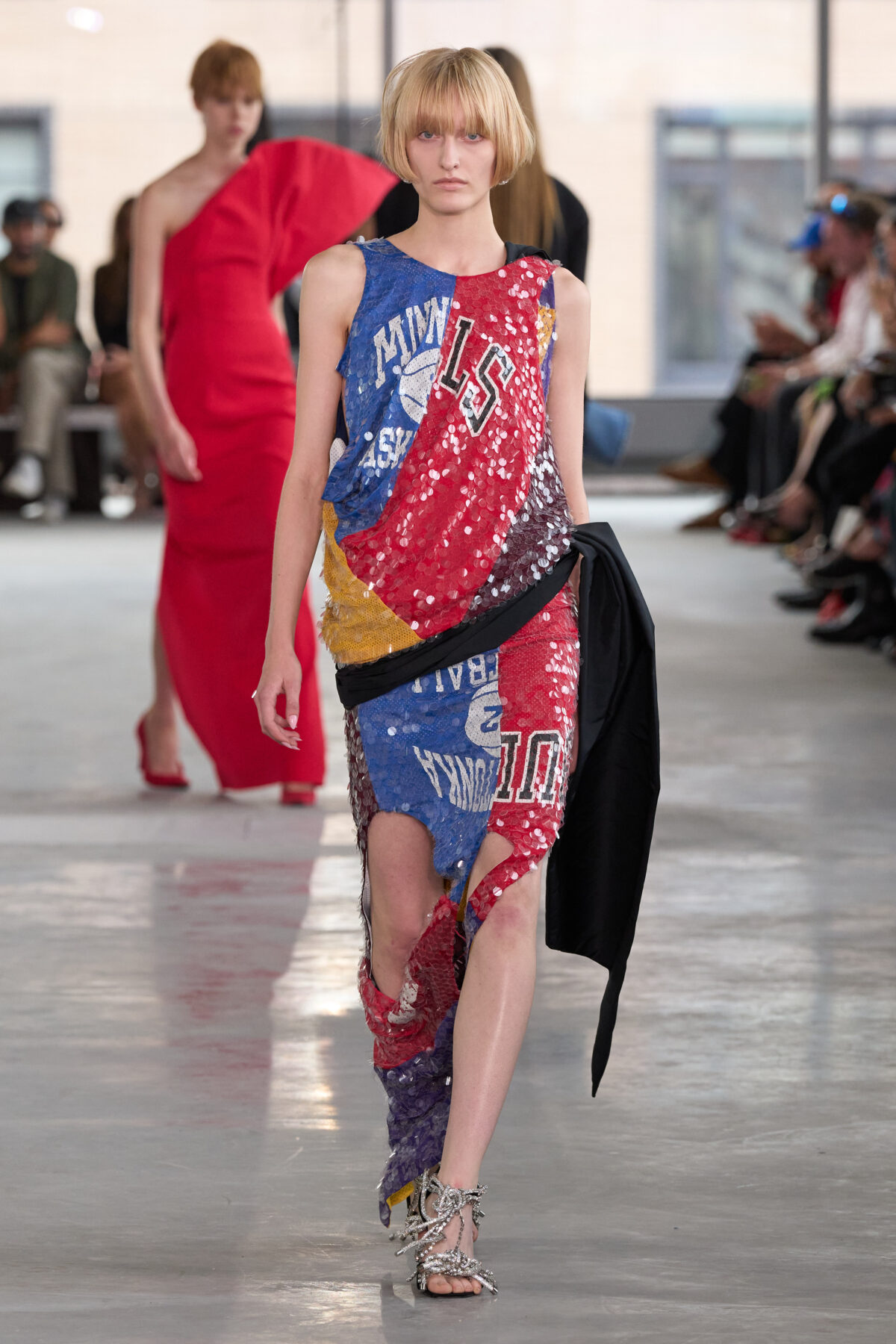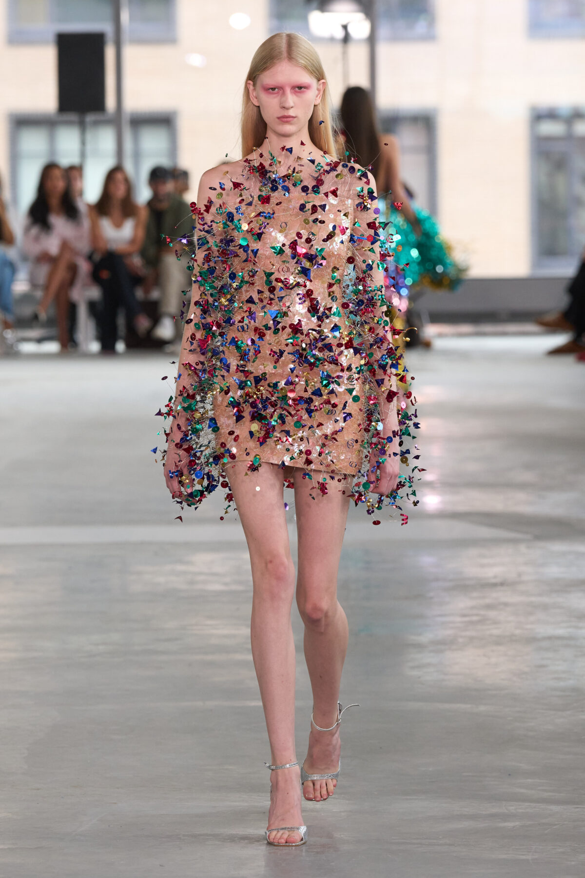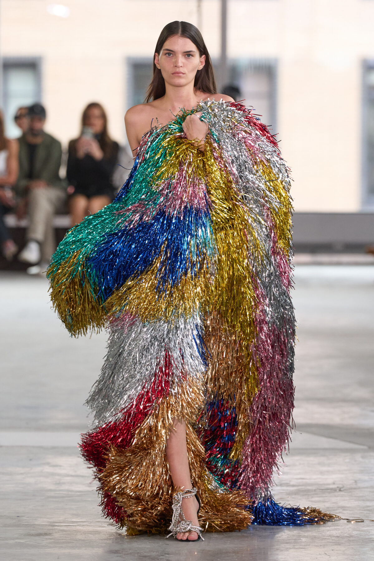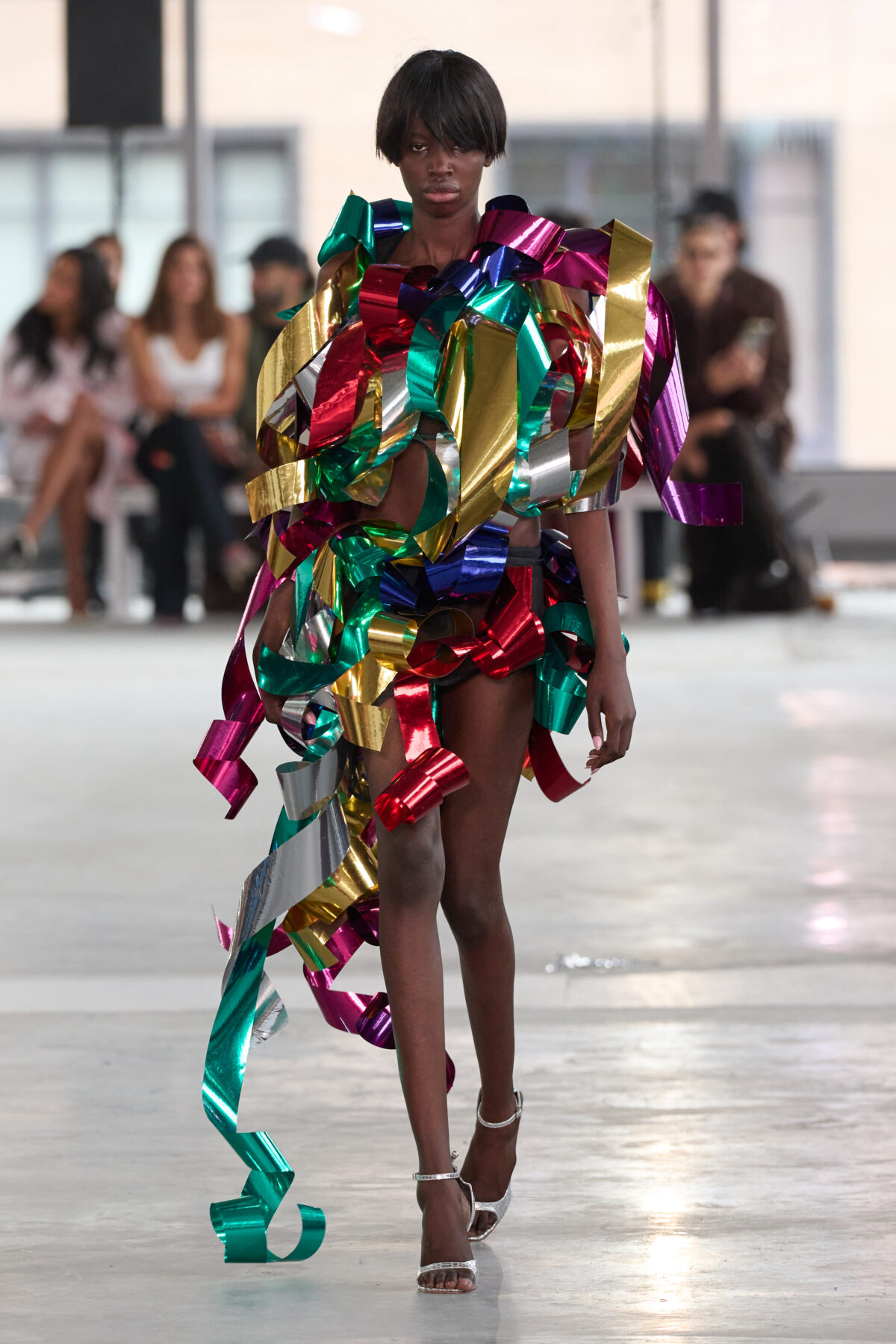 It is Aburn’s “open to whatever attitude” that made this collection a standout. As the show progressed, the marching band soundtrack got louder and reached its crescendo as models stepped out in “gowns” made entirely from colorful tinsel, larger-than-life silver sequins, and confetti galore. It was simply joyful; the cherry on top of a confident debut that brought a sense of fun—dare we even say whimsy?—to New York fashion.