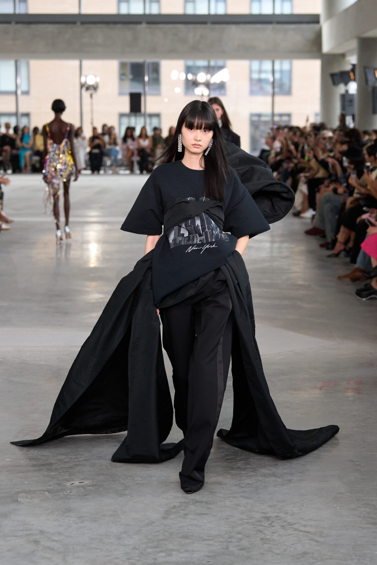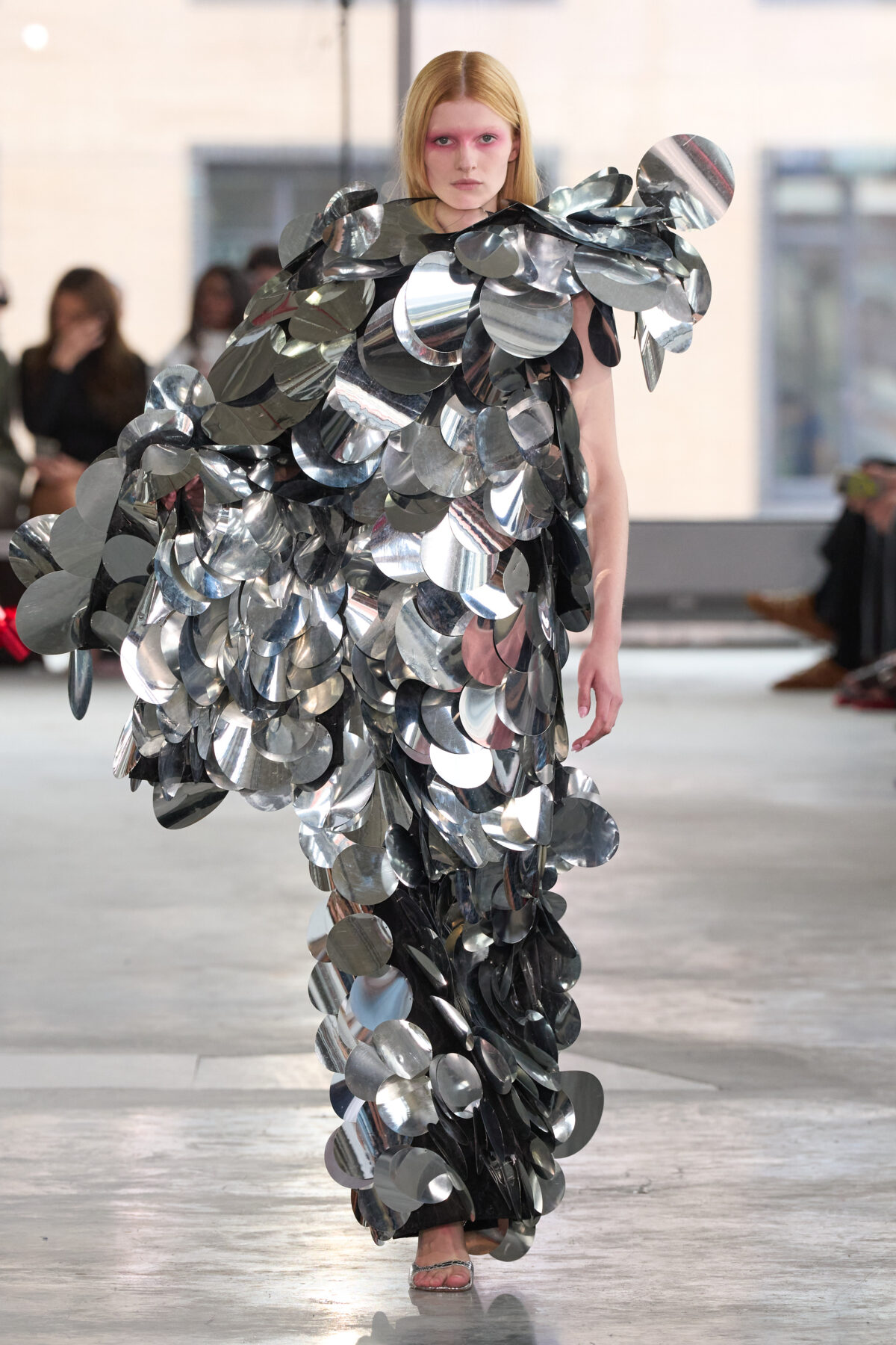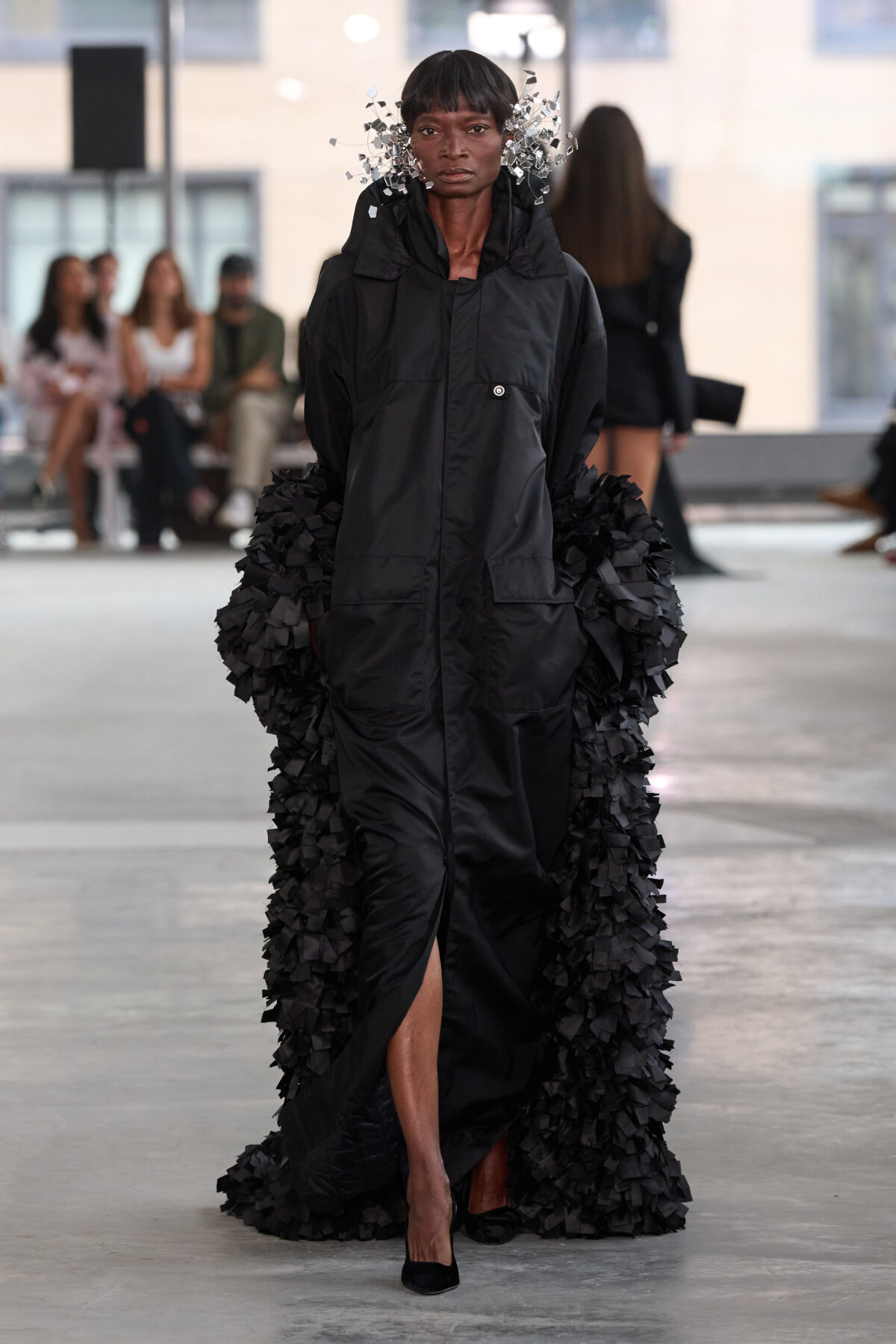 It is Aburn’s “open to whatever attitude” that made this collection a standout. As the show progressed, the marching band soundtrack got louder and reached its crescendo as models stepped out in “gowns” made entirely from colorful tinsel, larger-than-life silver sequins, and confetti galore. It was simply joyful; the cherry on top of a confident debut that brought a sense of fun—dare we even say whimsy?—to New York fashion.