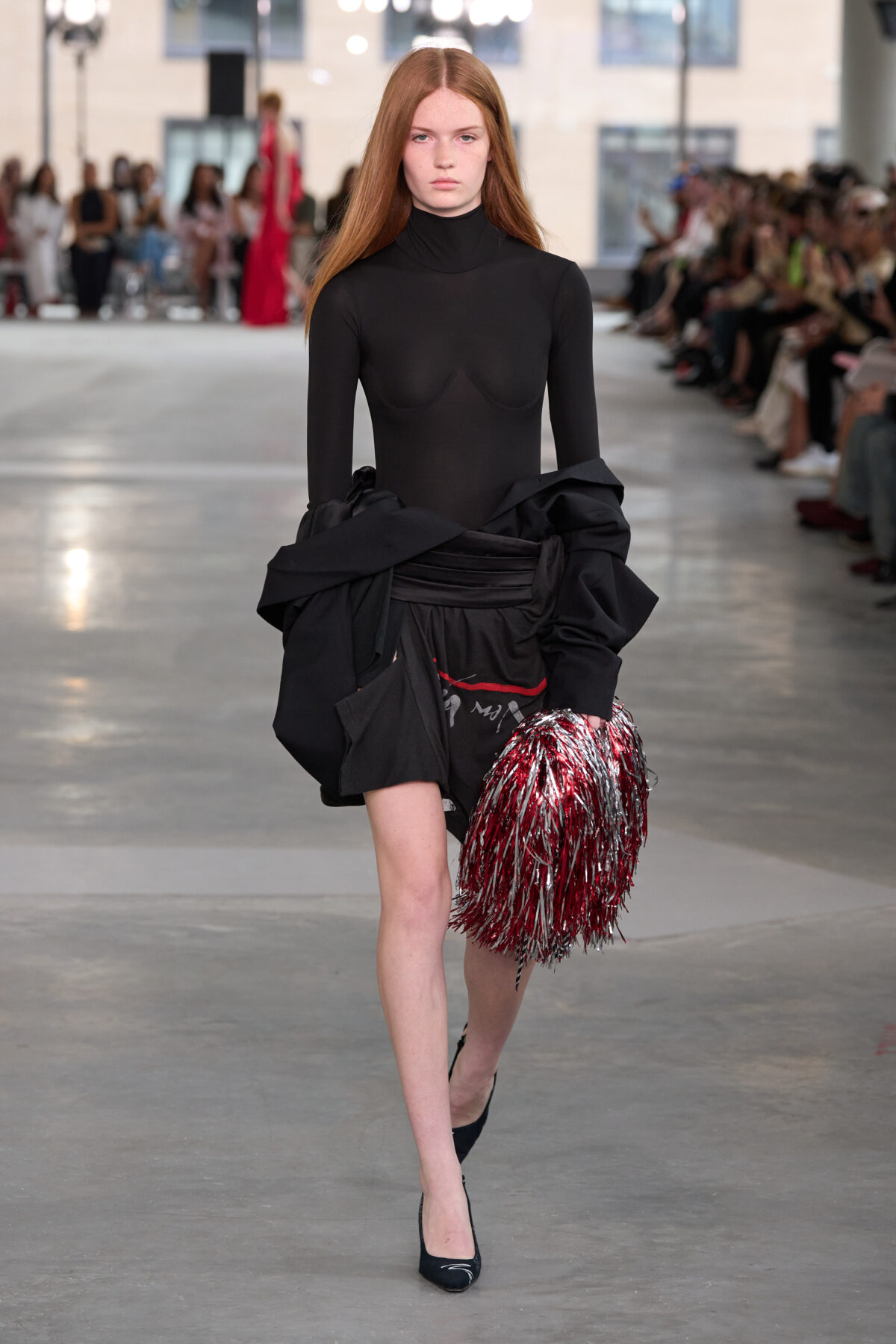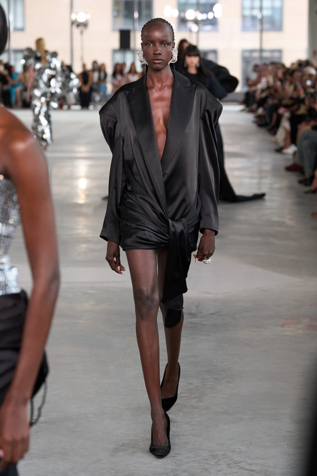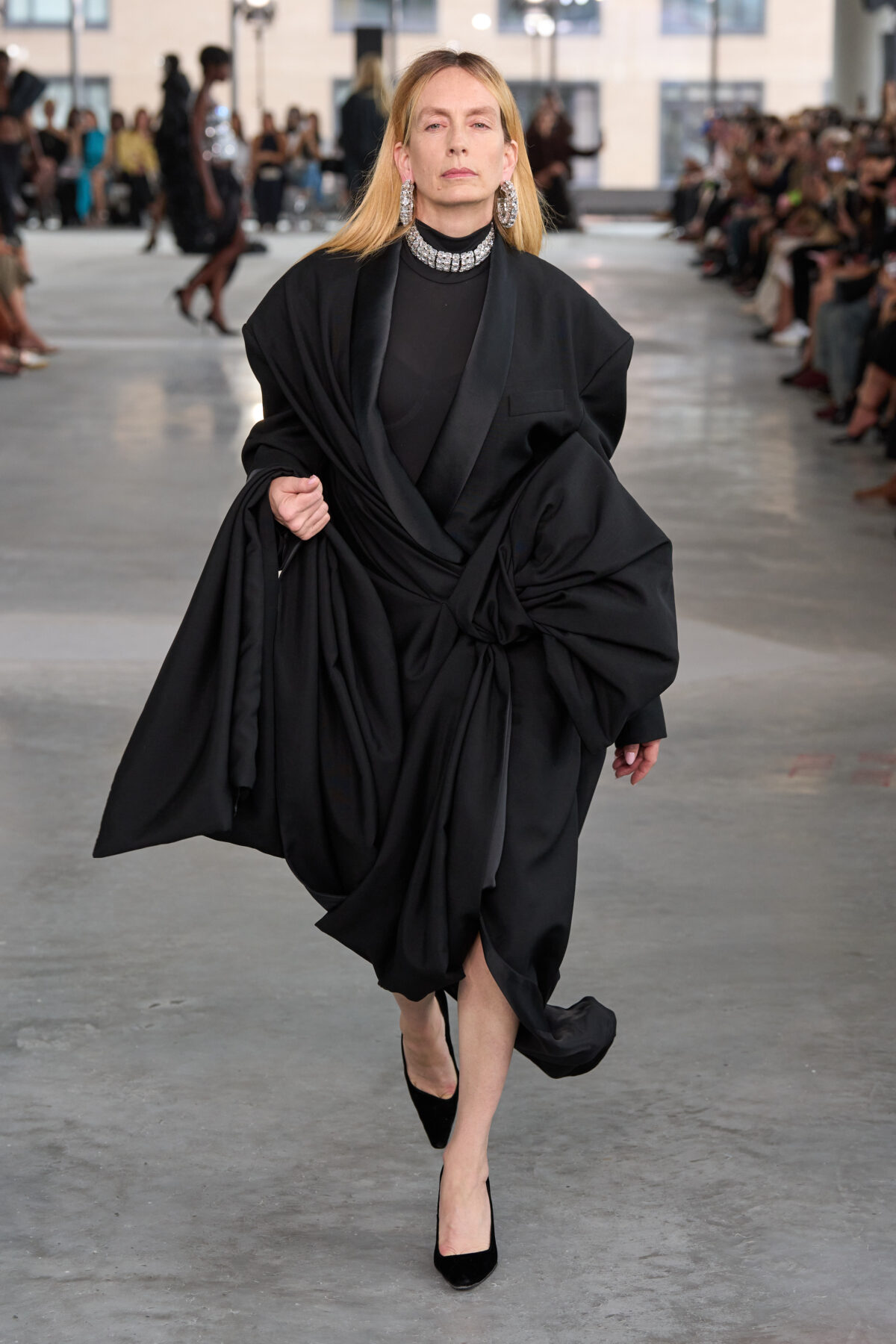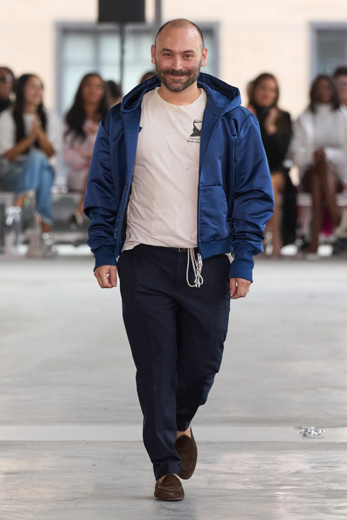 It is Aburn’s “open to whatever attitude” that made this collection a standout. As the show progressed, the marching band soundtrack got louder and reached its crescendo as models stepped out in “gowns” made entirely from colorful tinsel, larger-than-life silver sequins, and confetti galore. It was simply joyful; the cherry on top of a confident debut that brought a sense of fun—dare we even say whimsy?—to New York fashion.
