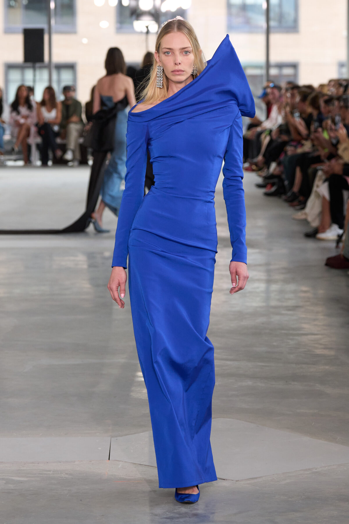 Elsewhere a pair of dramatic architectural gowns in royal blue, American red, and yes, denim, showed off his red carpet bonafides (his first job after graduating from Central St. Martins was as a VIP designer at Tom Ford). “The brand is associated with this party ‘thing,’ but I was like, ‘how can we look at ‘party’ differently?’ After we’ve been through this sportswear period, what does dressing up again look like?”