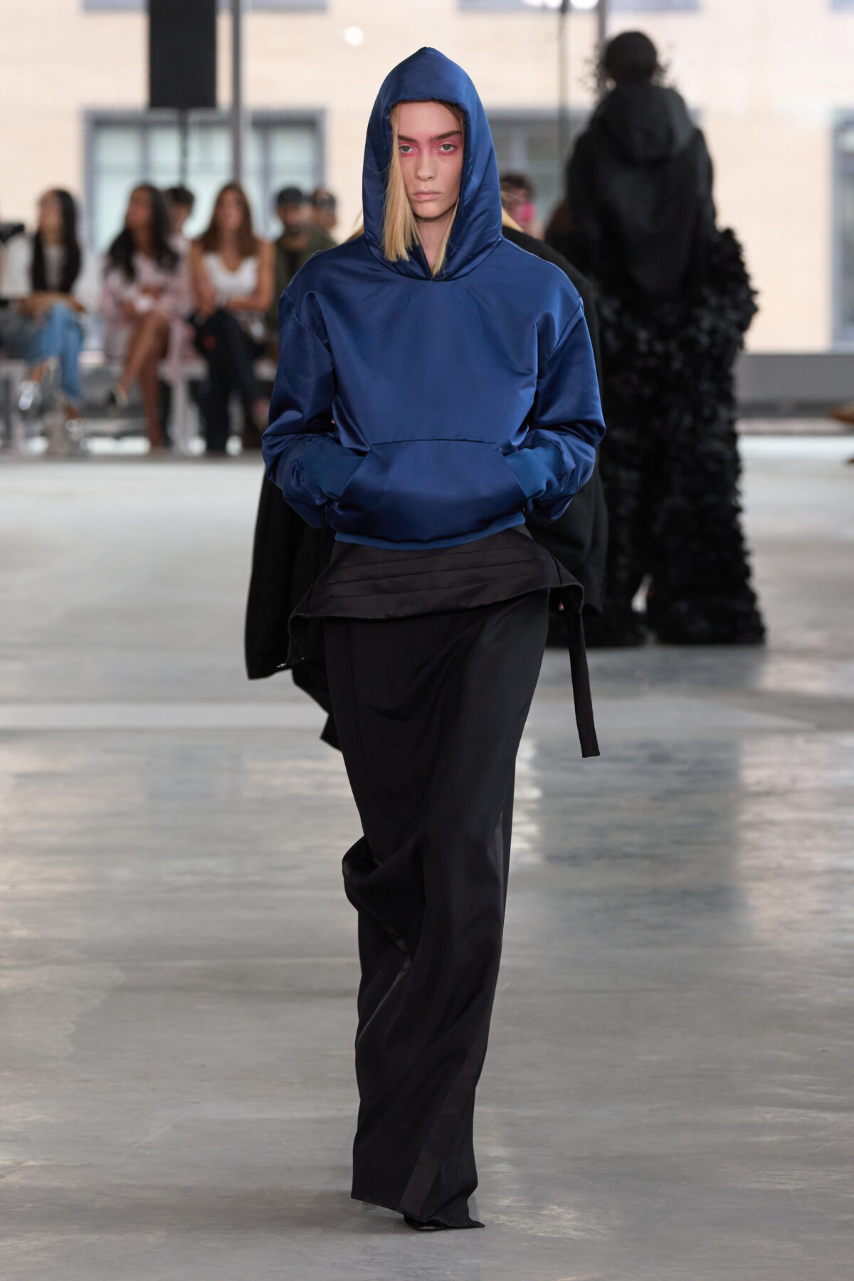 The most exciting pieces were the ones where Aburn merged the two: a shrunken royal blue satin hoodie worn with a black silk long skirt with an undone tuxedo belt at the hips; basketball jerseys spliced together into dresses and covered in clear sequins; the dramatic evening Mac coat. “I just think an evening gown Mac is such a sick thing,” he said.