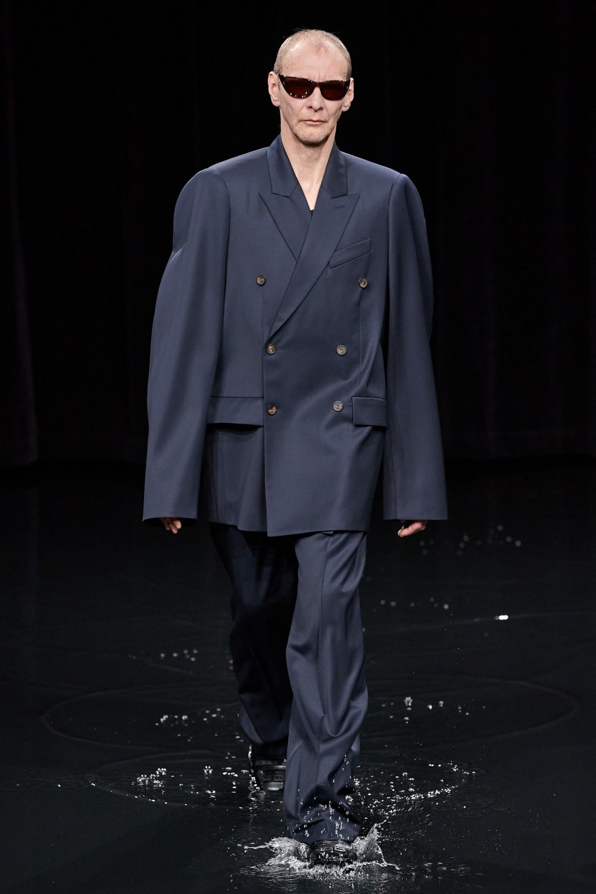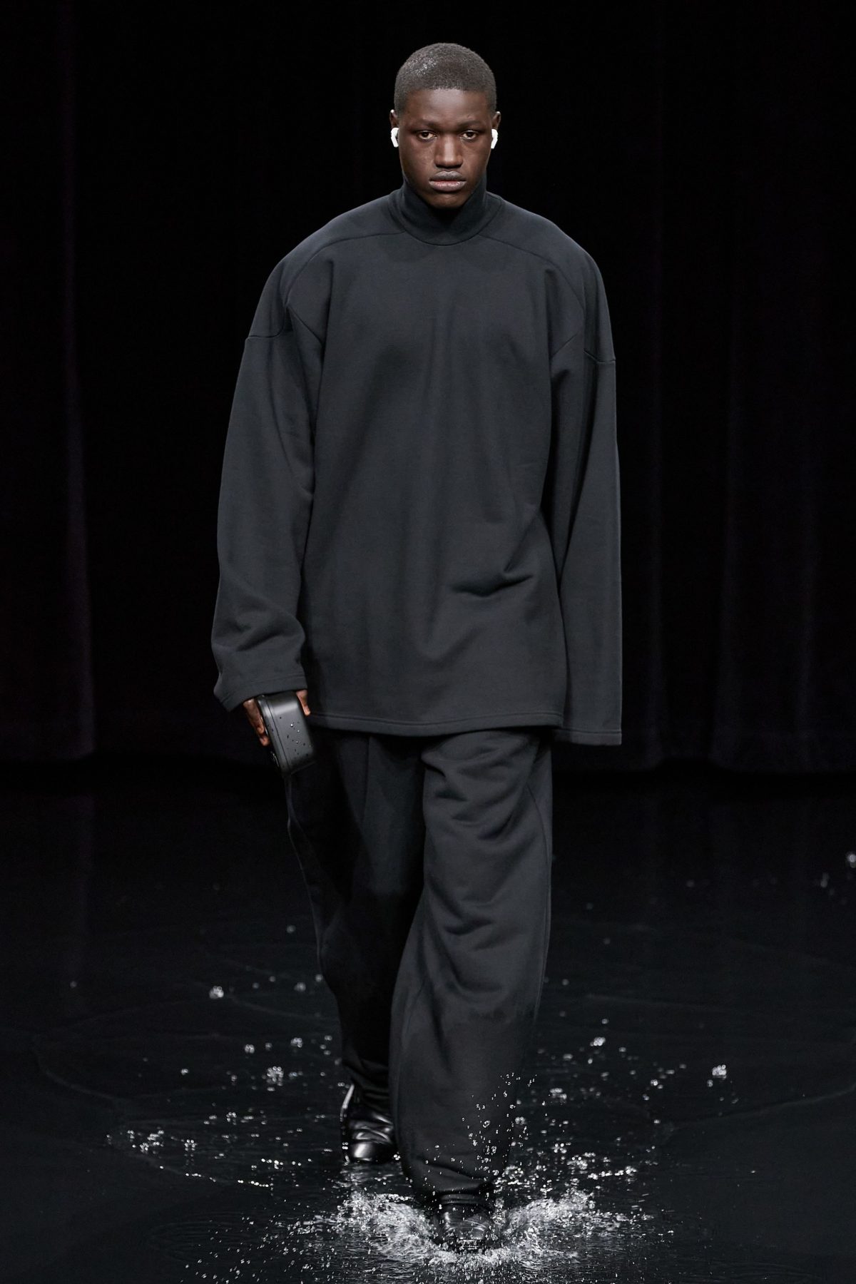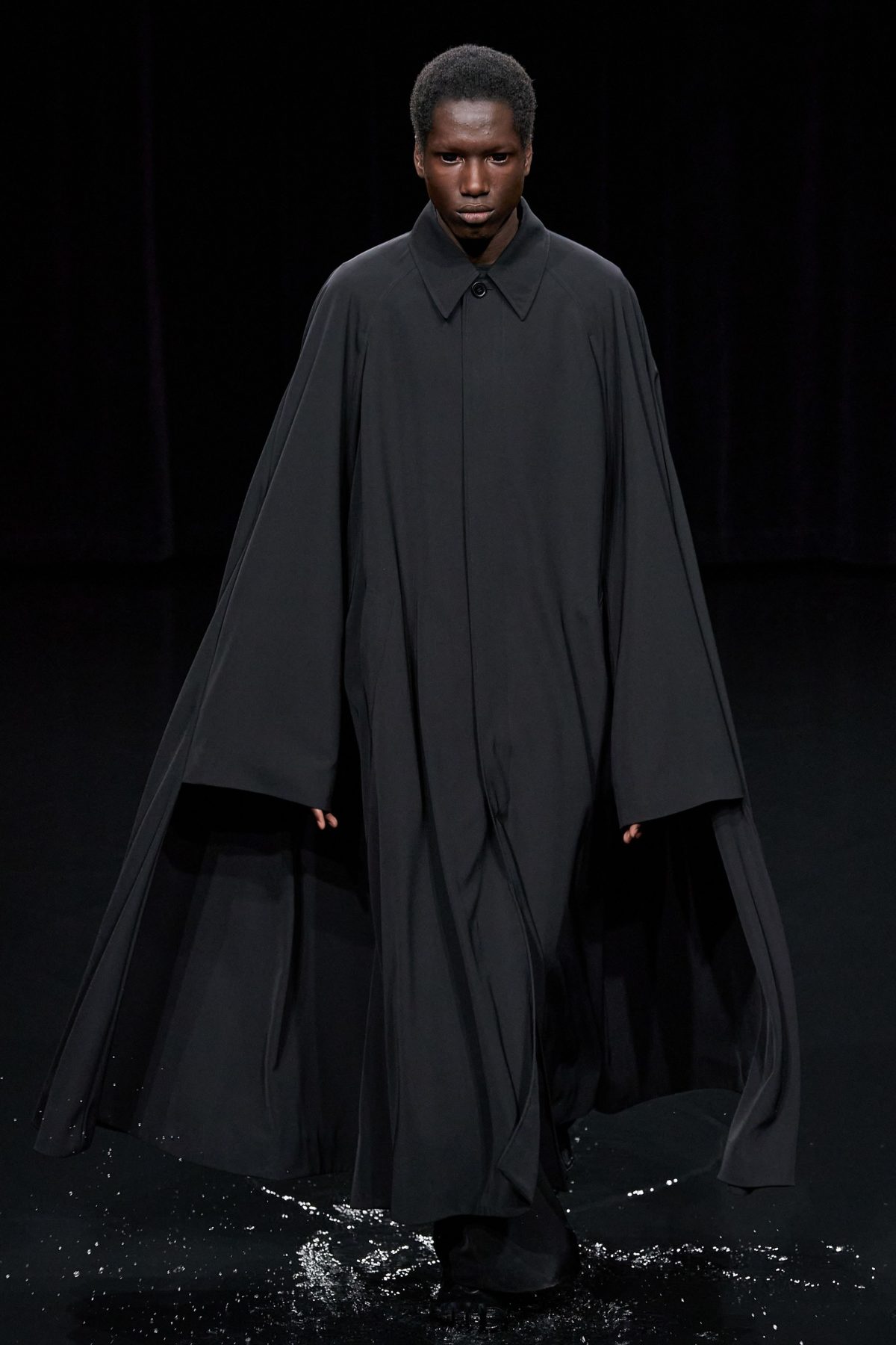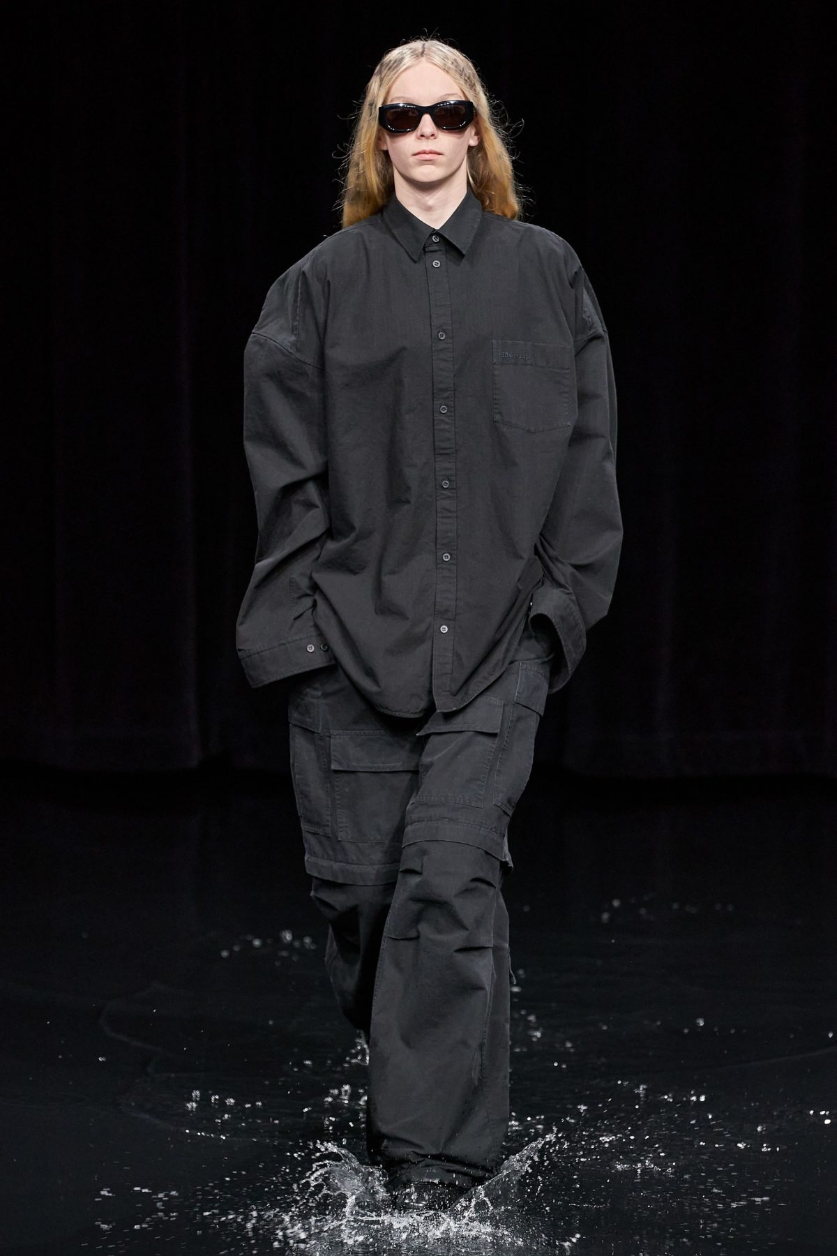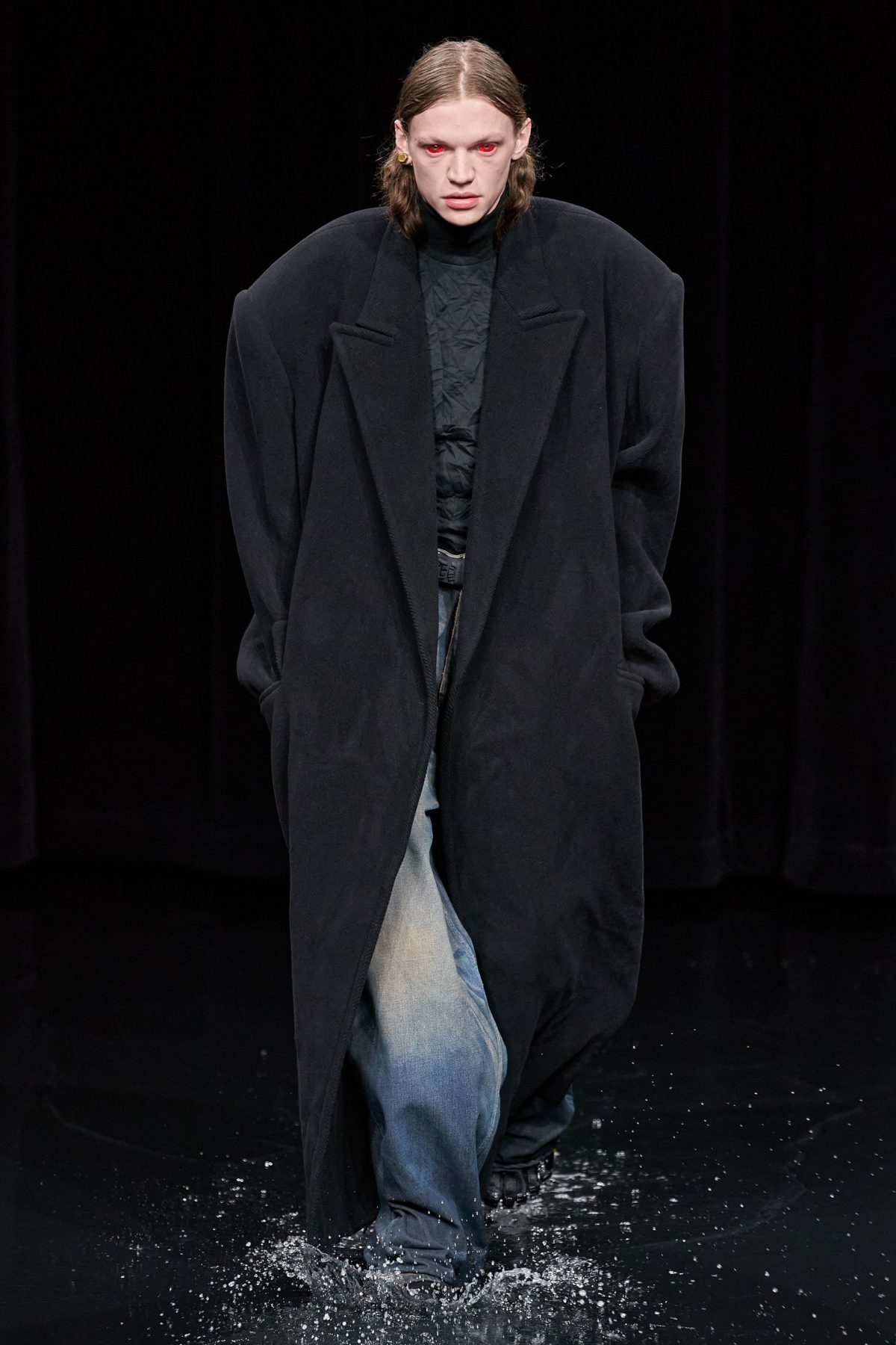 Set in a vast, almost pitch-black auditorium was an immense pool of water disguising the runway, with digital screens above depicting a hellish sky that flashed with lightening, red clouds, satellite shots of Earth, and then finally, a total eclipse. “It’s the blackest show I ever did,” said designer Demna Gvasalia.