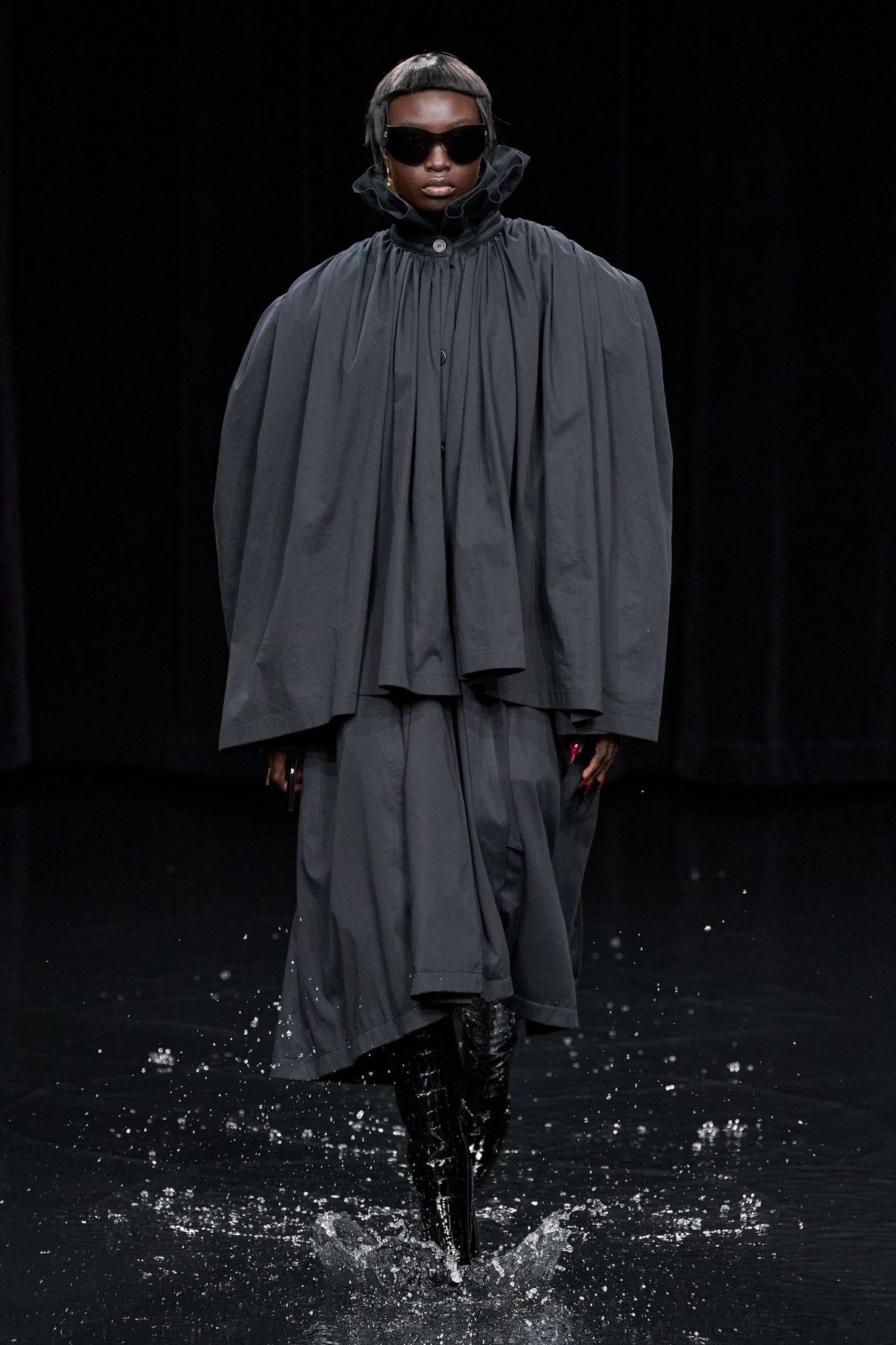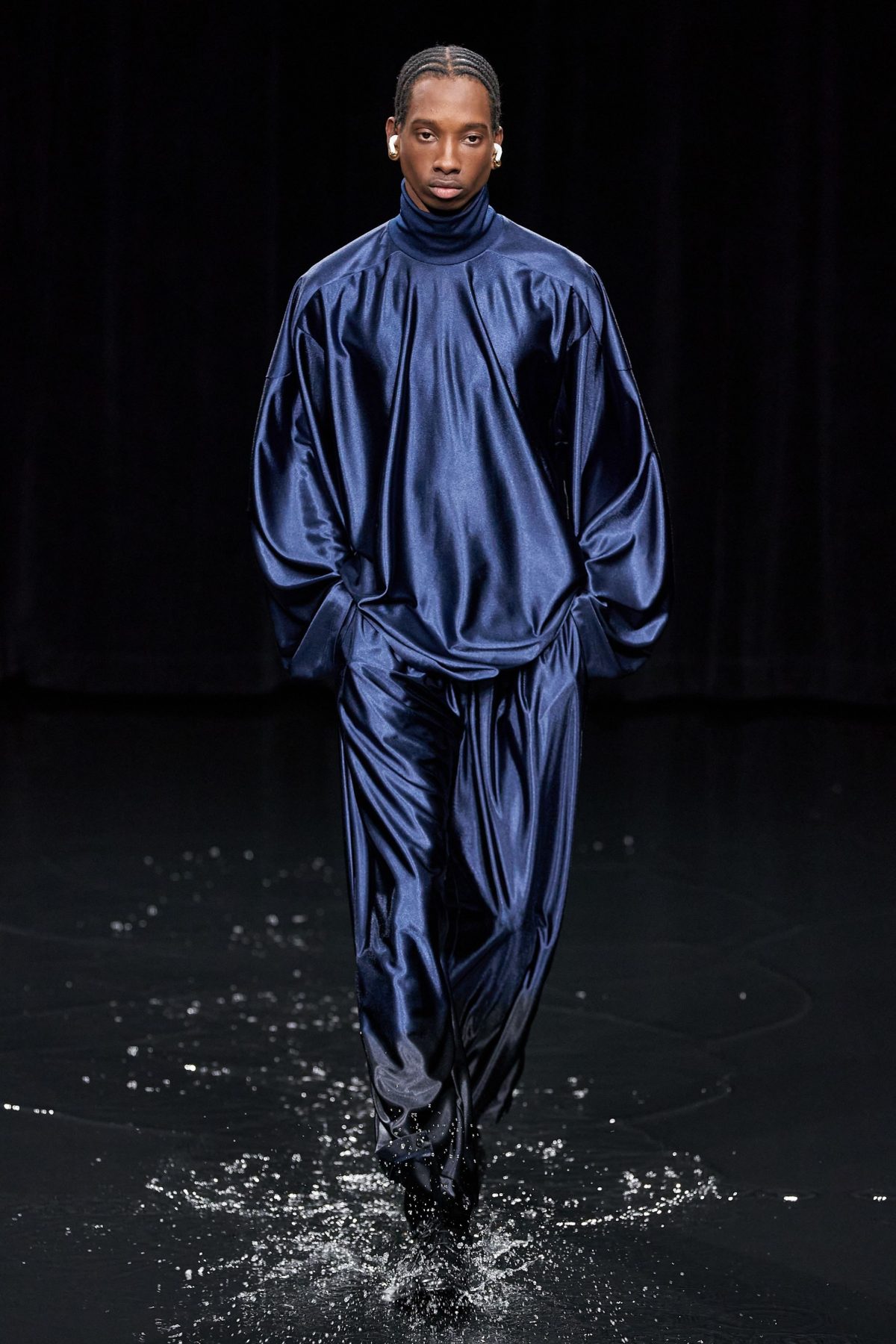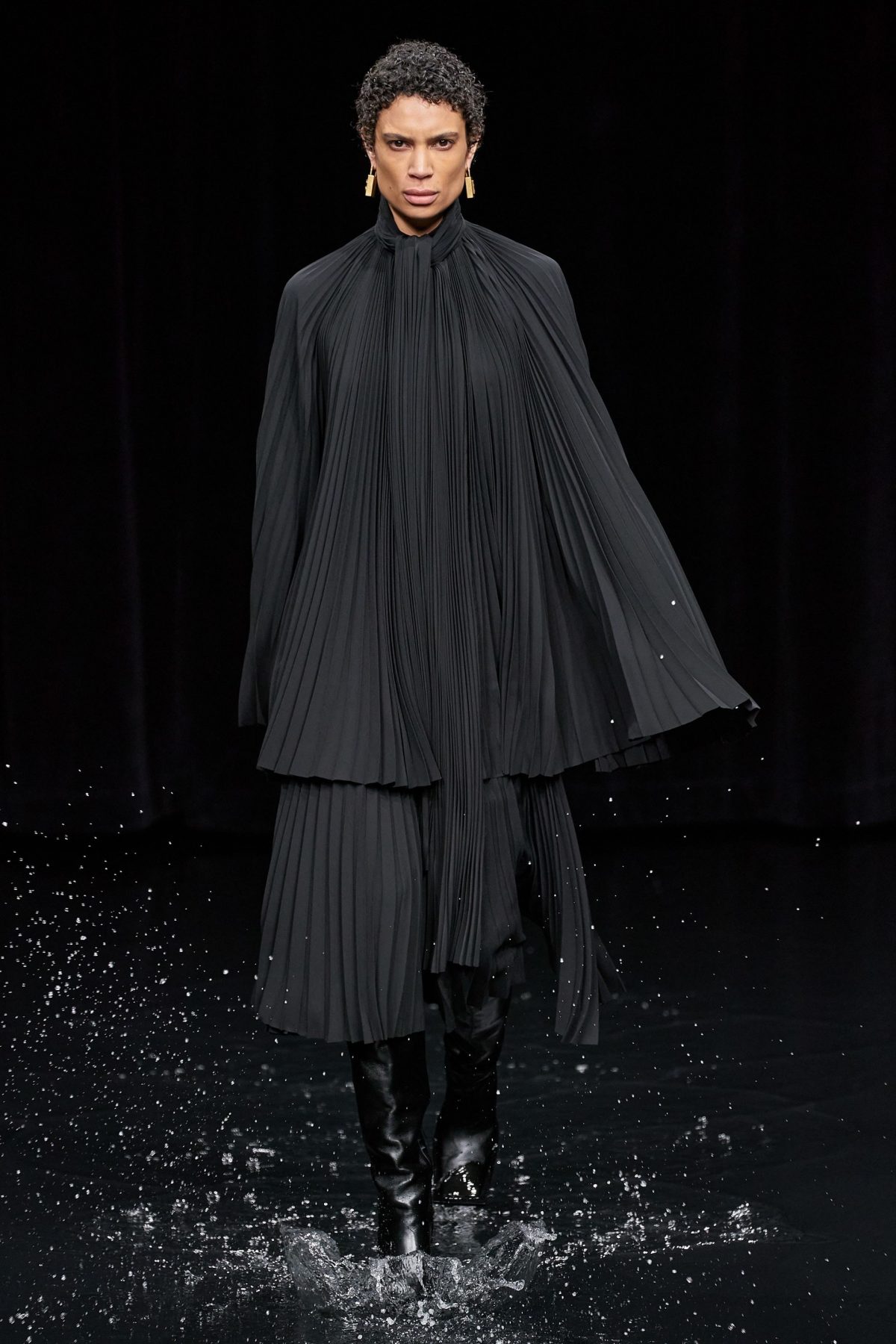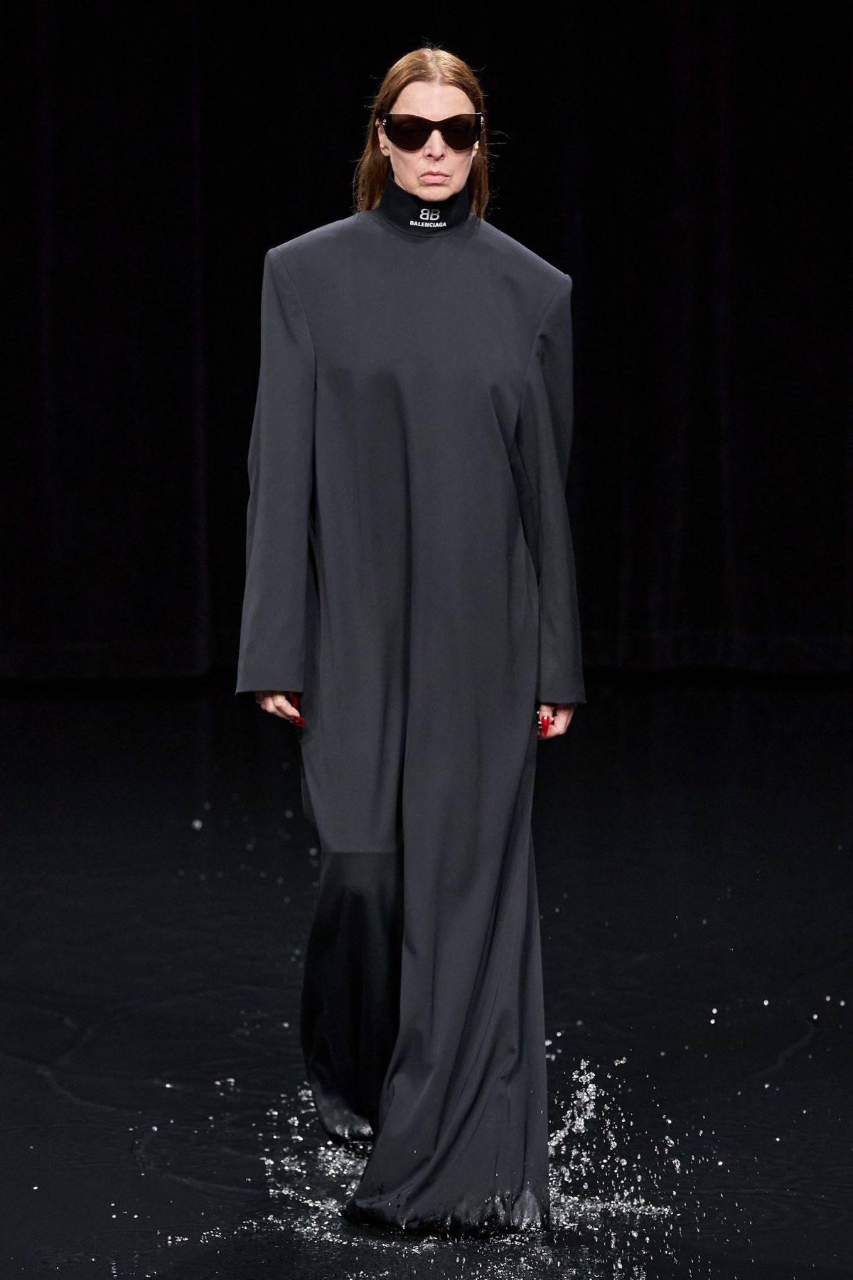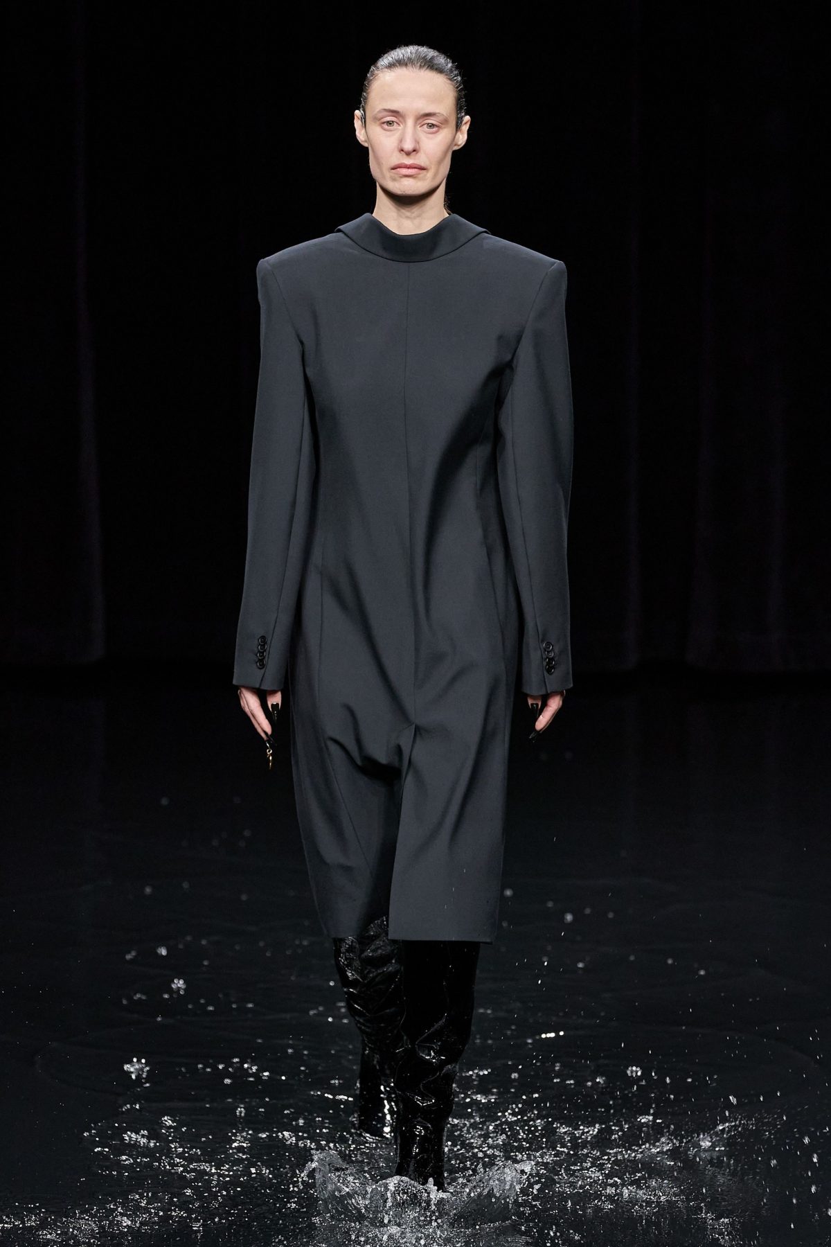 Set in a vast, almost pitch-black auditorium was an immense pool of water disguising the runway, with digital screens above depicting a hellish sky that flashed with lightening, red clouds, satellite shots of Earth, and then finally, a total eclipse. “It’s the blackest show I ever did,” said designer Demna Gvasalia.