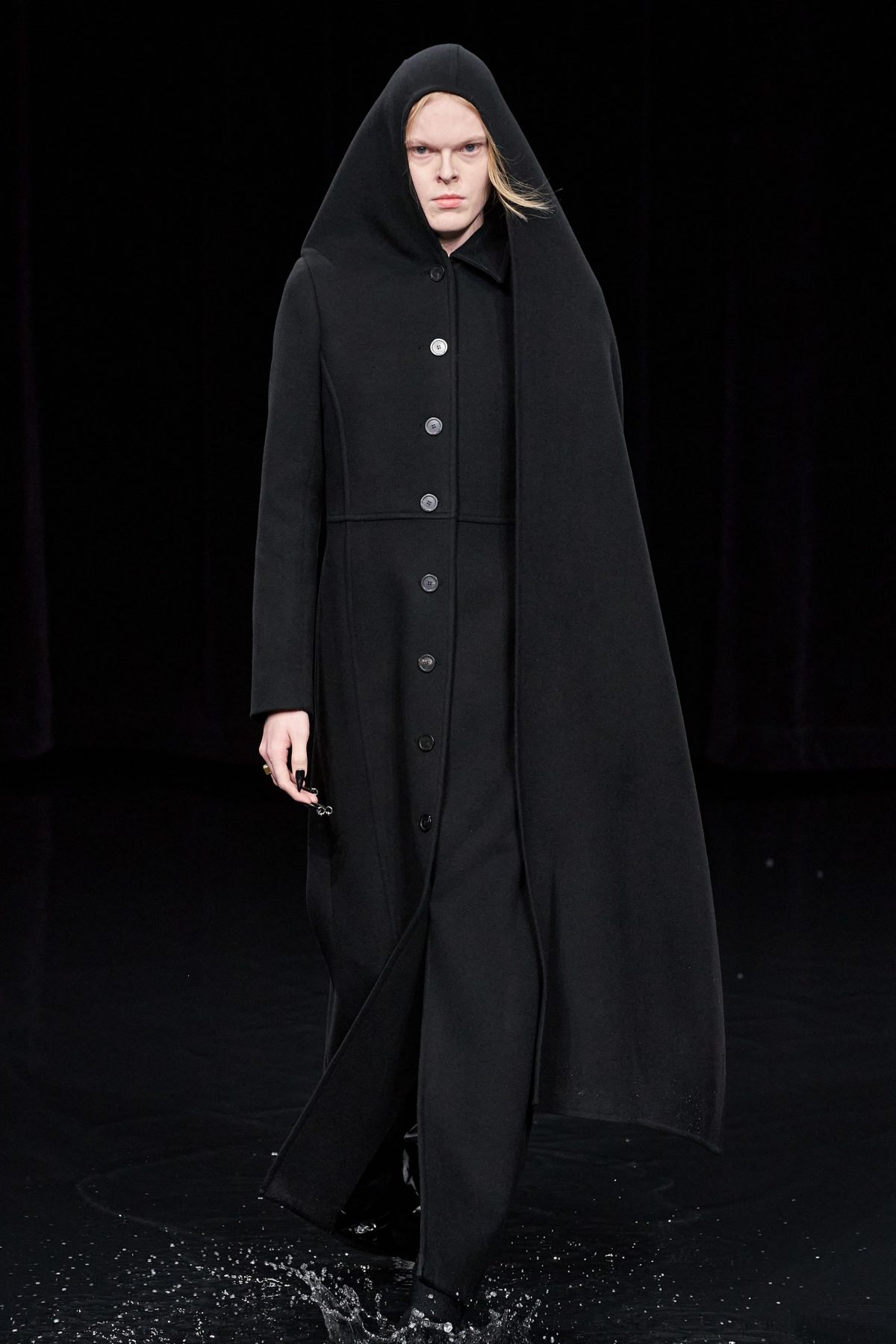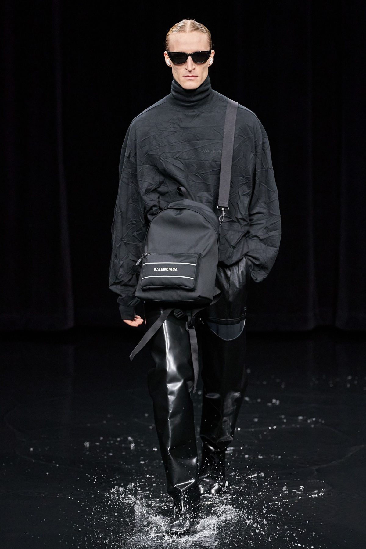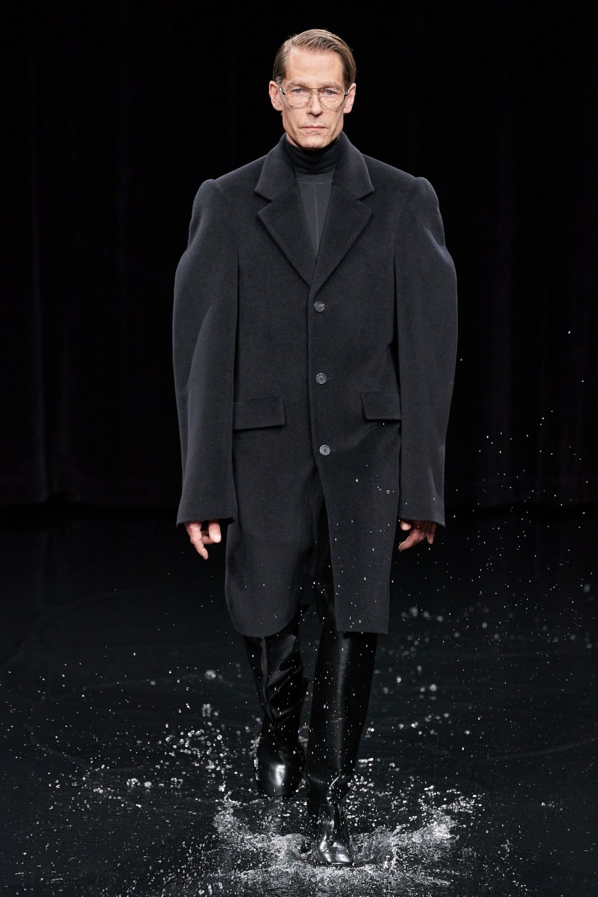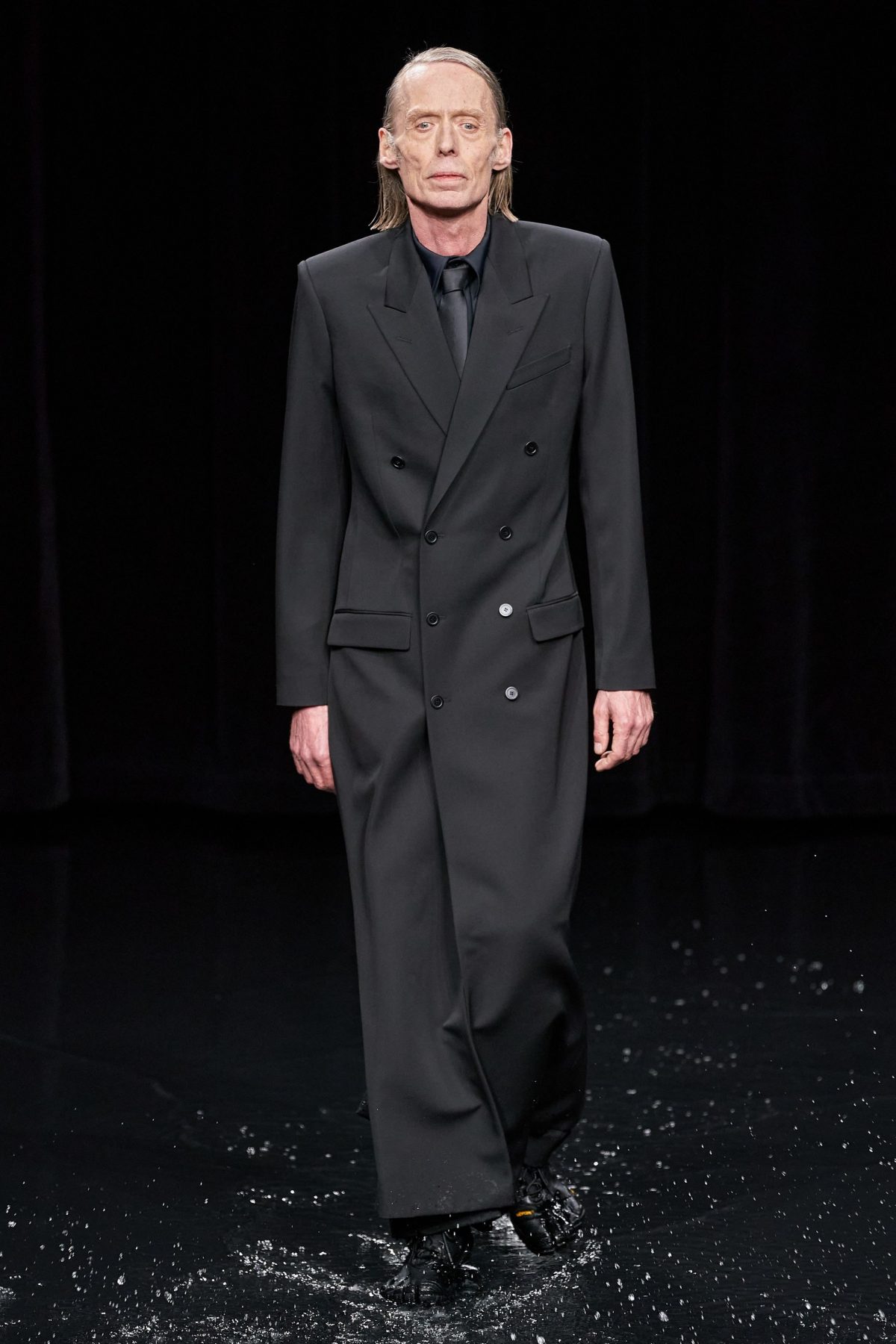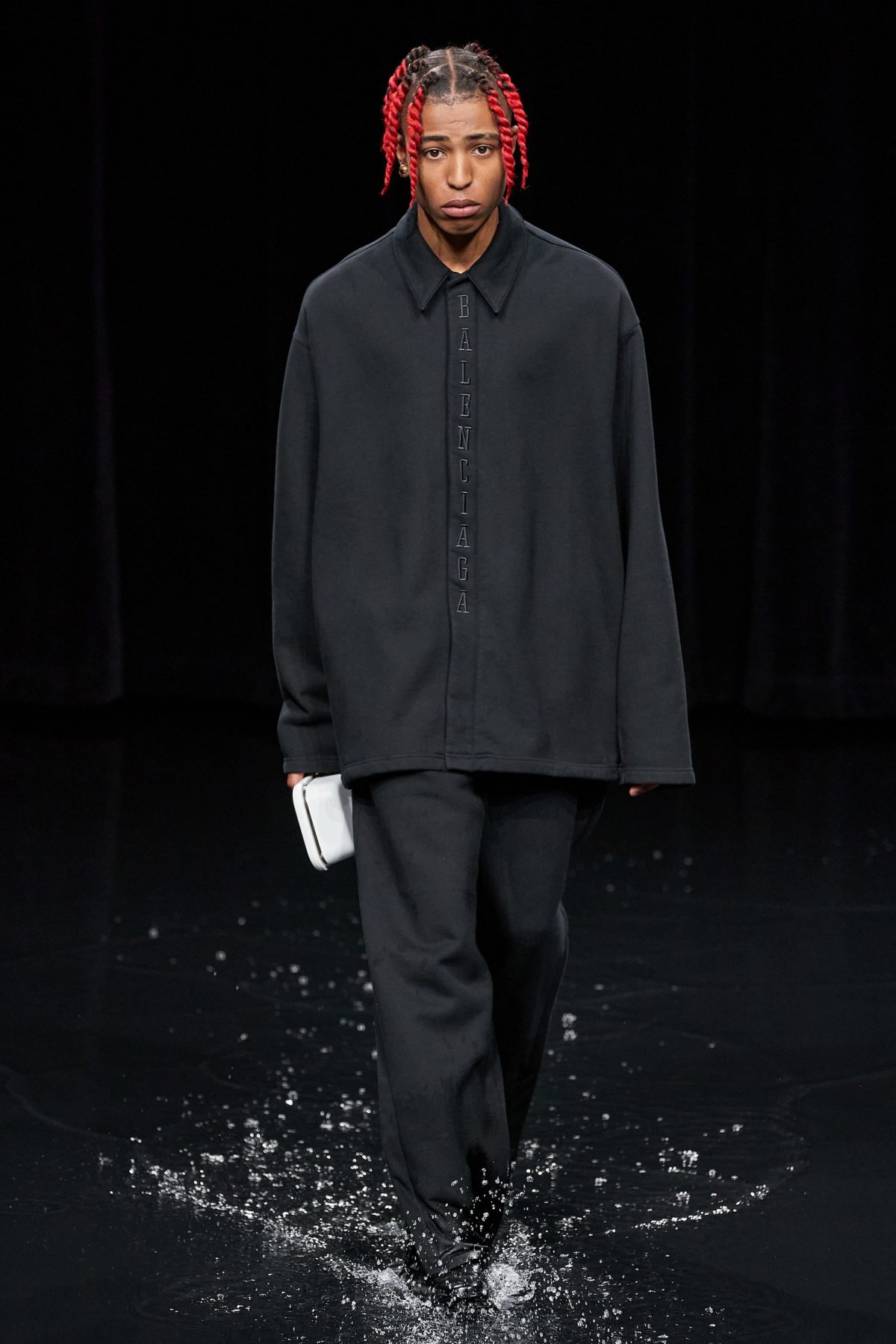 Set in a vast, almost pitch-black auditorium was an immense pool of water disguising the runway, with digital screens above depicting a hellish sky that flashed with lightening, red clouds, satellite shots of Earth, and then finally, a total eclipse. “It’s the blackest show I ever did,” said designer Demna Gvasalia.