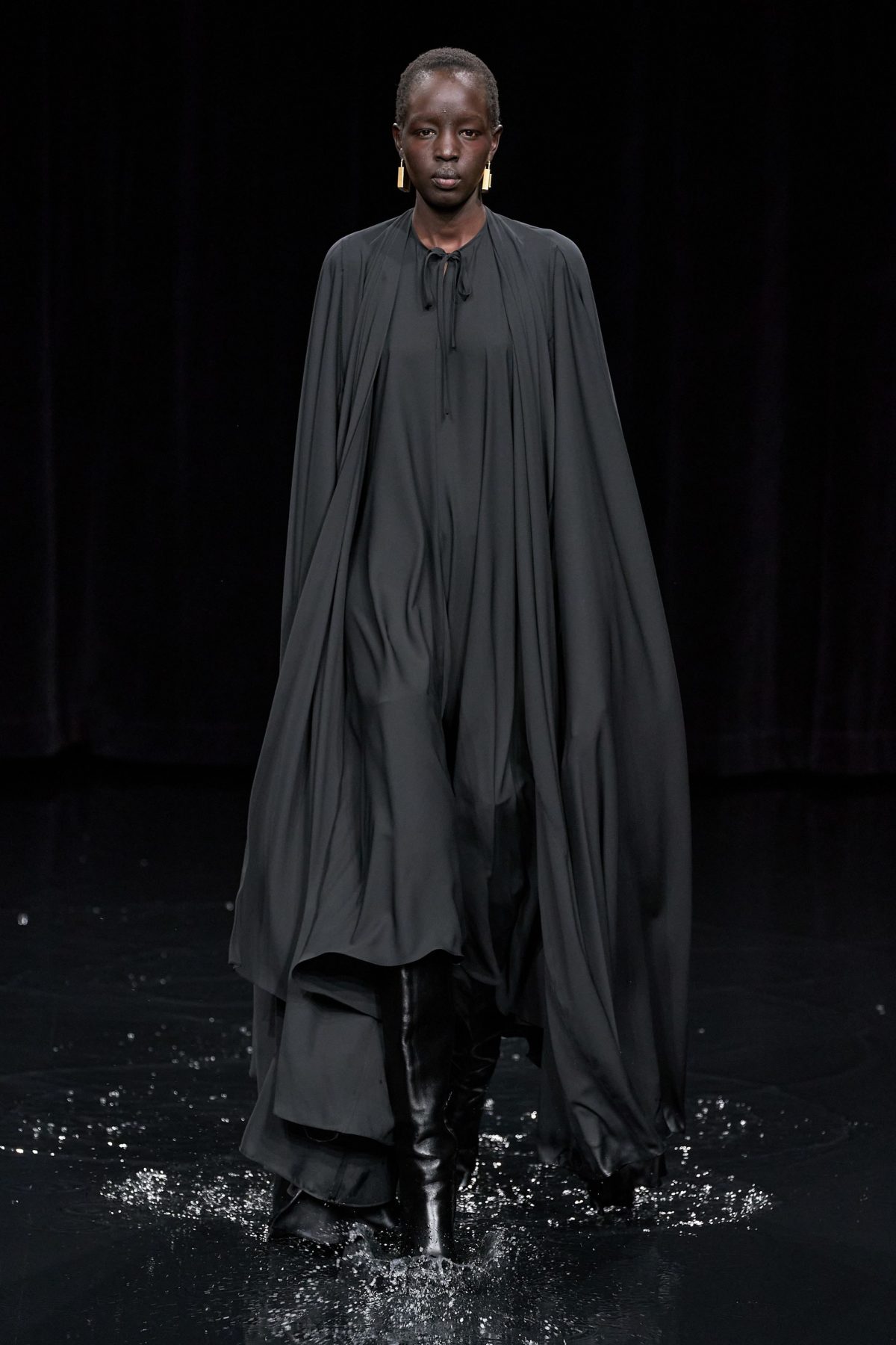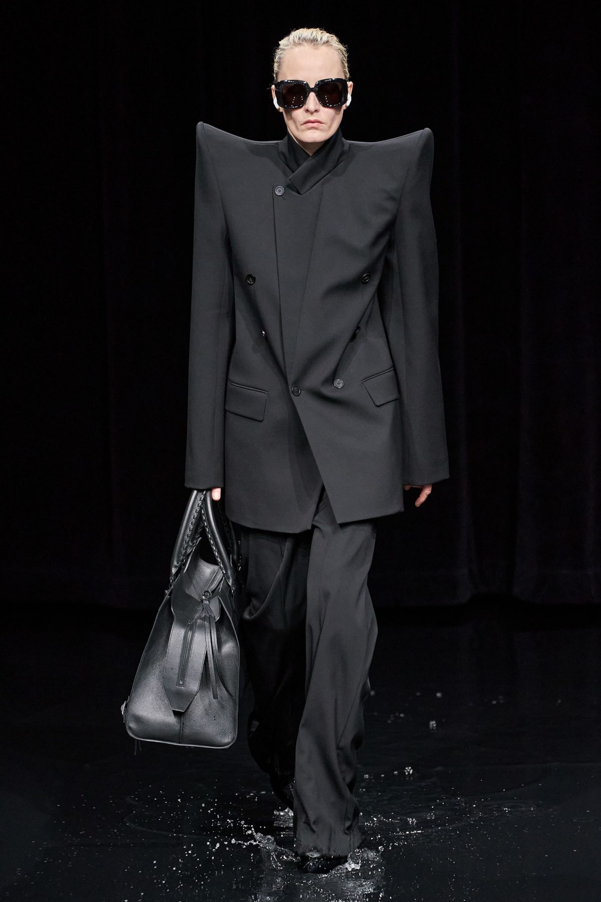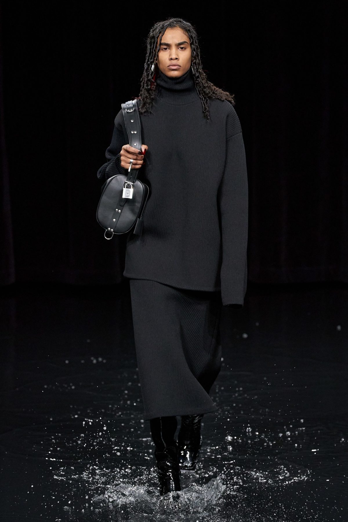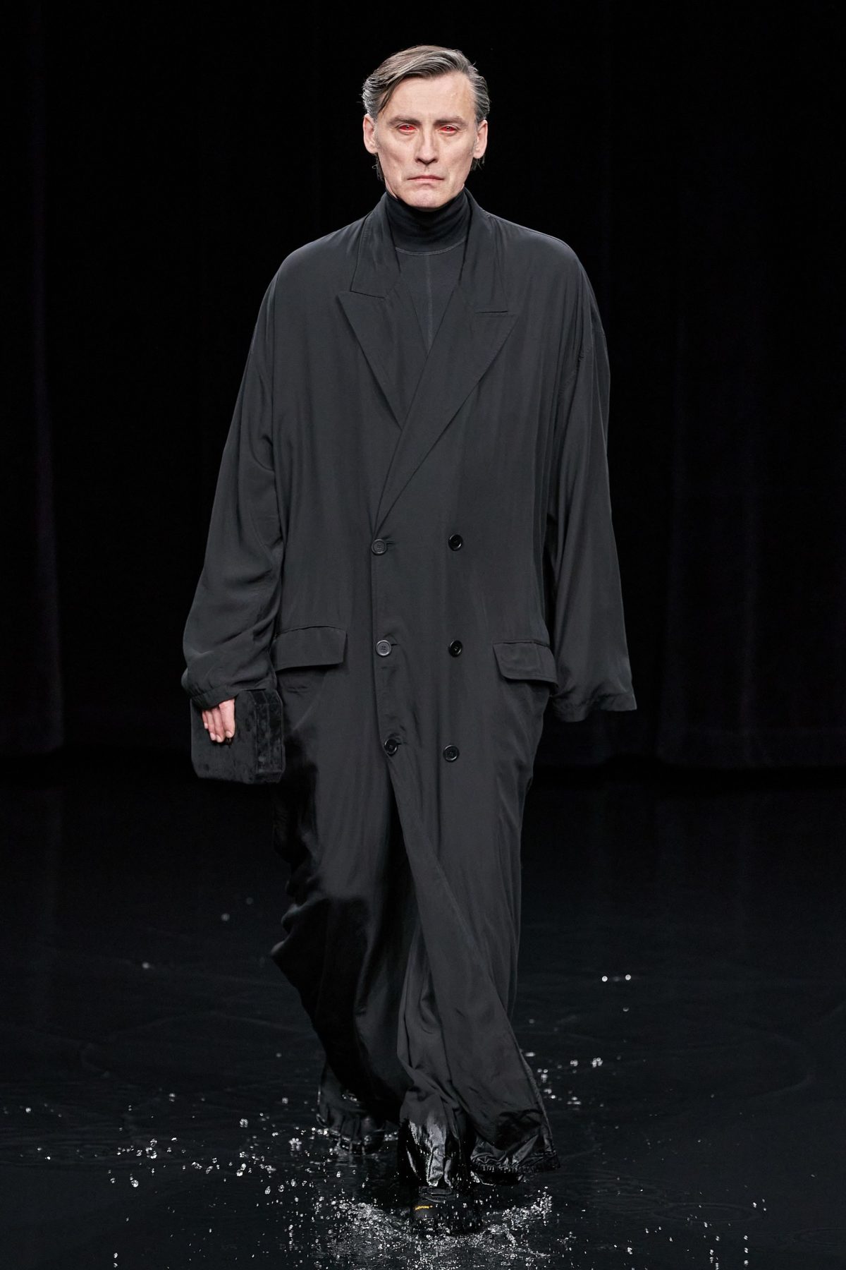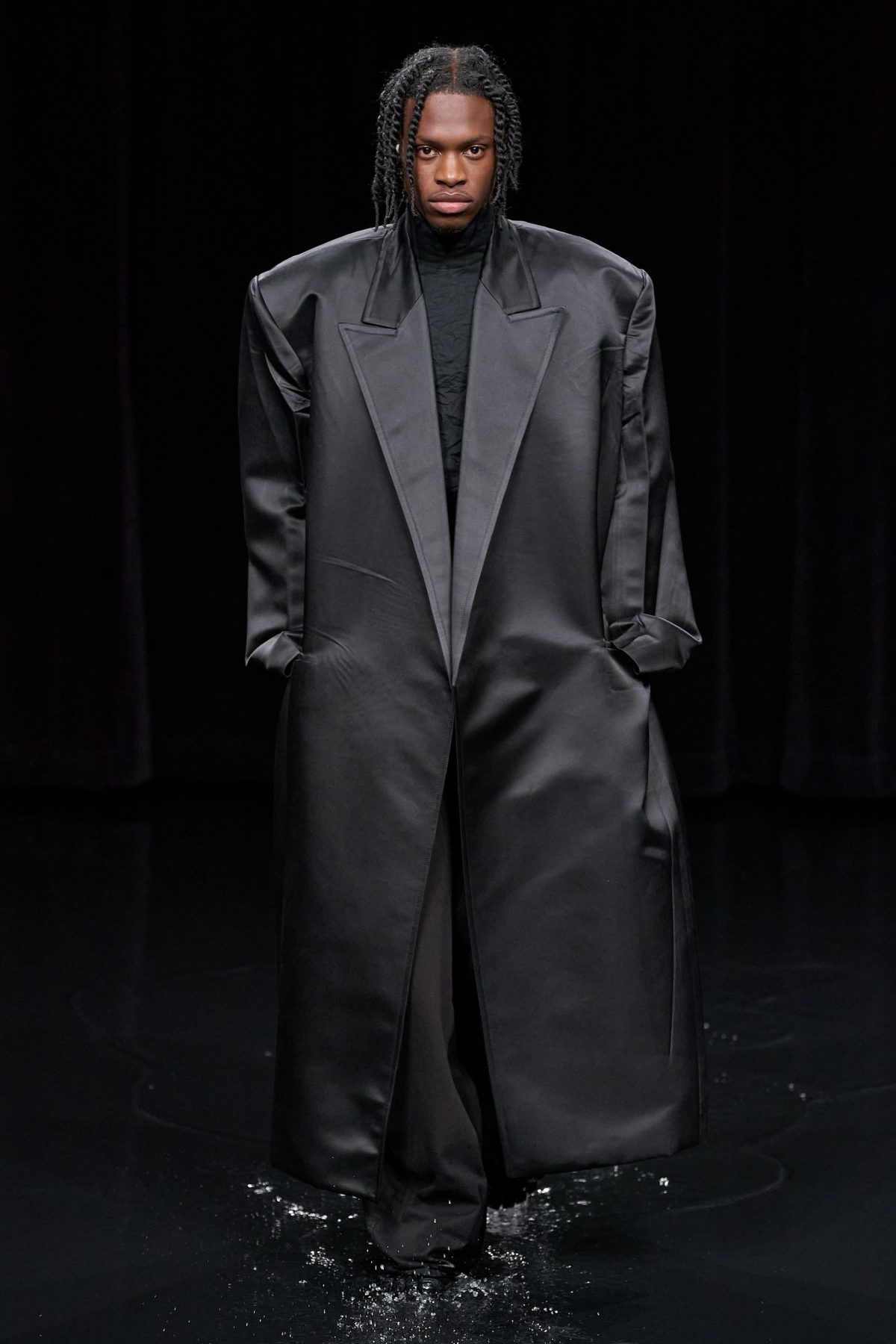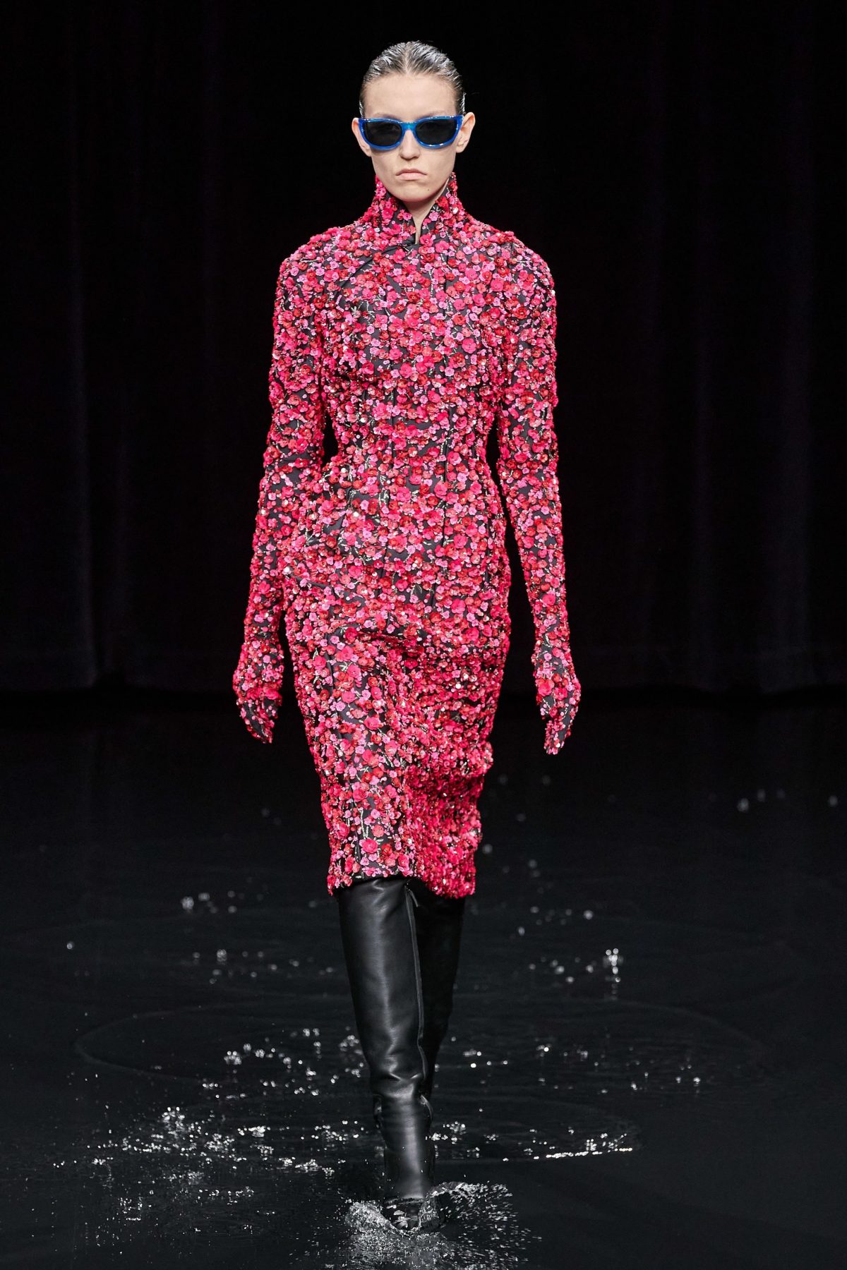 Set in a vast, almost pitch-black auditorium was an immense pool of water disguising the runway, with digital screens above depicting a hellish sky that flashed with lightening, red clouds, satellite shots of Earth, and then finally, a total eclipse. “It’s the blackest show I ever did,” said designer Demna Gvasalia.