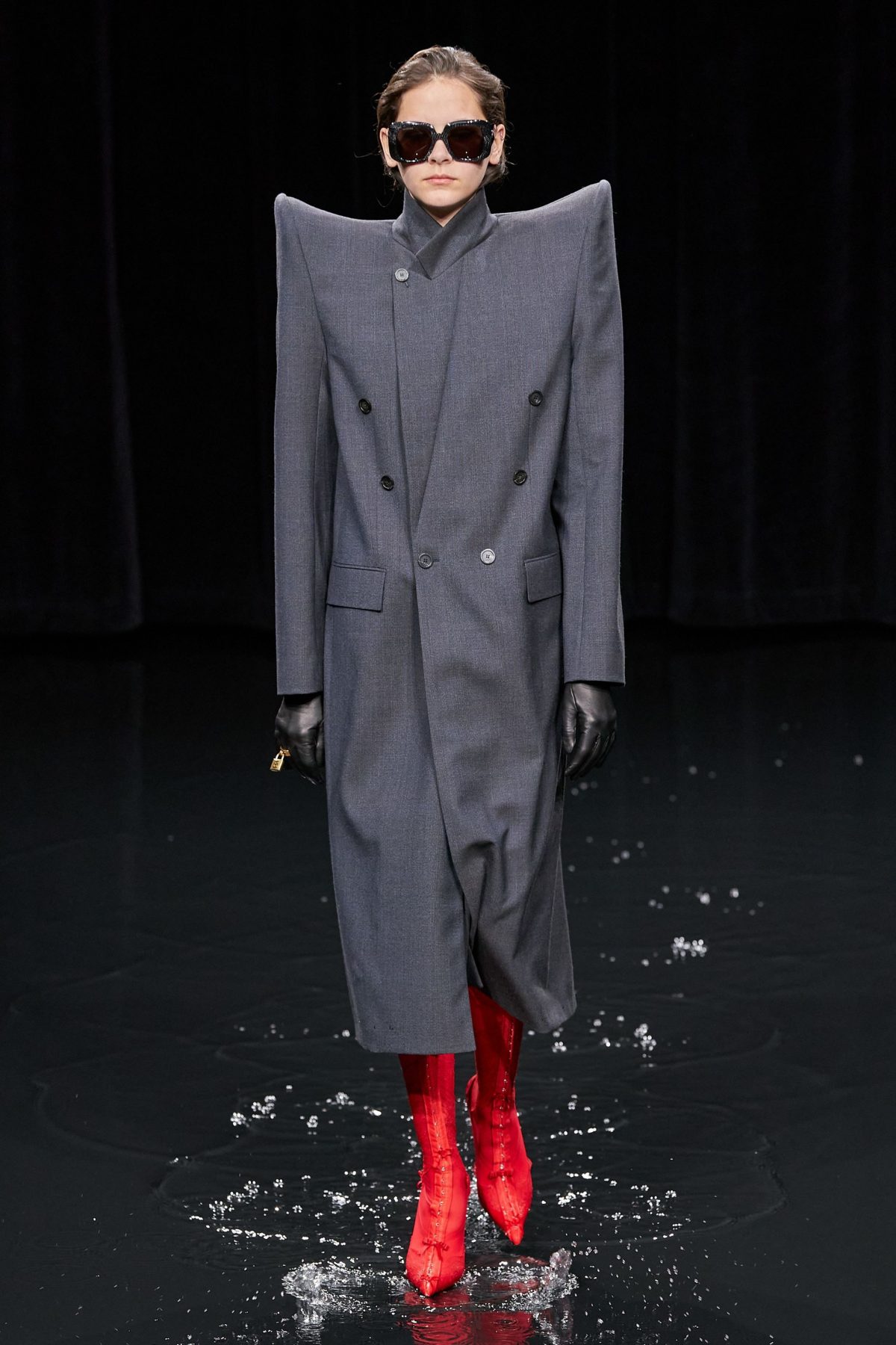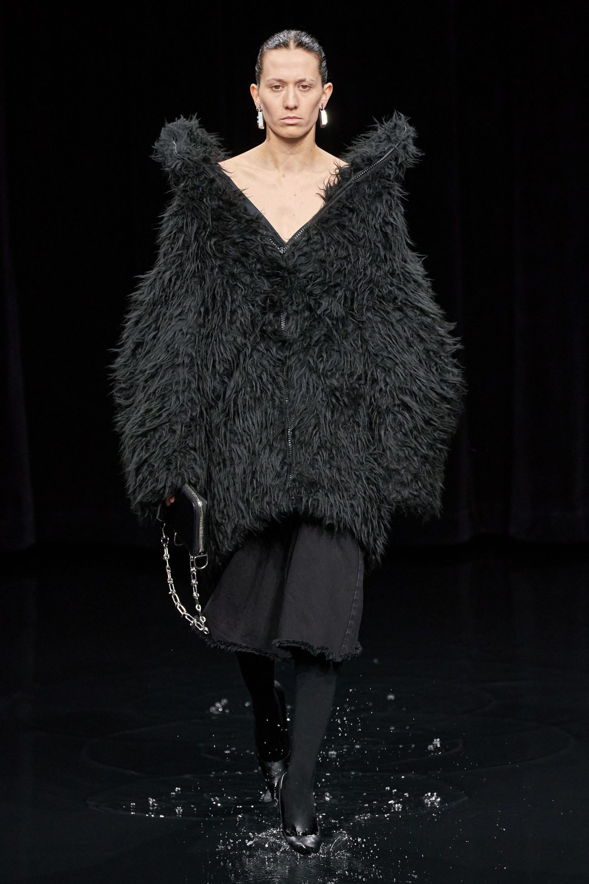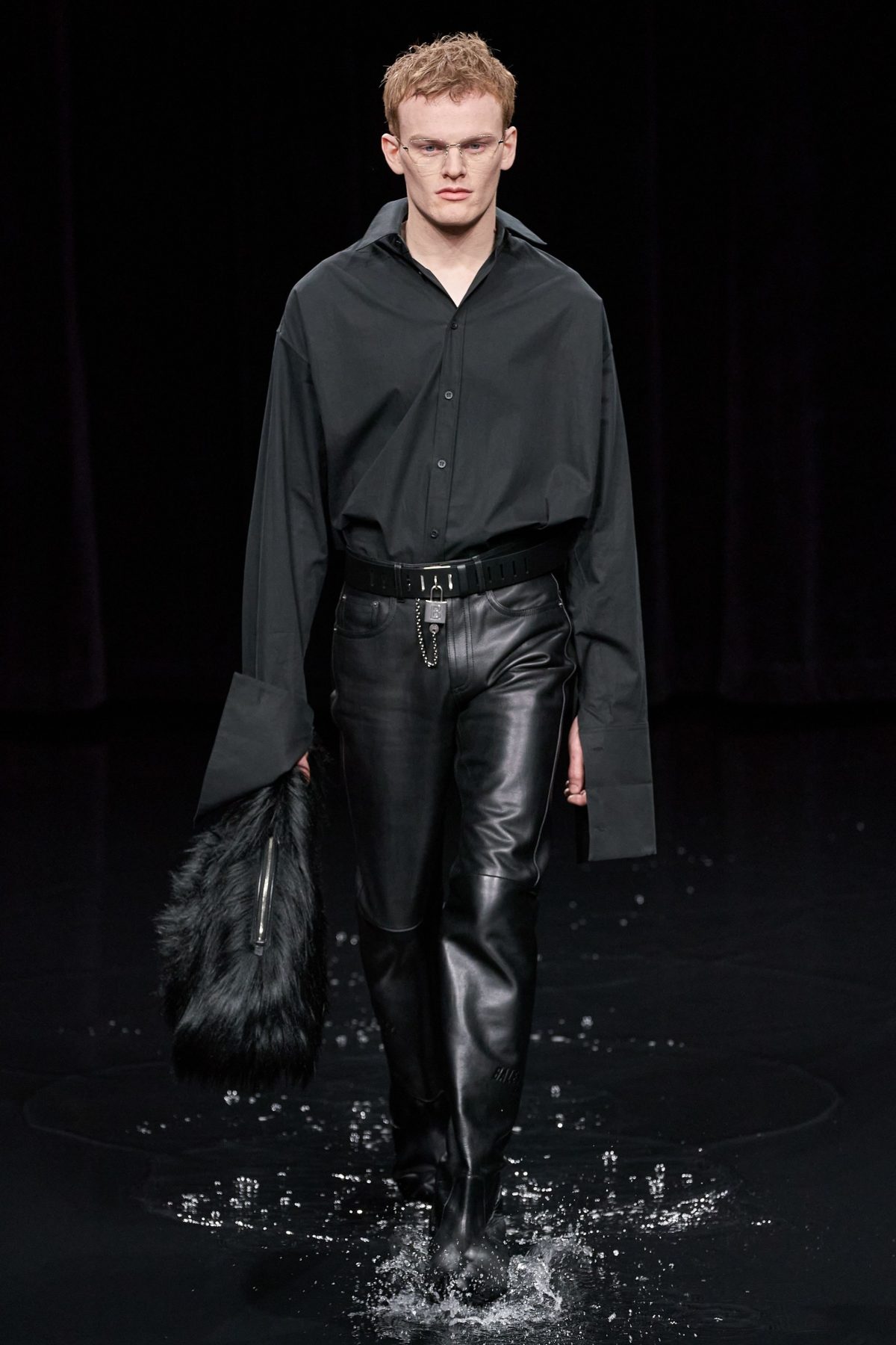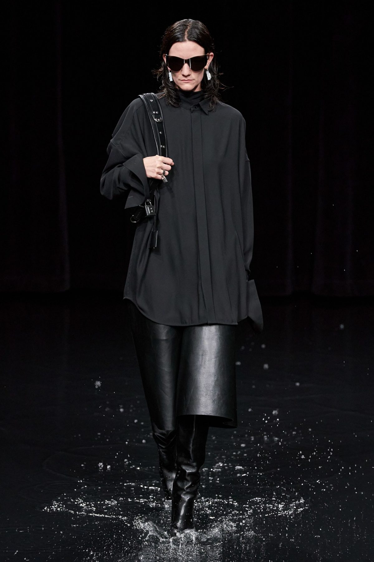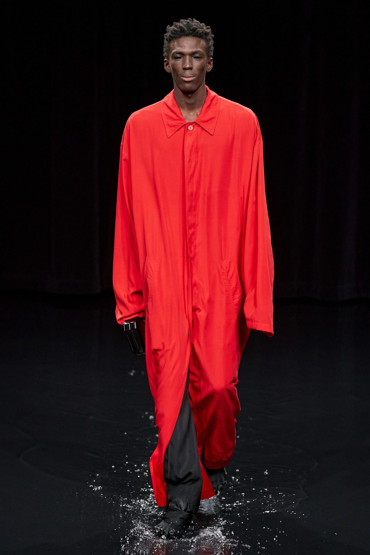 Set in a vast, almost pitch-black auditorium was an immense pool of water disguising the runway, with digital screens above depicting a hellish sky that flashed with lightening, red clouds, satellite shots of Earth, and then finally, a total eclipse. “It’s the blackest show I ever did,” said designer Demna Gvasalia.