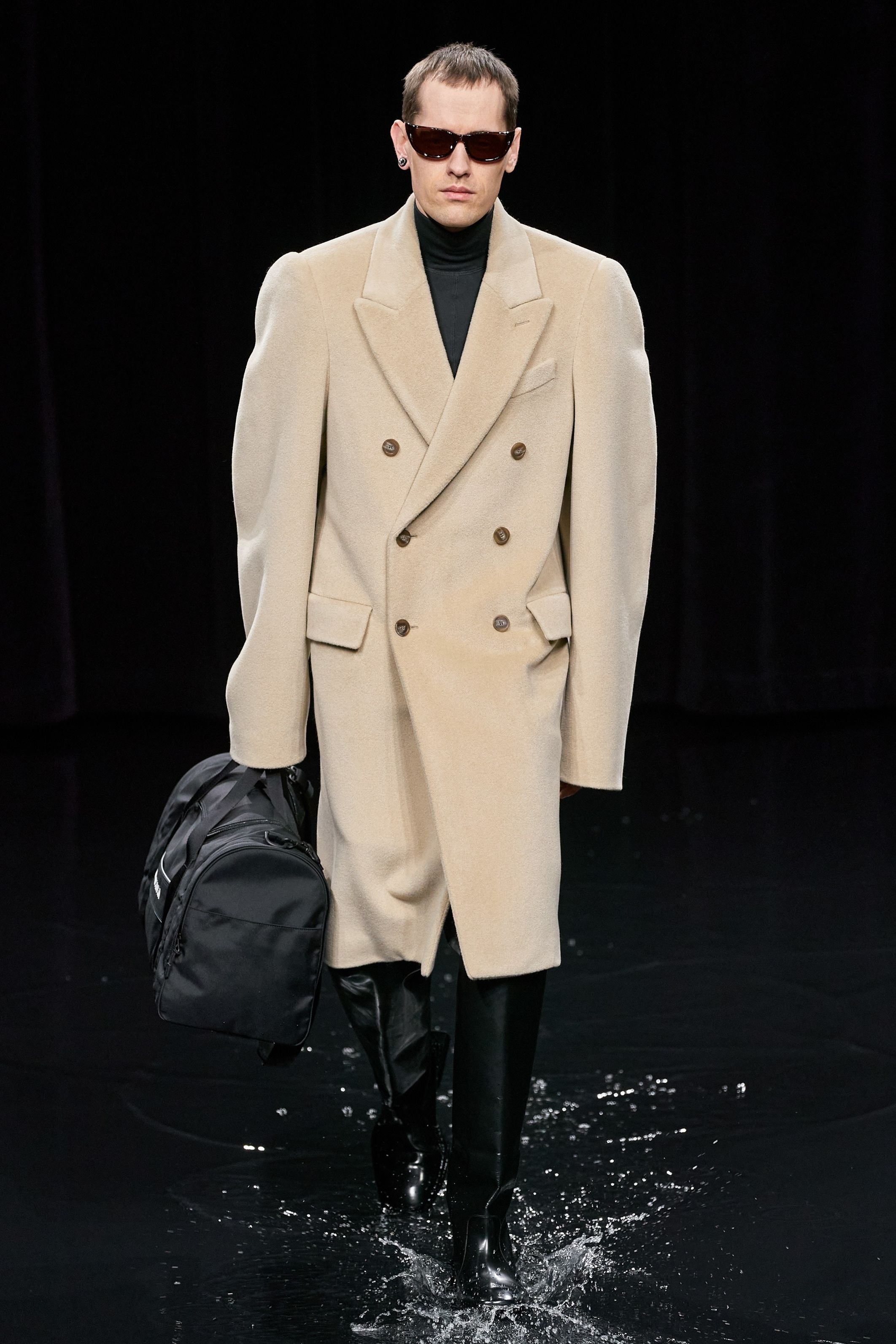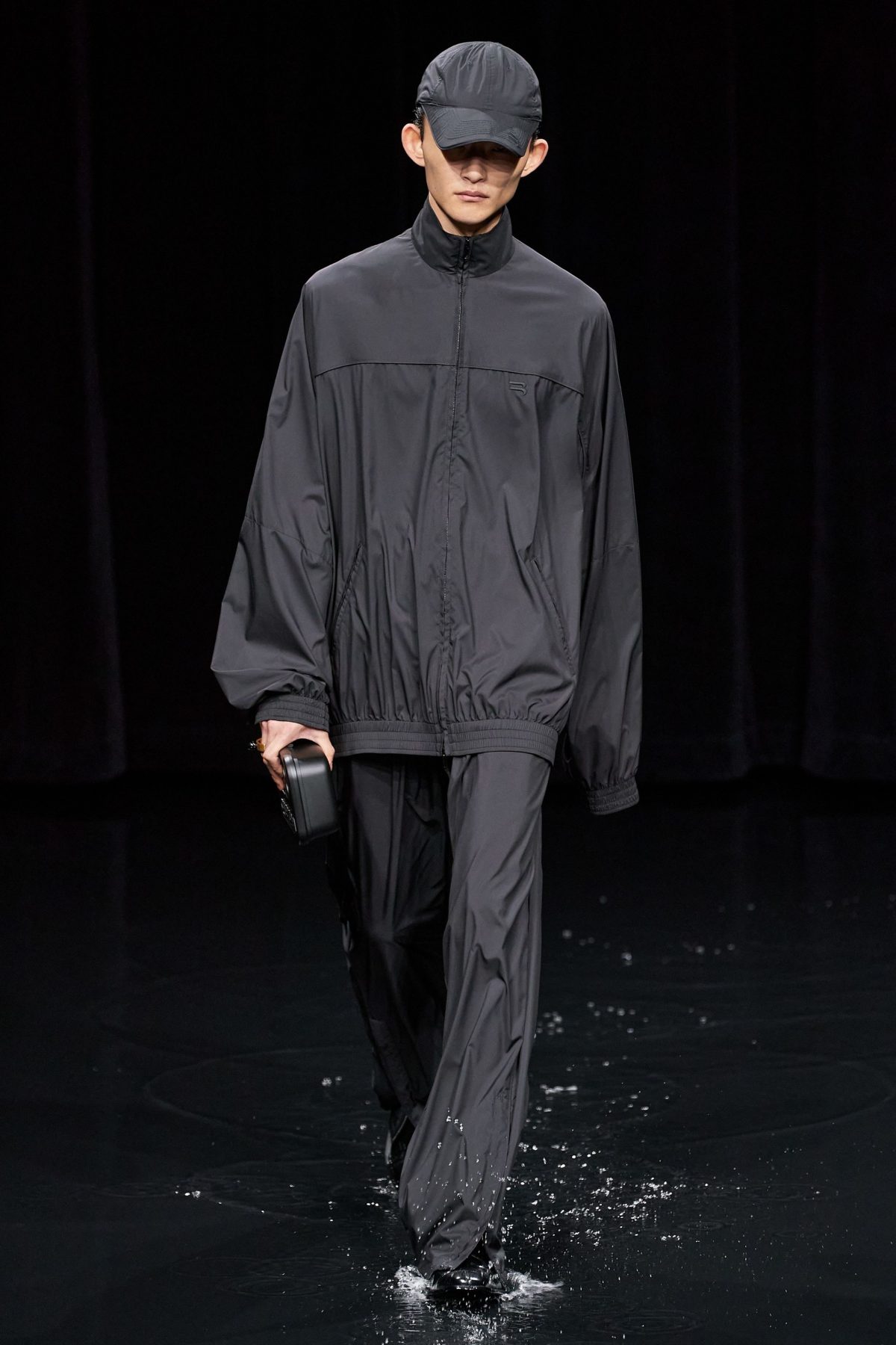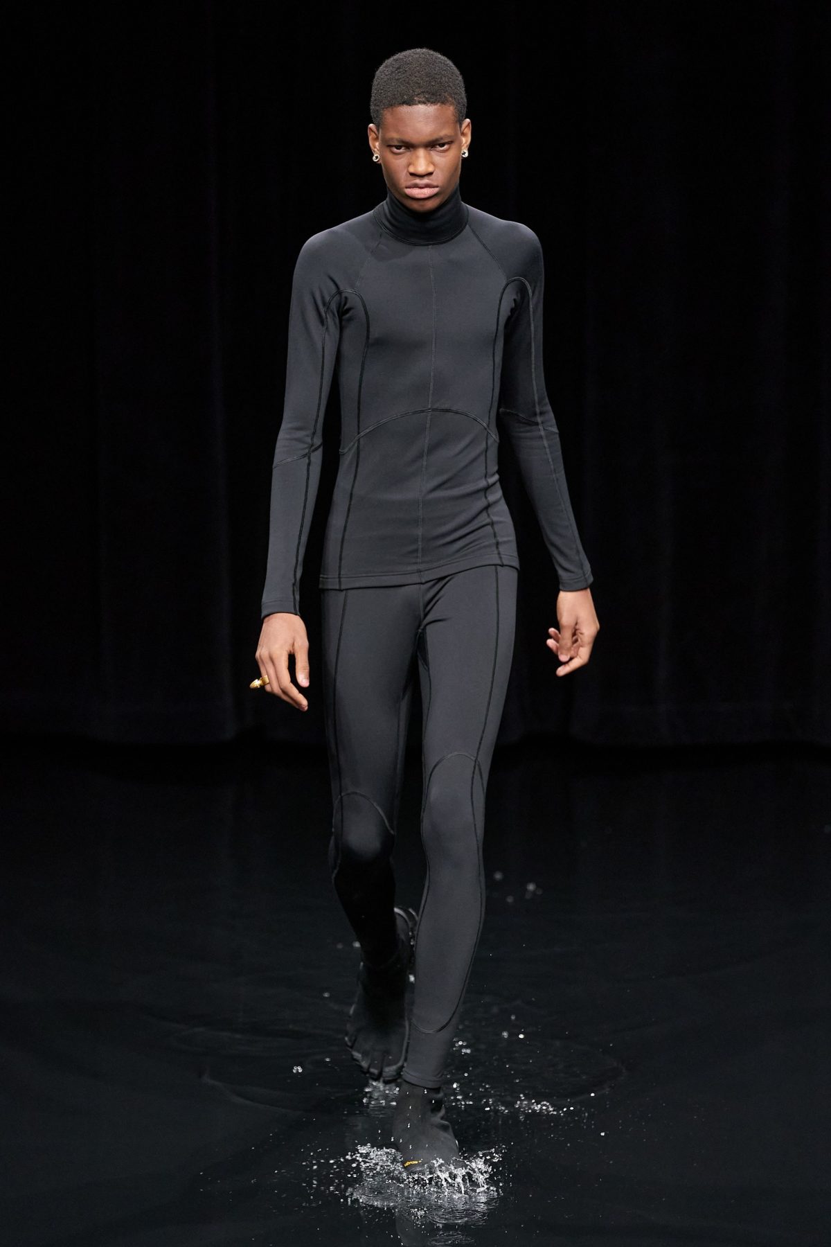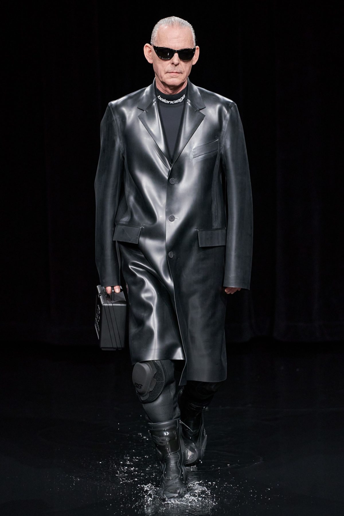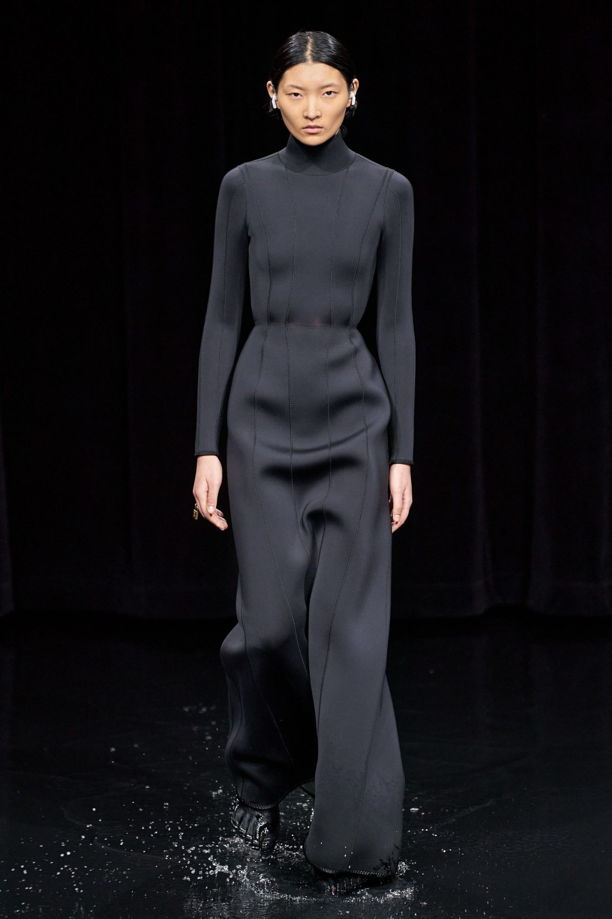 Set in a vast, almost pitch-black auditorium was an immense pool of water disguising the runway, with digital screens above depicting a hellish sky that flashed with lightening, red clouds, satellite shots of Earth, and then finally, a total eclipse. “It’s the blackest show I ever did,” said designer Demna Gvasalia.
