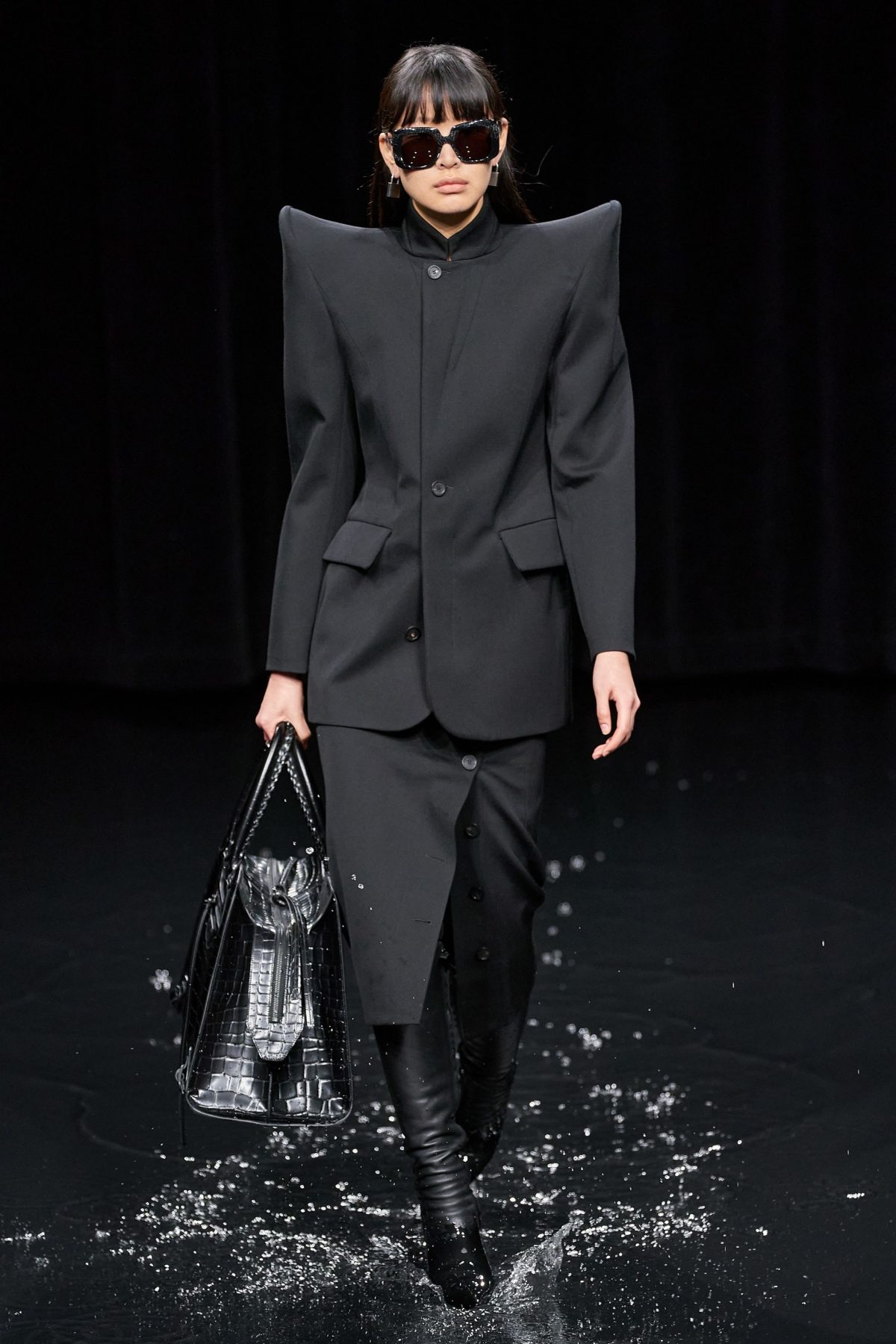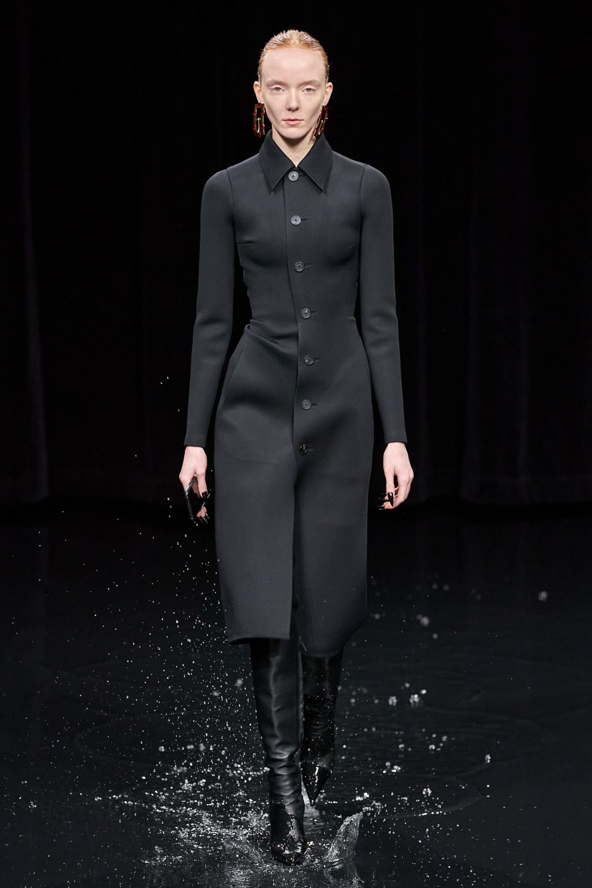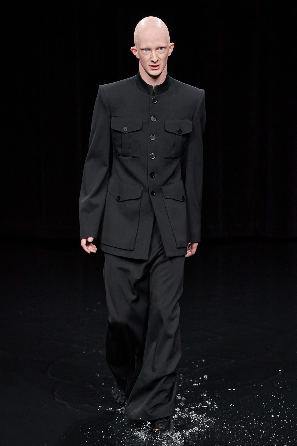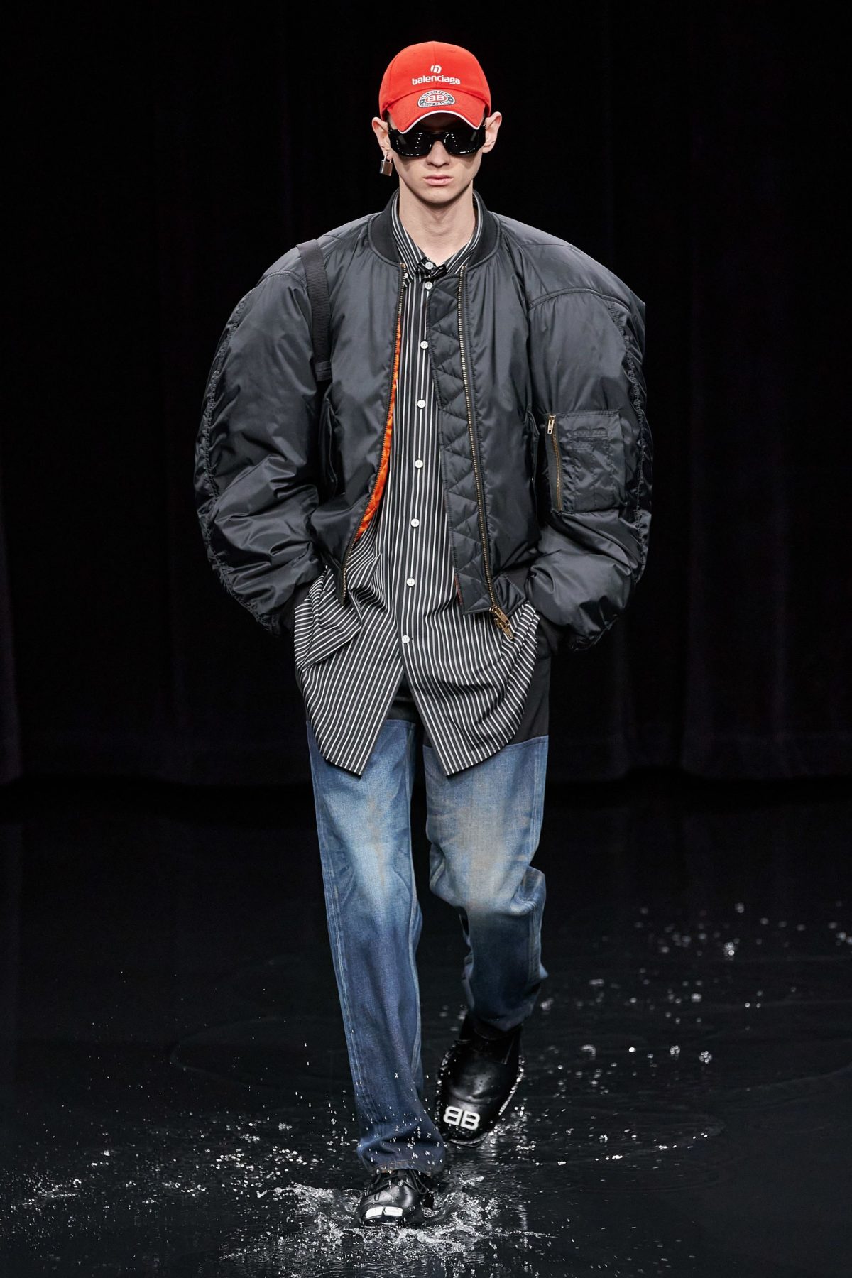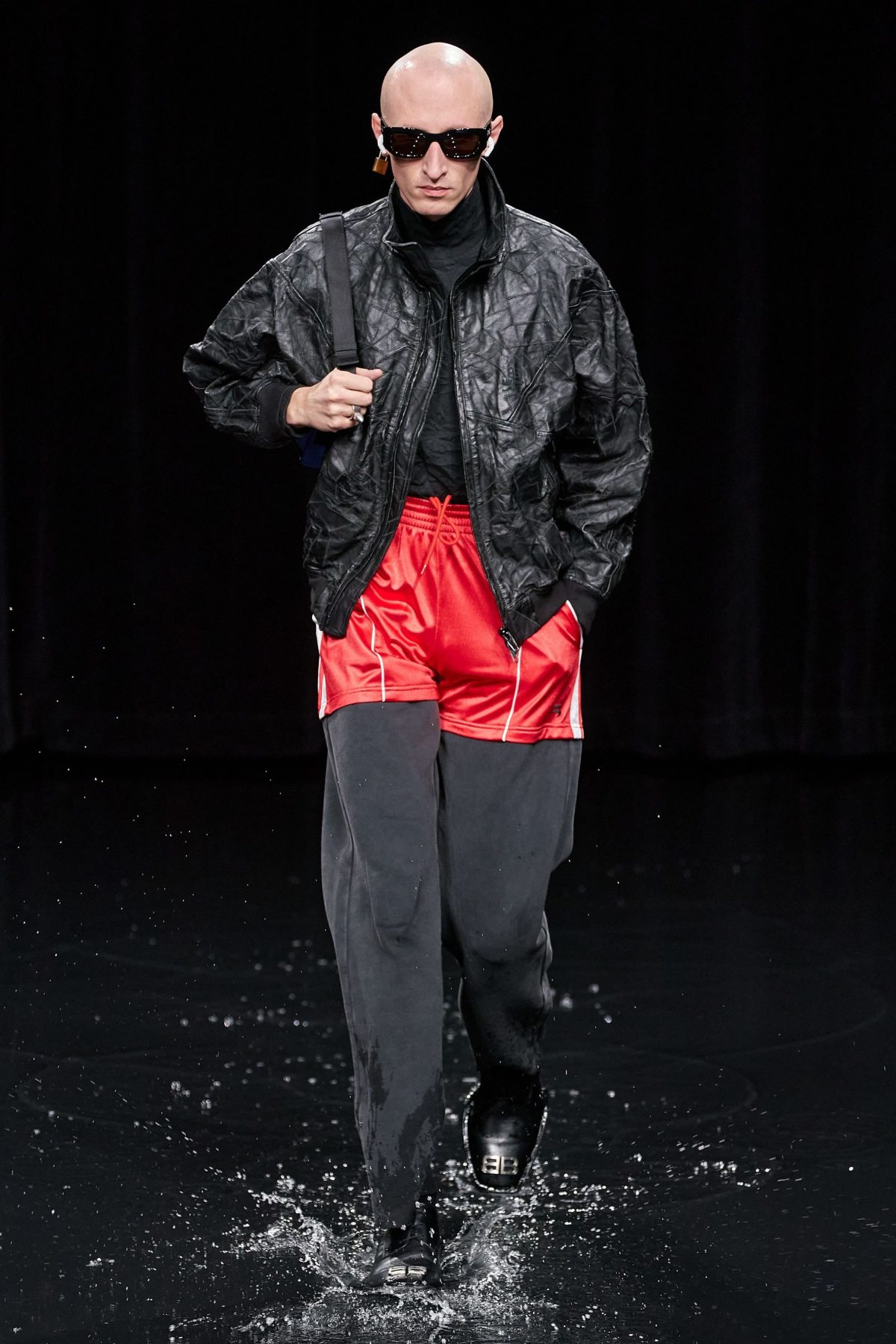 Set in a vast, almost pitch-black auditorium was an immense pool of water disguising the runway, with digital screens above depicting a hellish sky that flashed with lightening, red clouds, satellite shots of Earth, and then finally, a total eclipse. “It’s the blackest show I ever did,” said designer Demna Gvasalia.