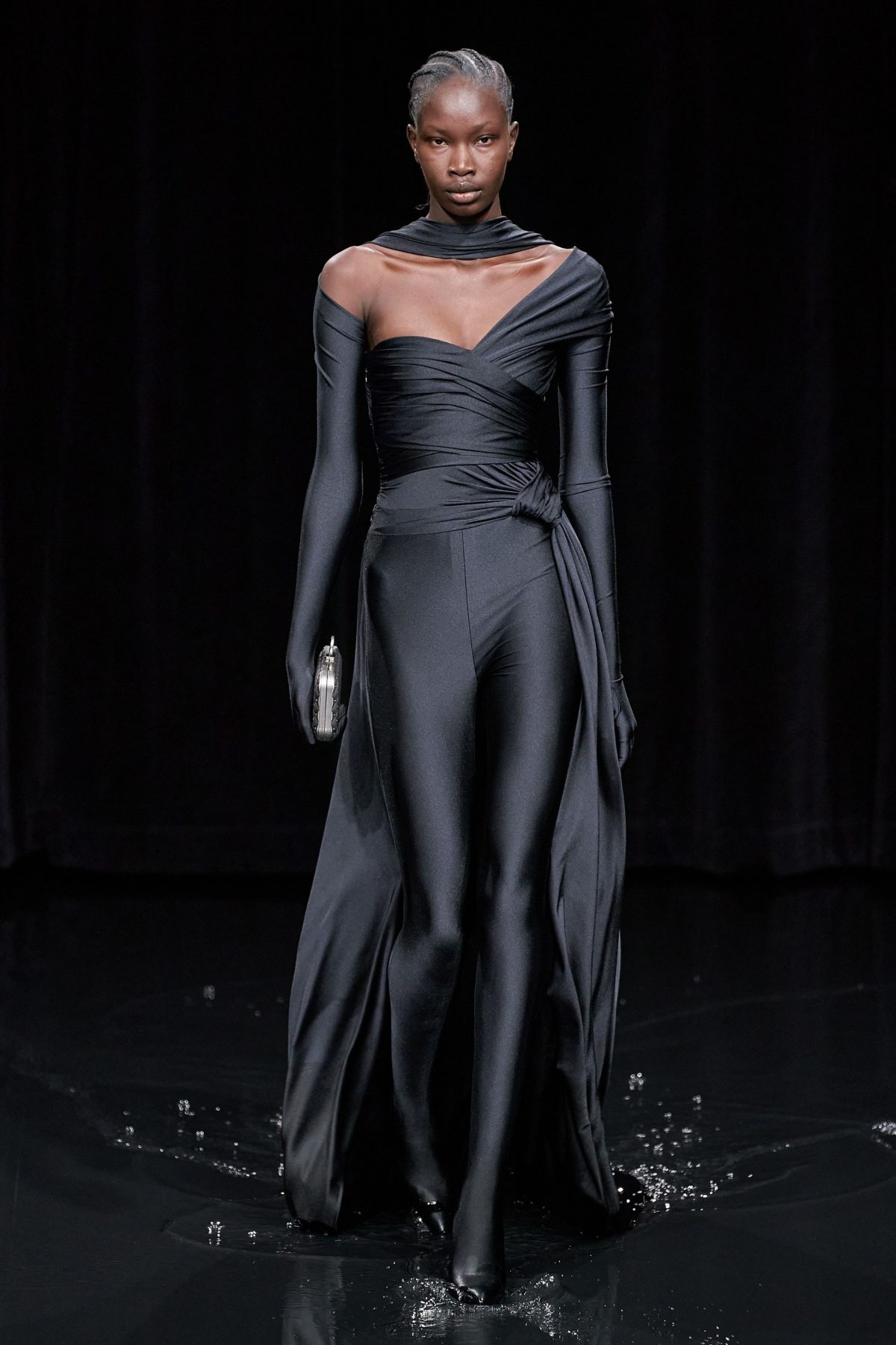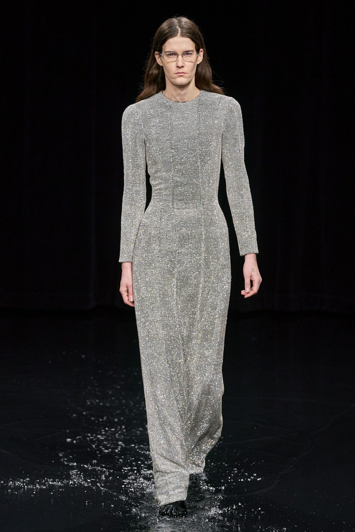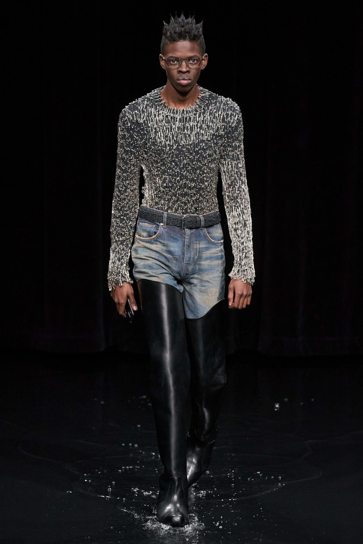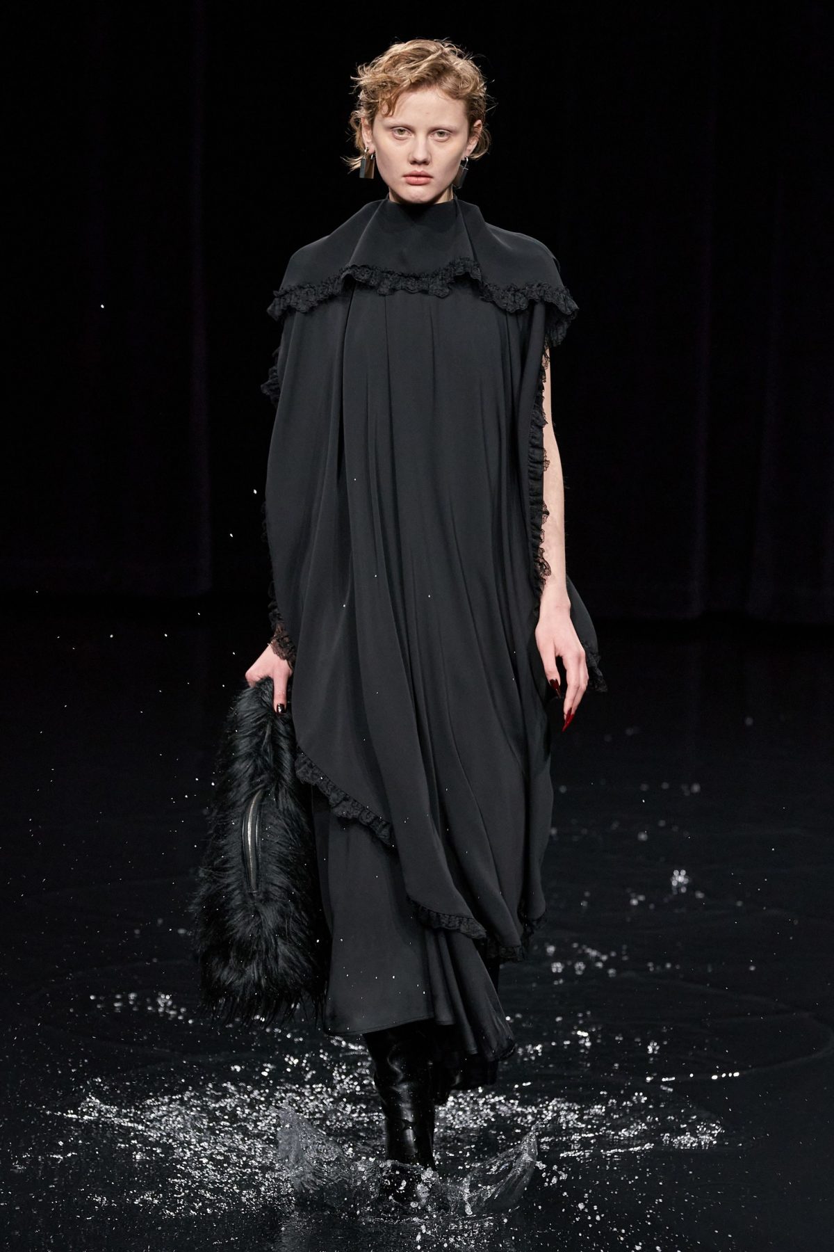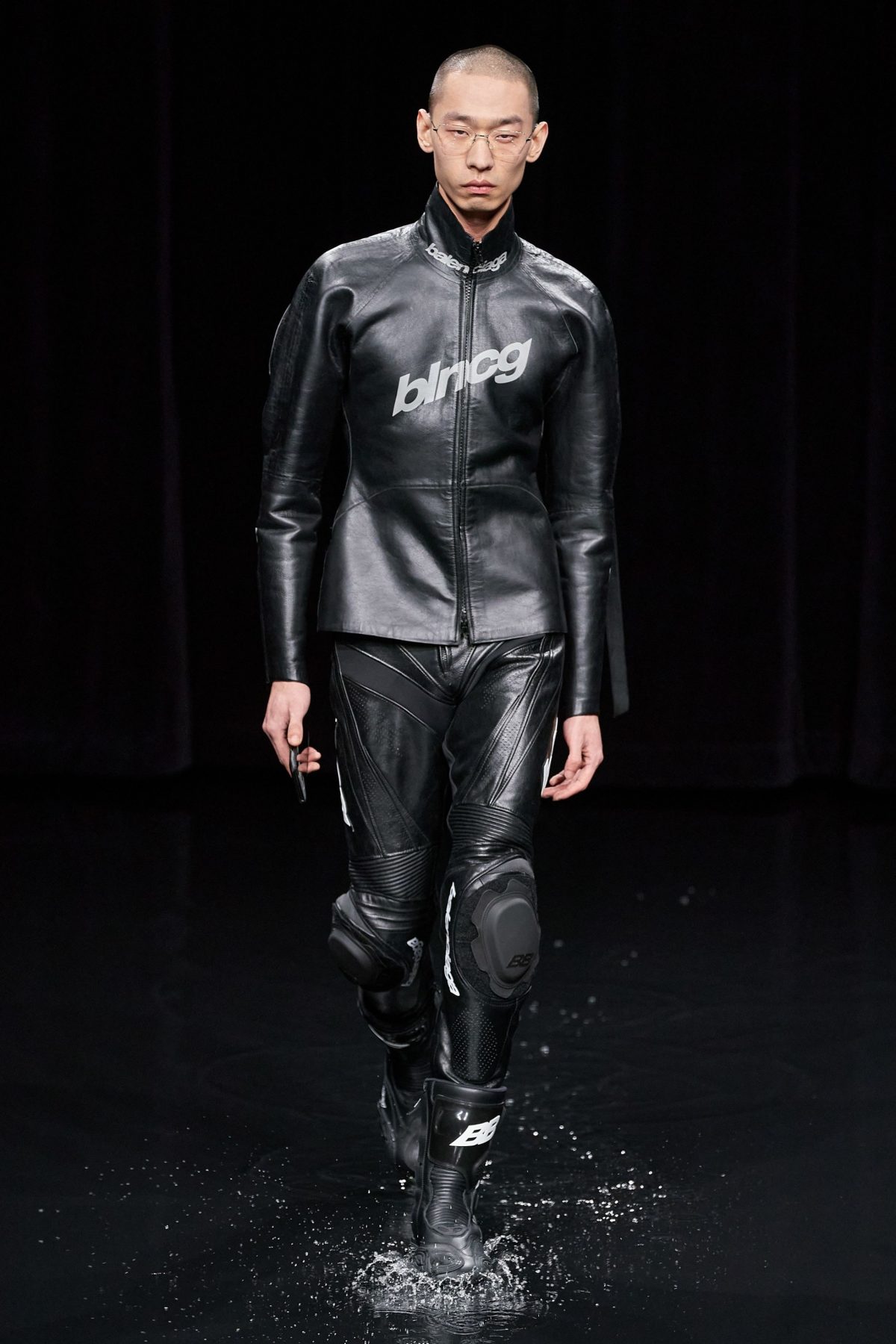Set in a vast, almost pitch-black auditorium was an immense pool of water disguising the runway, with digital screens above depicting a hellish sky that flashed with lightening, red clouds, satellite shots of Earth, and then finally, a total eclipse. “It’s the blackest show I ever did,” said designer Demna Gvasalia.