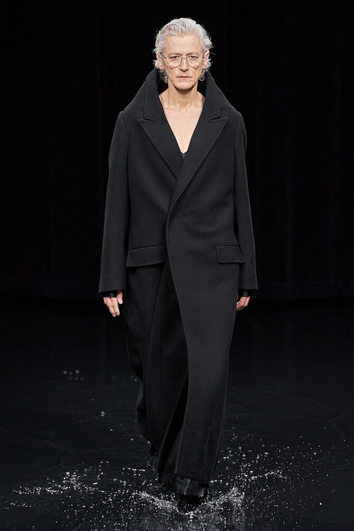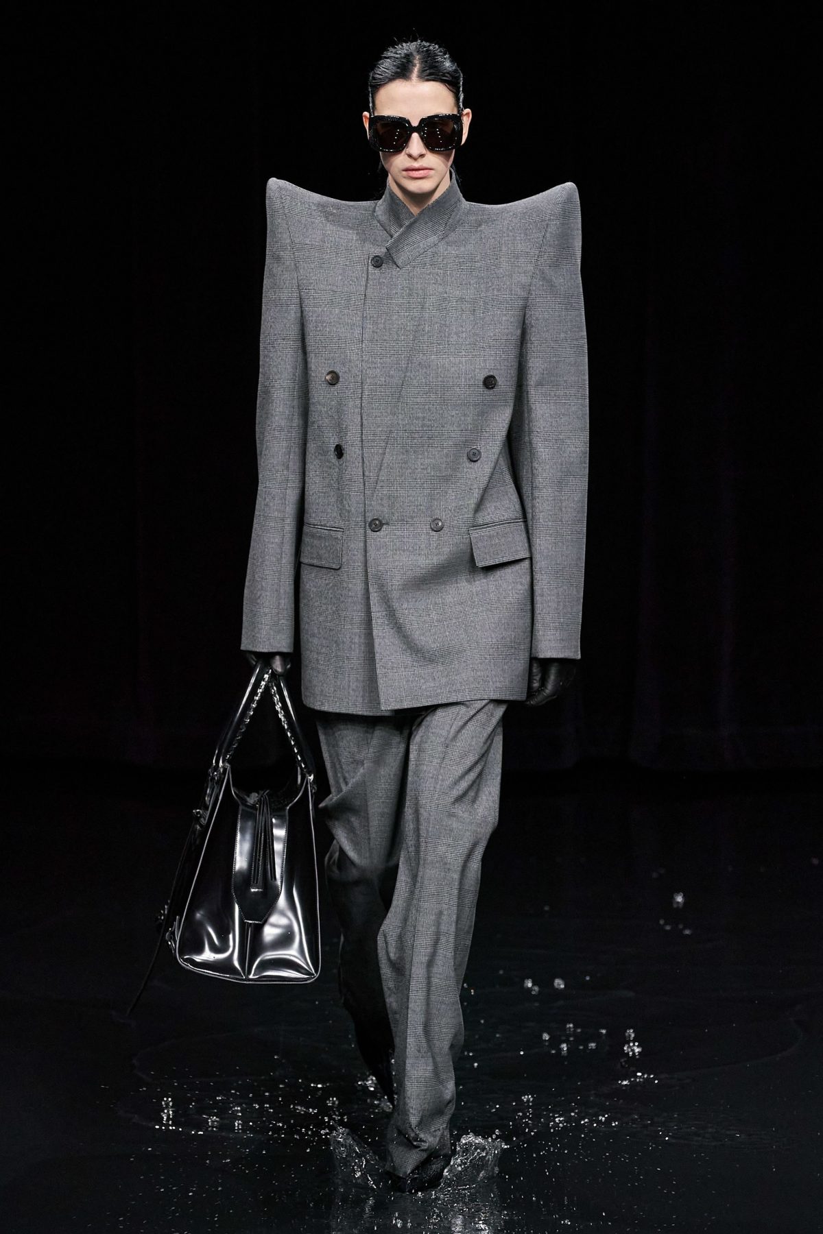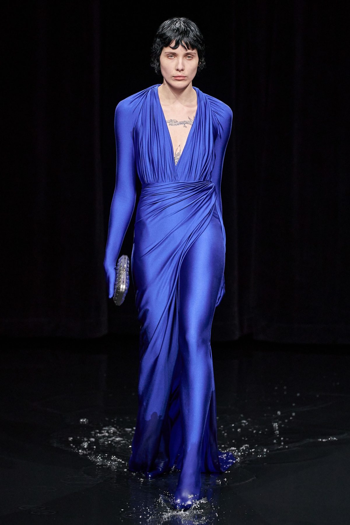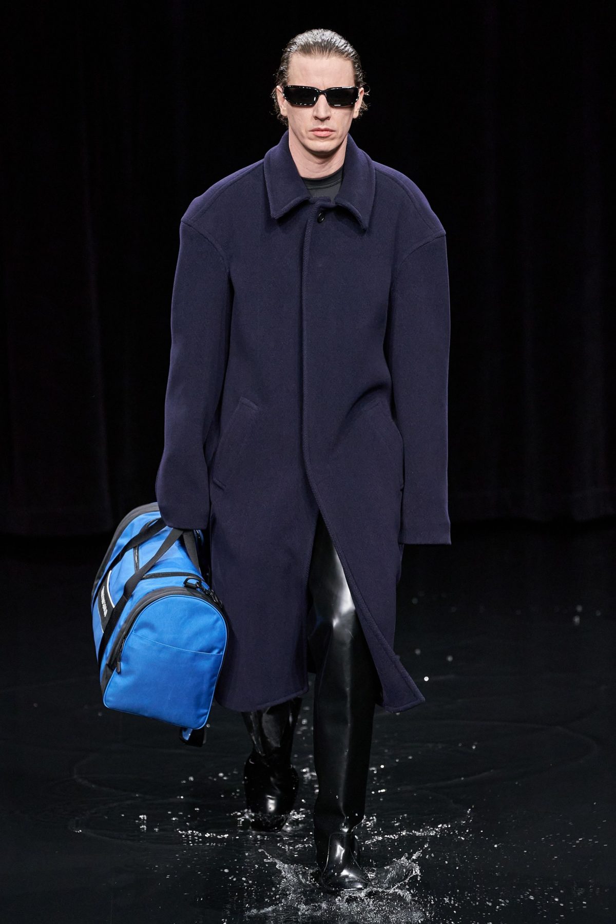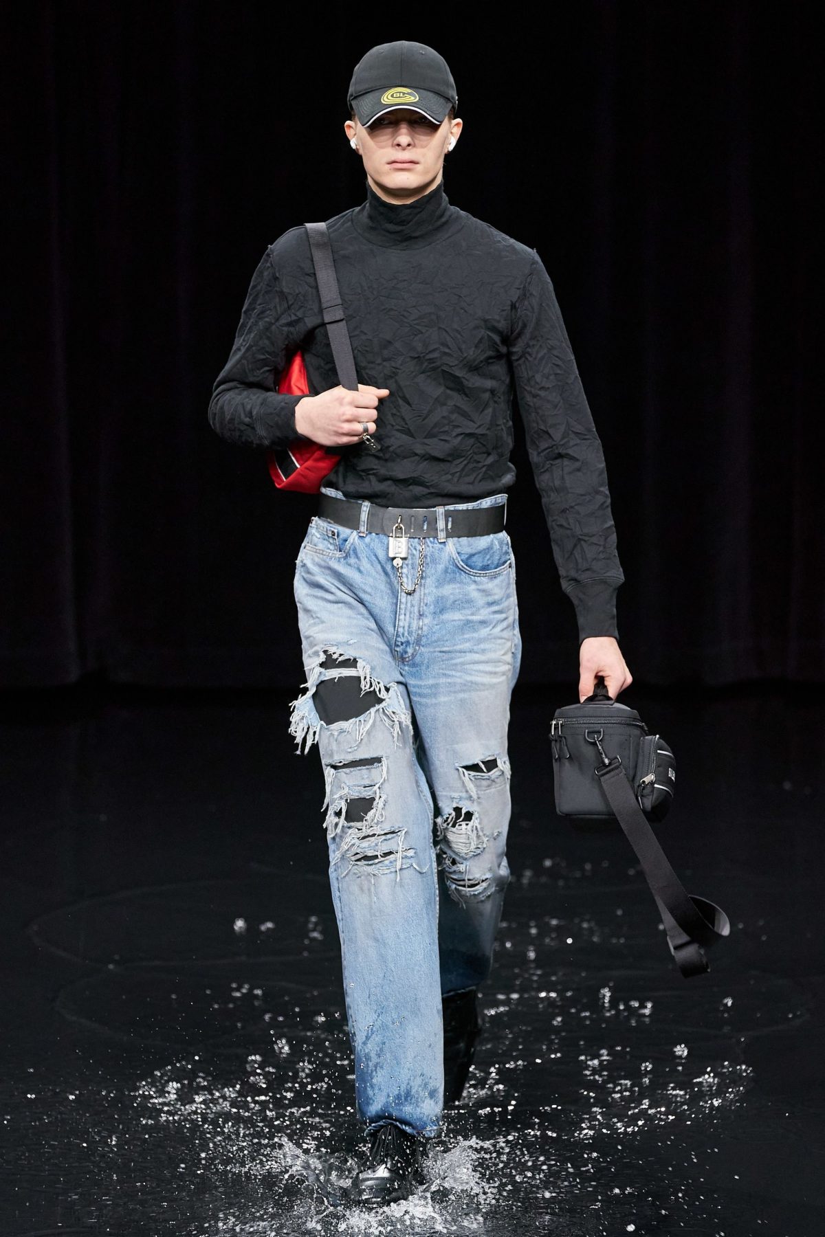 Set in a vast, almost pitch-black auditorium was an immense pool of water disguising the runway, with digital screens above depicting a hellish sky that flashed with lightening, red clouds, satellite shots of Earth, and then finally, a total eclipse. “It’s the blackest show I ever did,” said designer Demna Gvasalia.